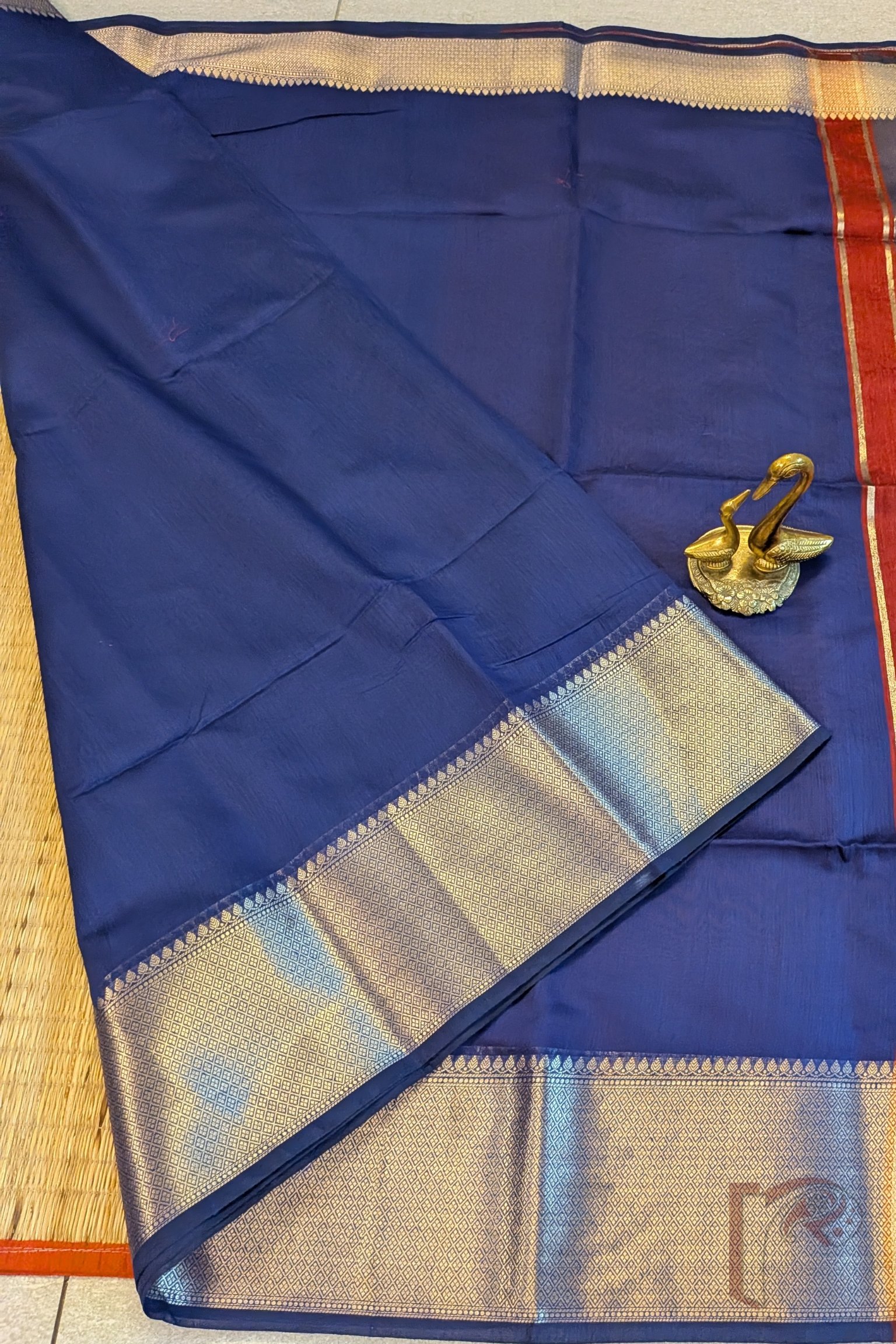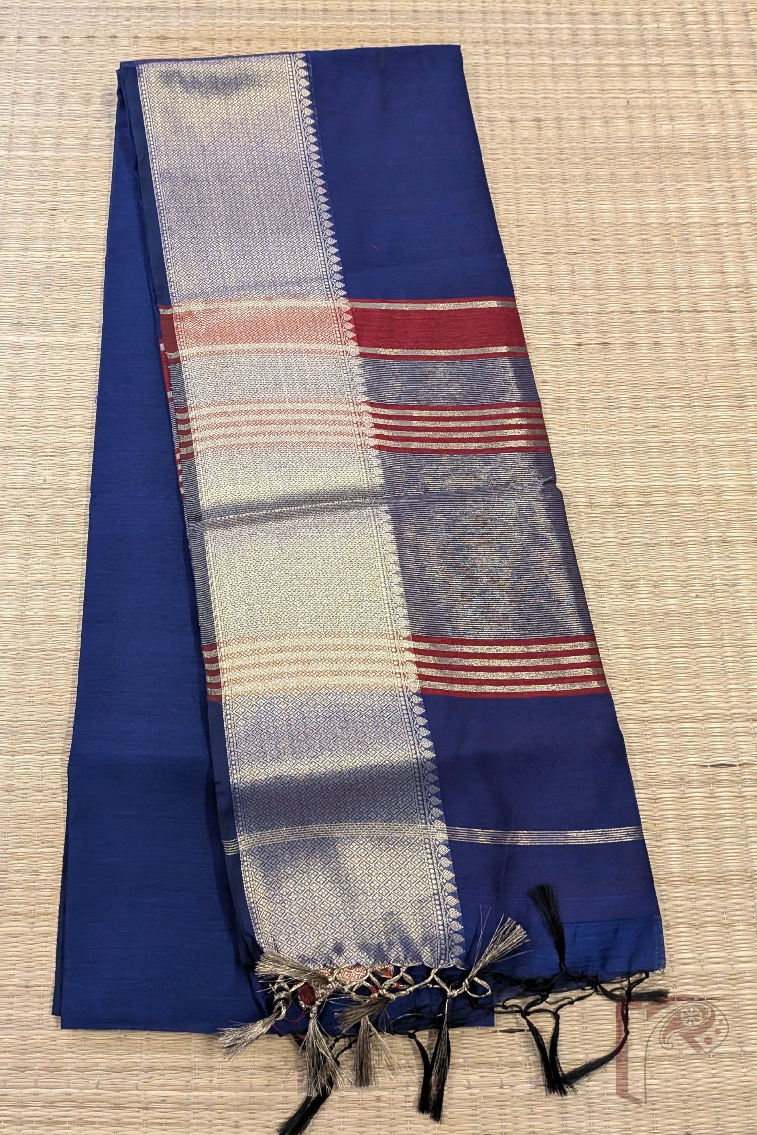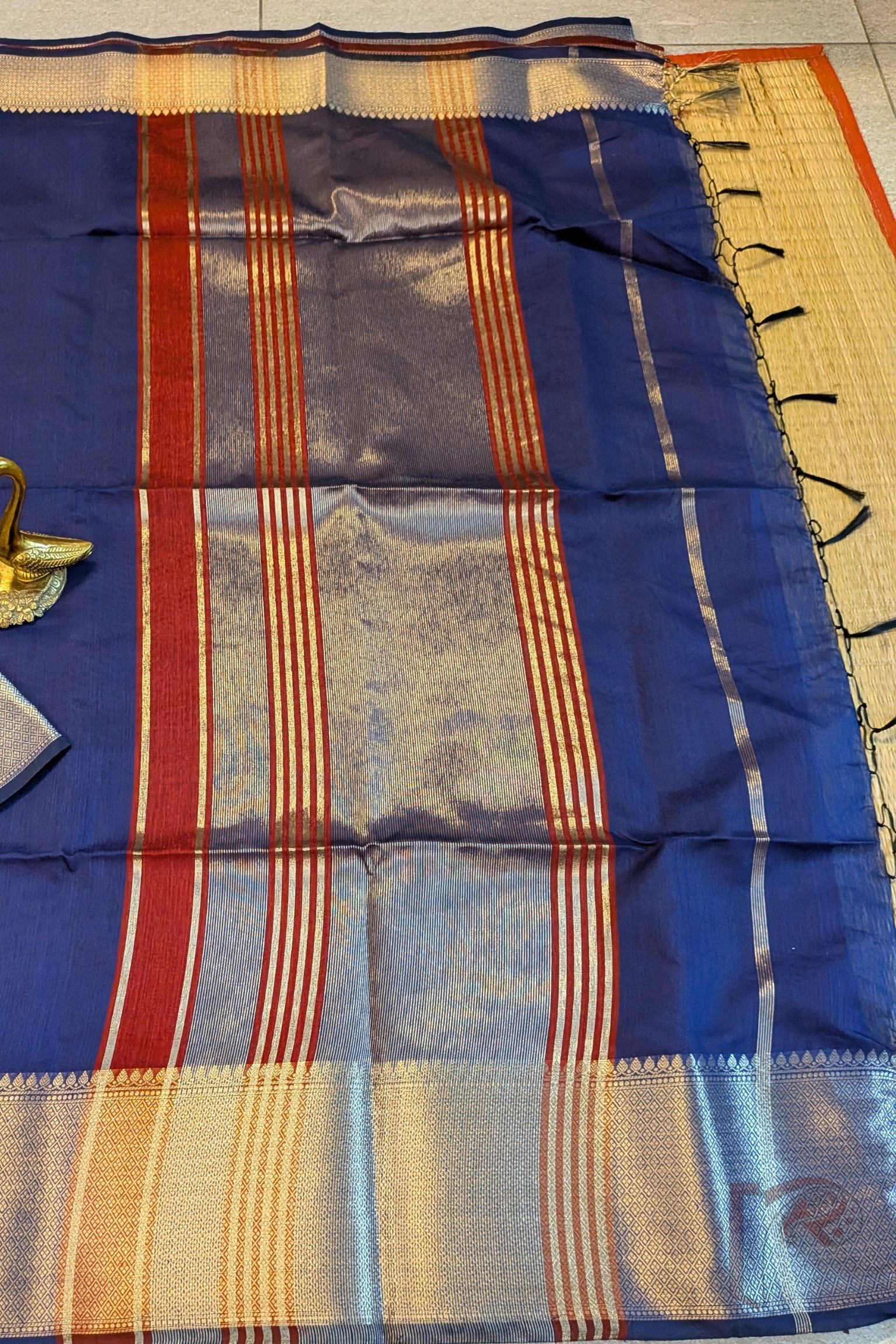 Banarasi Bloom: Ink Blue Cotton Silk Saree with Dull Gold Woven Border, Gold-Maroon Stripes and Contrast Maroon Blouse