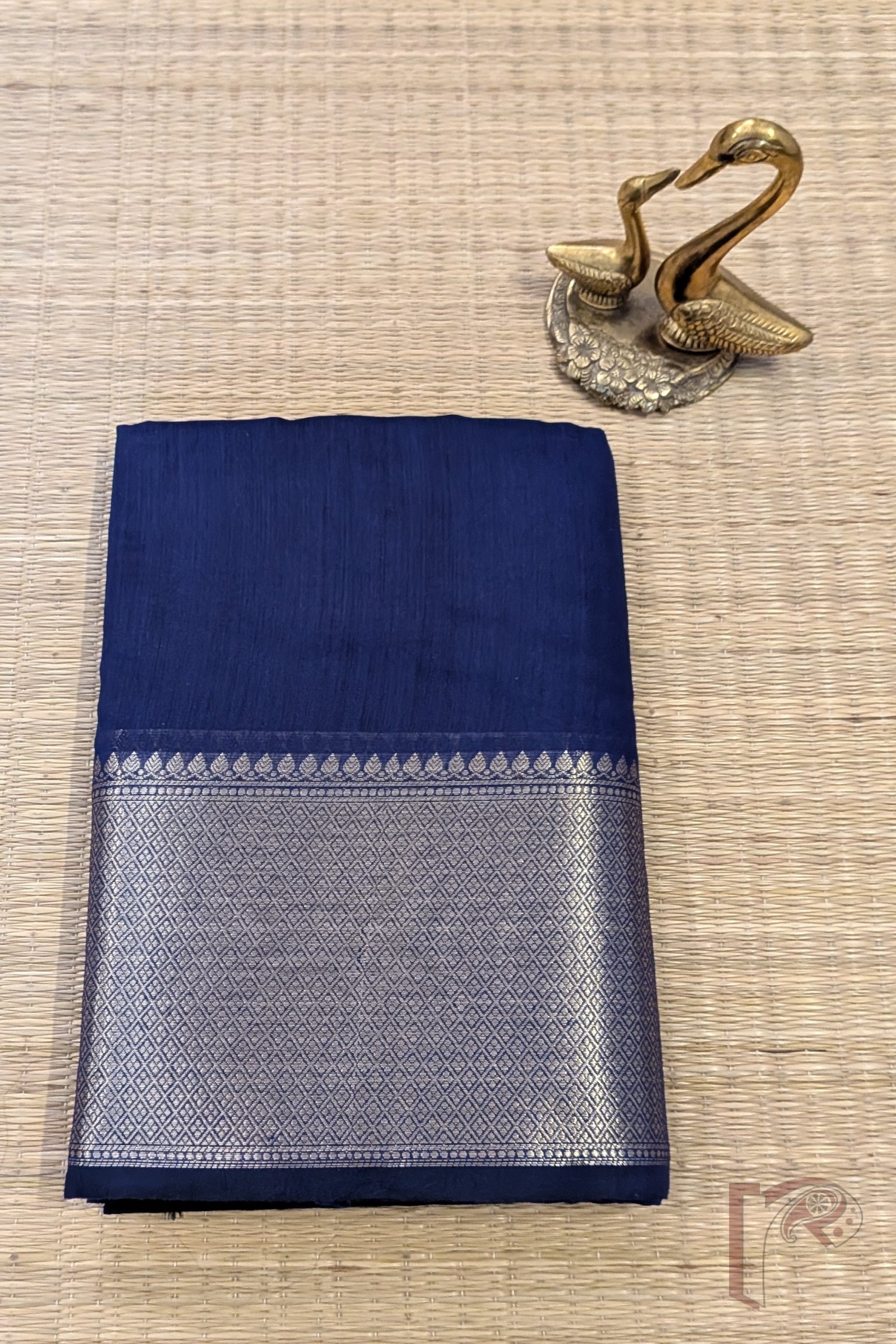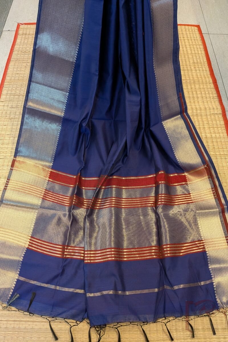 This ink blue cotton silk saree embodies depth and sophistication, beautifully complemented by a dull gold woven border that lends a subtle glow. Designed with a 6-inch lower border and a 3-inch upper border, it creates a harmonious balance along the drape. The body showcases a gold stripe pattern interspersed with maroon, adding warmth and contrast to the deep blue base. Paired with a contrast maroon blouse, the ensemble achieves a striking blend of boldness and elegance. Crafted in soft cotton silk, this saree drapes effortlessly while offering a gentle sheen, making it perfect for festive evenings, cultural gatherings, or formal occasions. A piece that reflects classic grandeur with a touch of contemporary style.