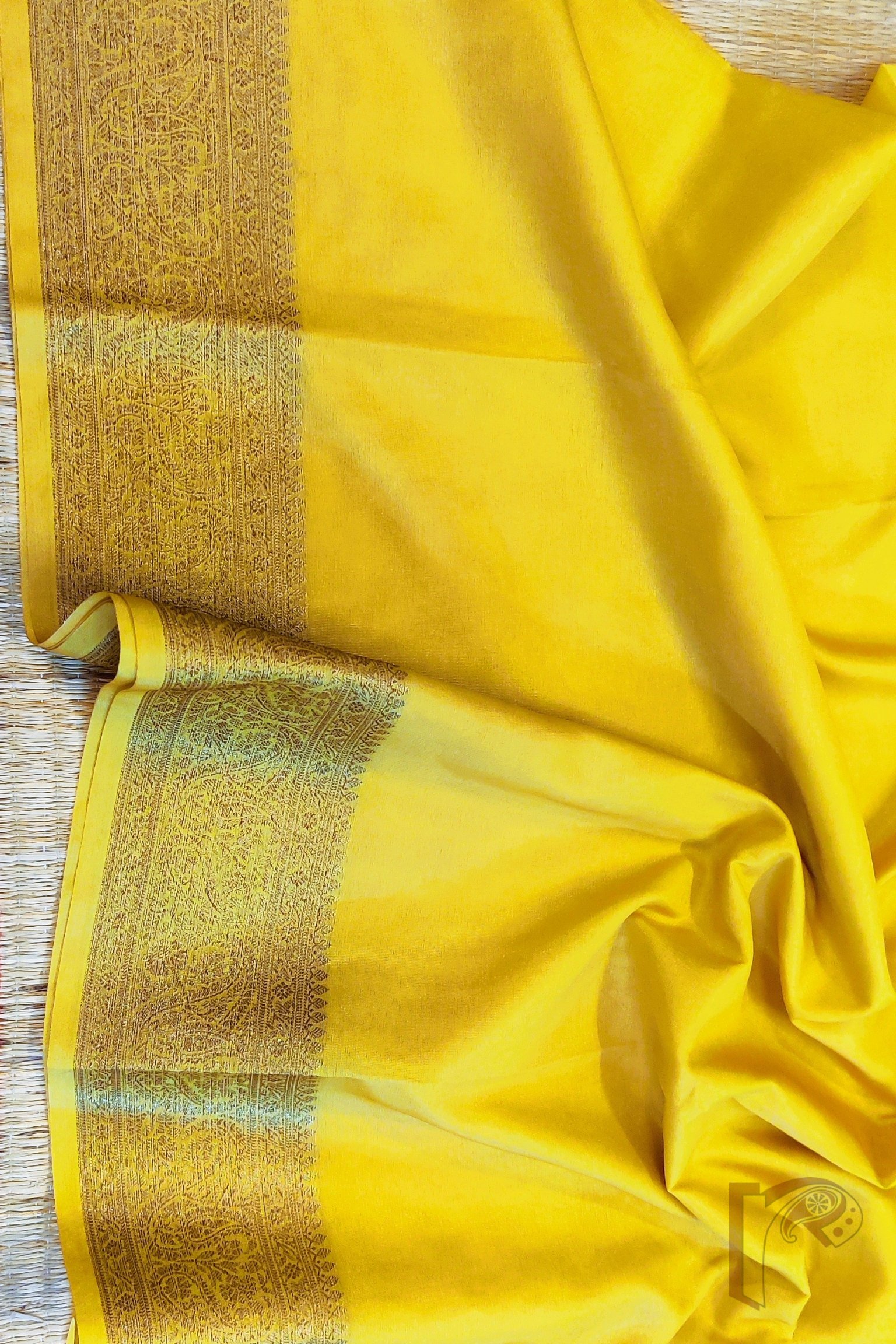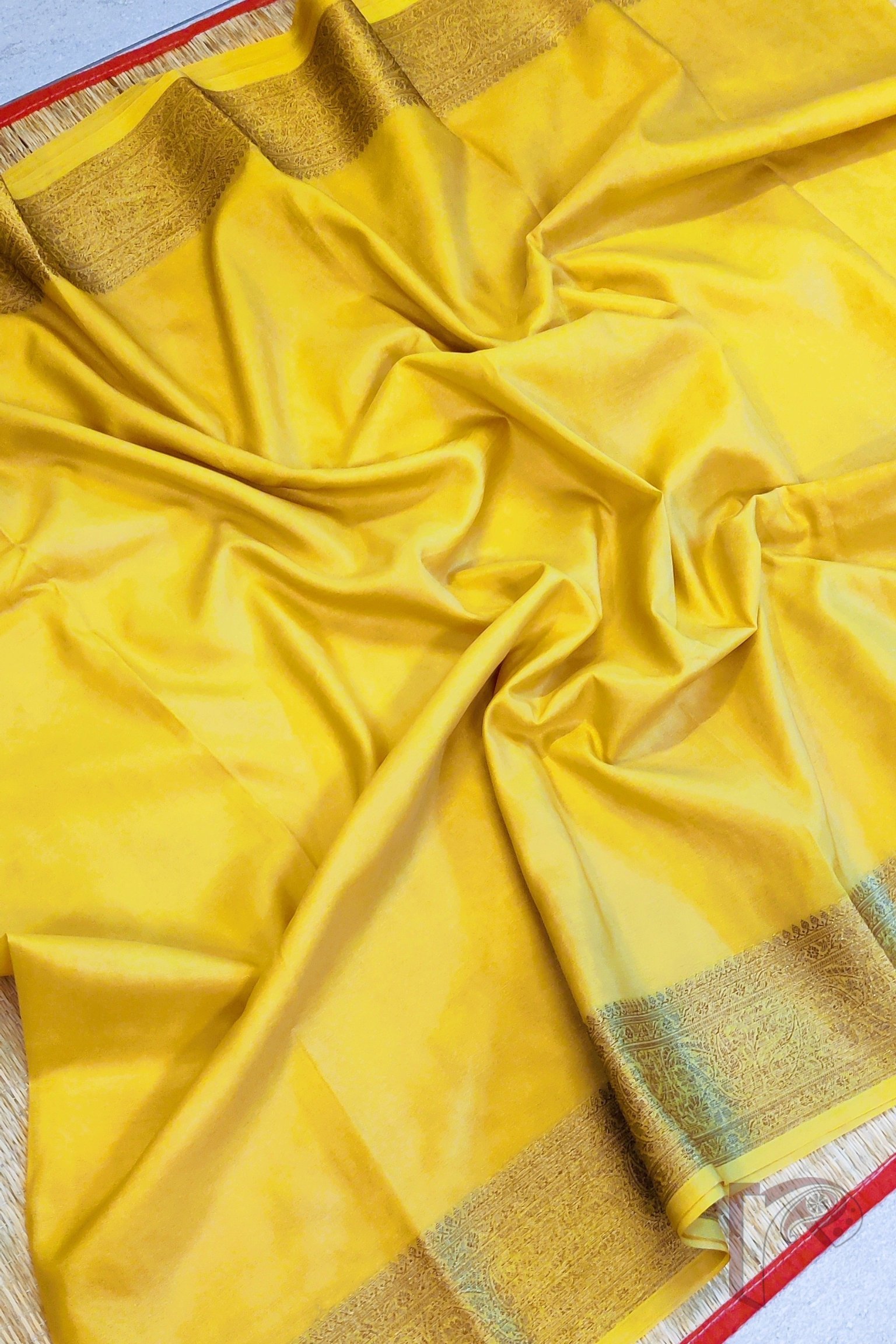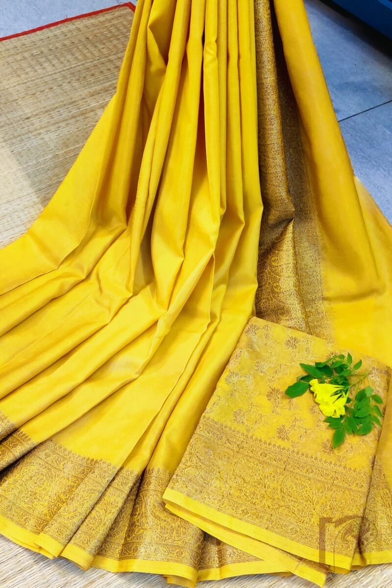 Bright, refreshing, and exquisitely traditional, this lemon yellow Khadi Silk saree stands out with its radiant charm and luxurious detailing. The highlight of the saree is its exquisite 4-inch Karwa Banarasi weave border crafted in muted gold, running gracefully along all sides and extending onto the richly woven pallu. The body glows in a soft lemon hue that beautifully complements the subtle sheen of the Banarasi craftsmanship, making it both vibrant and sophisticated. The saree comes with a matching lemon yellow blouse featuring an all-over Karwa Banarasi weave, adding depth and richness to the ensemble. Light in drape yet opulent in appearance, this saree is perfect for daytime festivities, traditional occasions, and elegant celebrations, offering a harmonious blend of freshness, heritage, and timeless beauty.