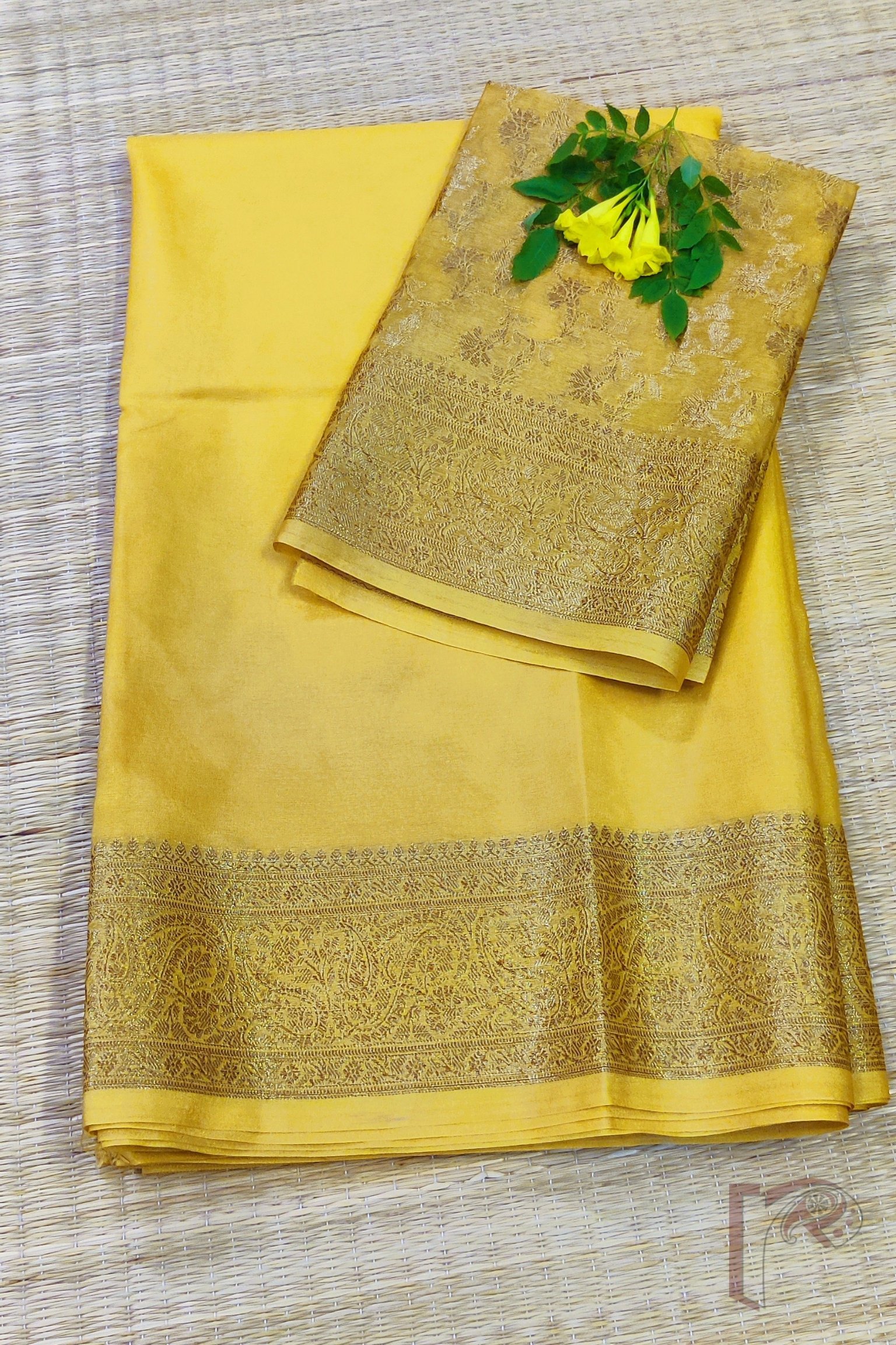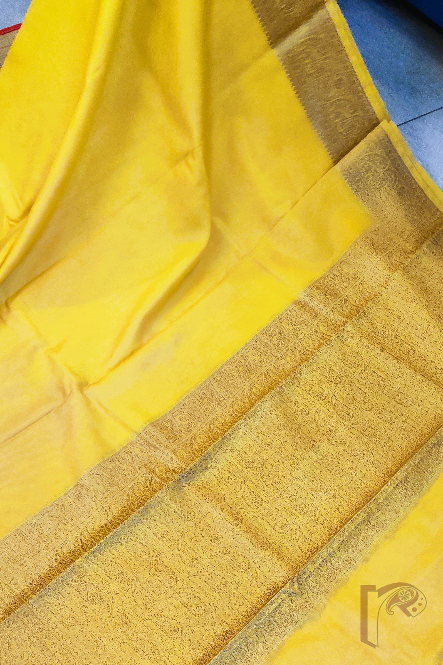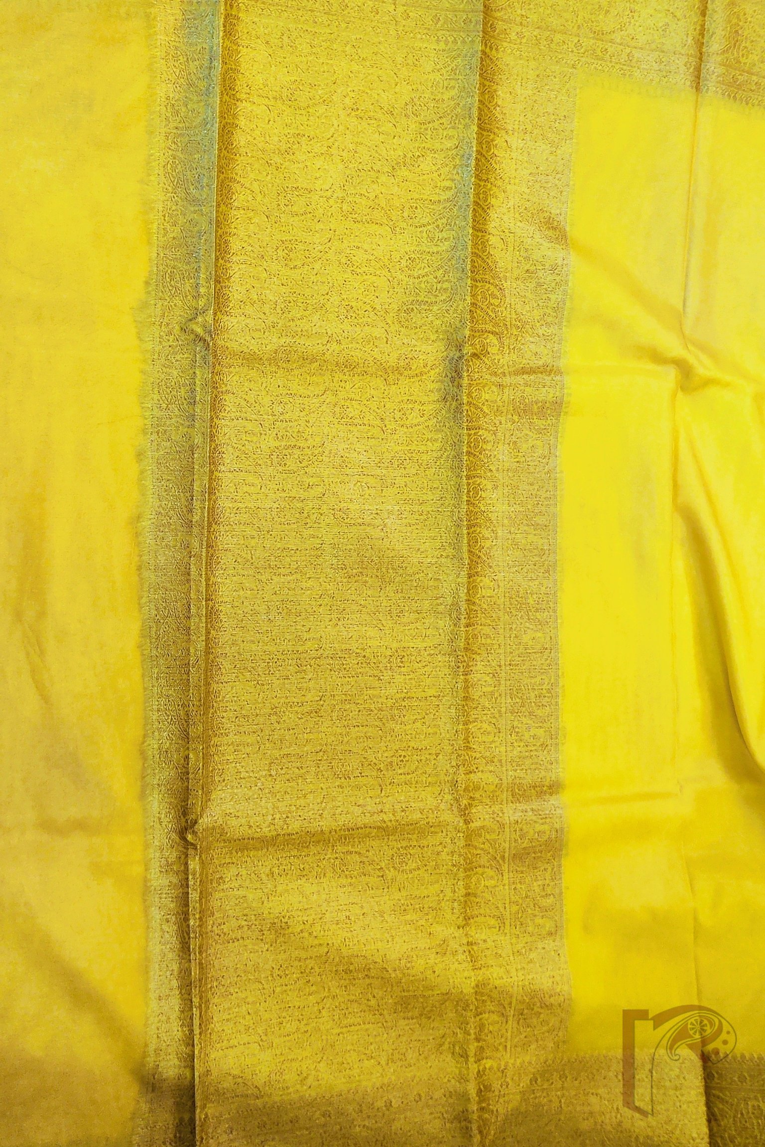 Bright, refreshing, and exquisitely traditional, this lemon yellow Khadi Silk saree stands out with its radiant charm and luxurious detailing. The highlight of the saree is its exquisite 4-inch Karwa Banarasi weave border crafted in muted gold, running gracefully along all sides and extending onto the richly woven pallu. The body glows in a soft lemon hue that beautifully complements the subtle sheen of the Banarasi craftsmanship, making it both vibrant and sophisticated. The saree comes with a matching lemon yellow blouse featuring an all-over Karwa Banarasi weave, adding depth and richness to the ensemble. Light in drape yet opulent in appearance, this saree is perfect for daytime festivities, traditional occasions, and elegant celebrations, offering a harmonious blend of freshness, heritage, and timeless beauty.