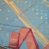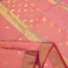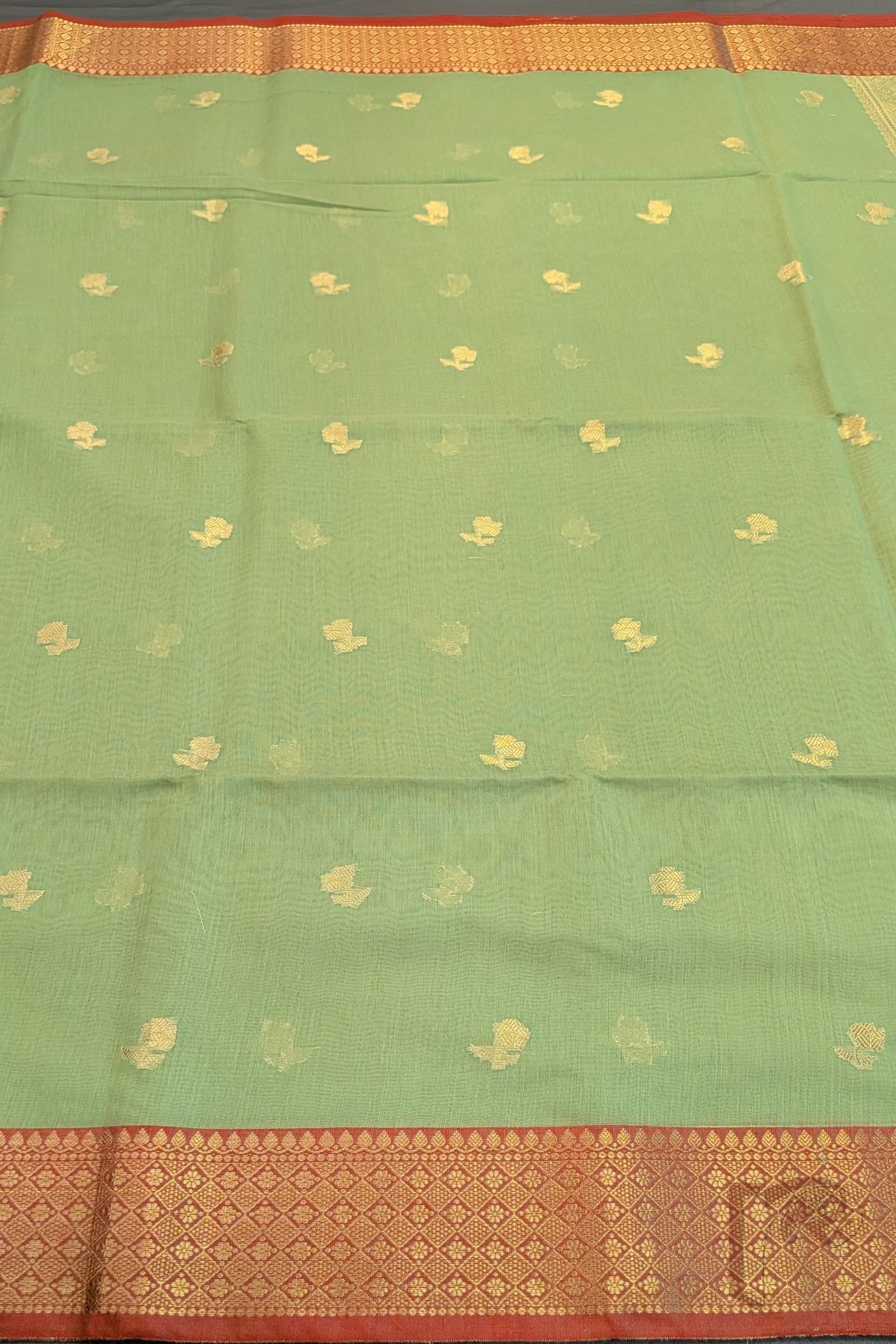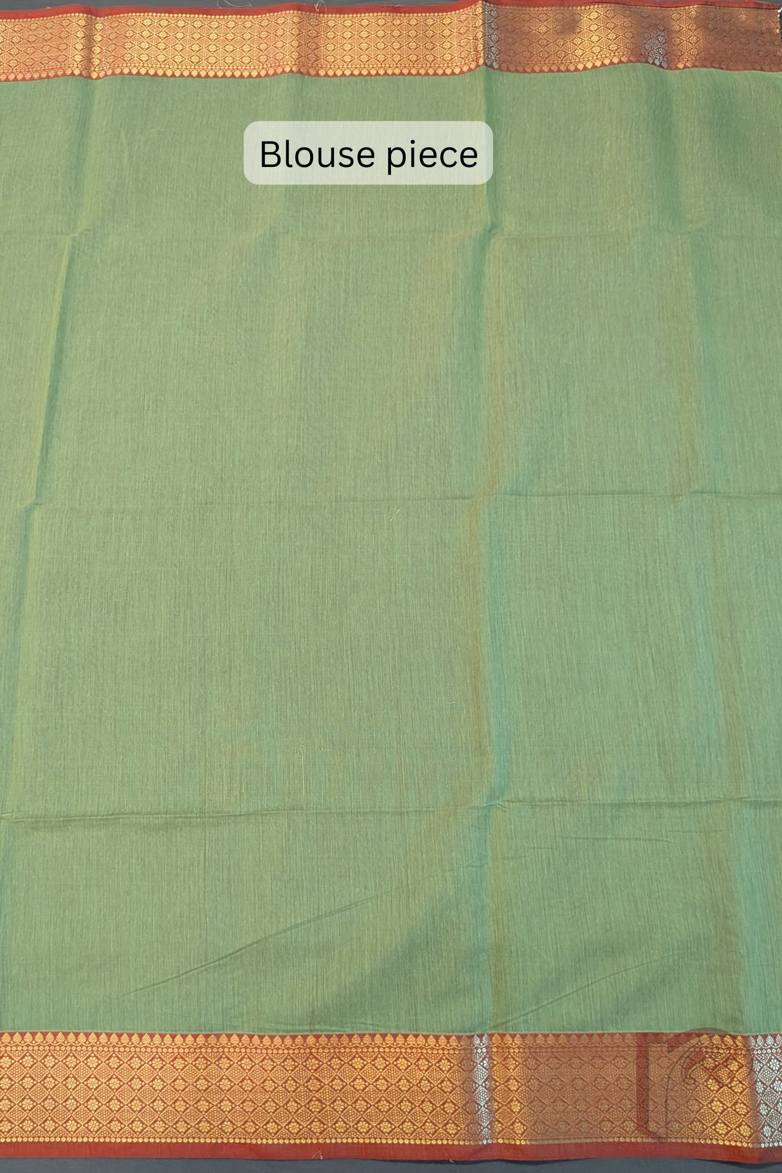 Inspired by nature’s calm elegance, this light leaf green cotton silk blended Banarasi saree offers a refreshing take on traditional weaving. The fabric combines a cool cotton crispness with a refined silk glow, making it ideal for extended wear. The body is adorned with minute floral and leaf zari patterns, lending a subtle sparkle that enhances the soothing green hue. The pallu features a 3-inch decorative zari border in twin parallel lines, intricately filled with gold floral and leaf motifs for a rich Banarasi statement. A contrasting 3-inch dull brick red zari border runs along the length of the saree, grounding the palette with warmth and depth. This saree transitions beautifully from day functions to elegant evenings, offering effortless sophistication.
