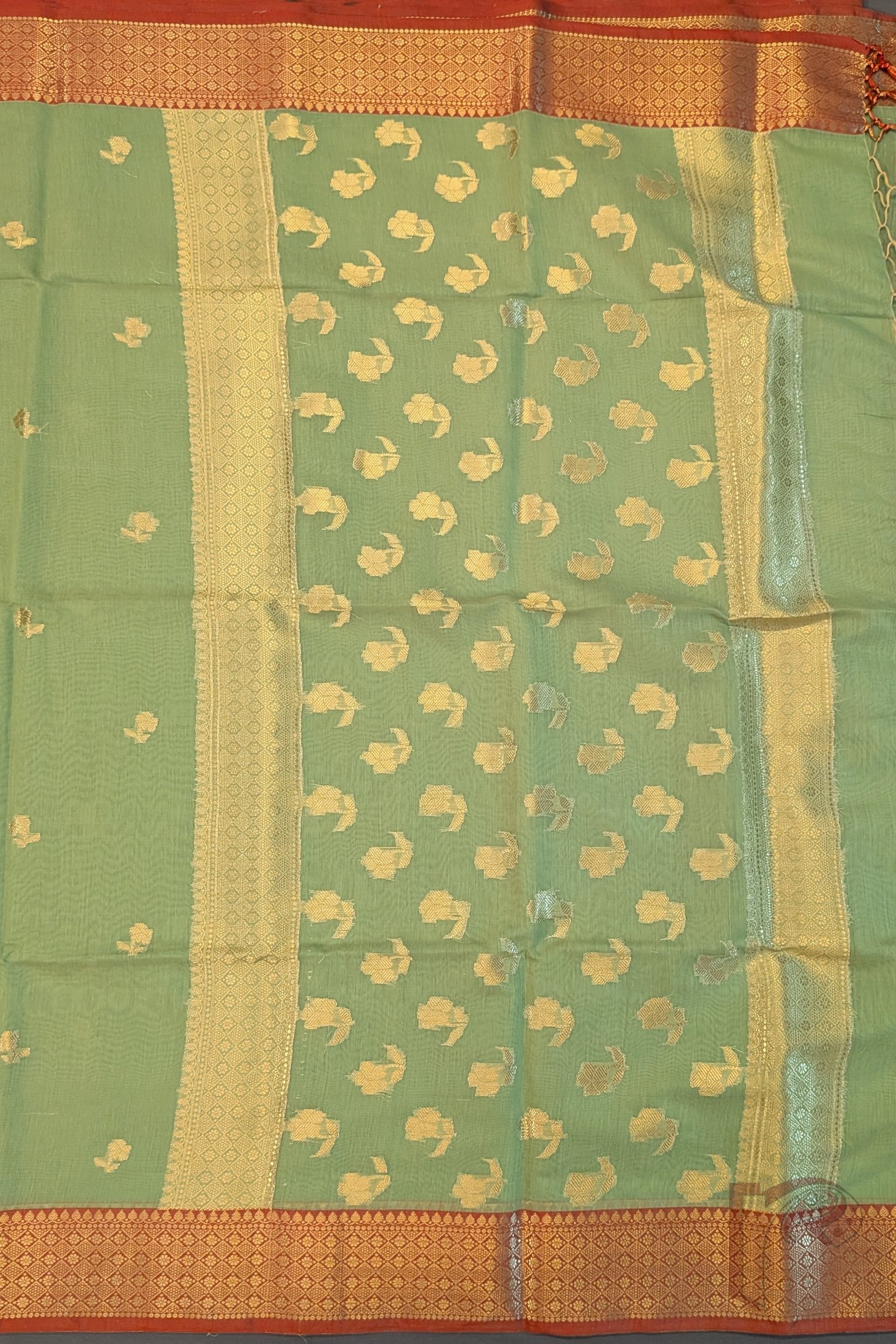 Banarasi Bloom: Light Leaf Green Cotton Silk Blended Banarasi Floral Zari Border Saree