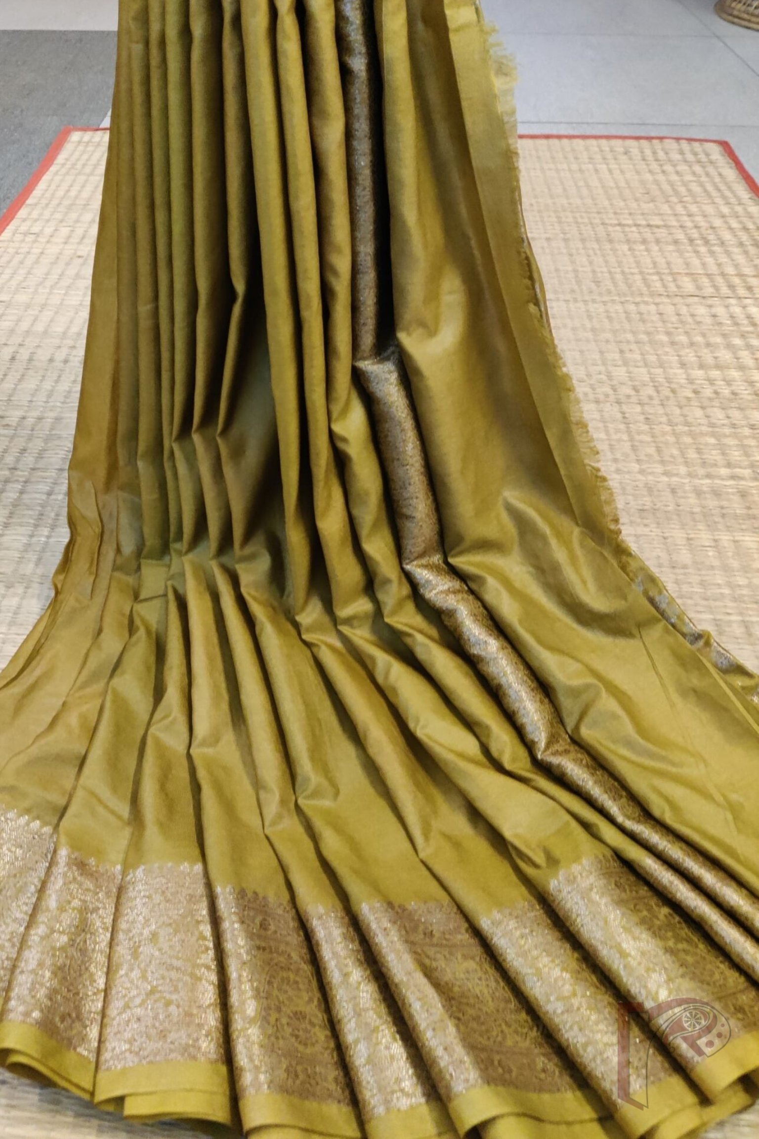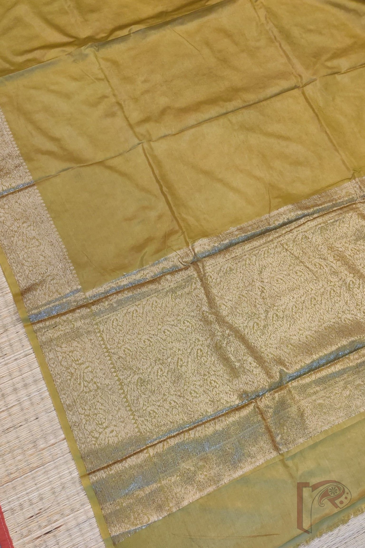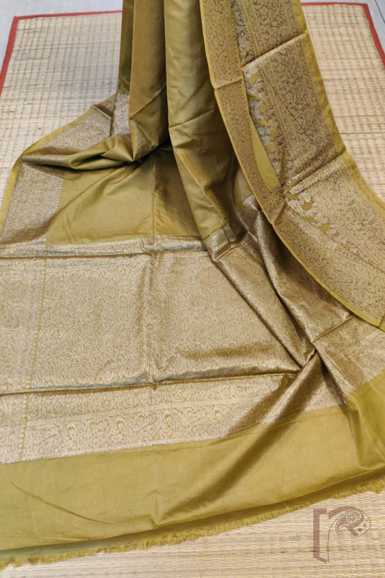 Banarasi Bloom: Light Mehendi Green Khadi Silk Saree with Dull Gold 4″ Karwa Banarasi Weave Border and Matching Woven Blouse