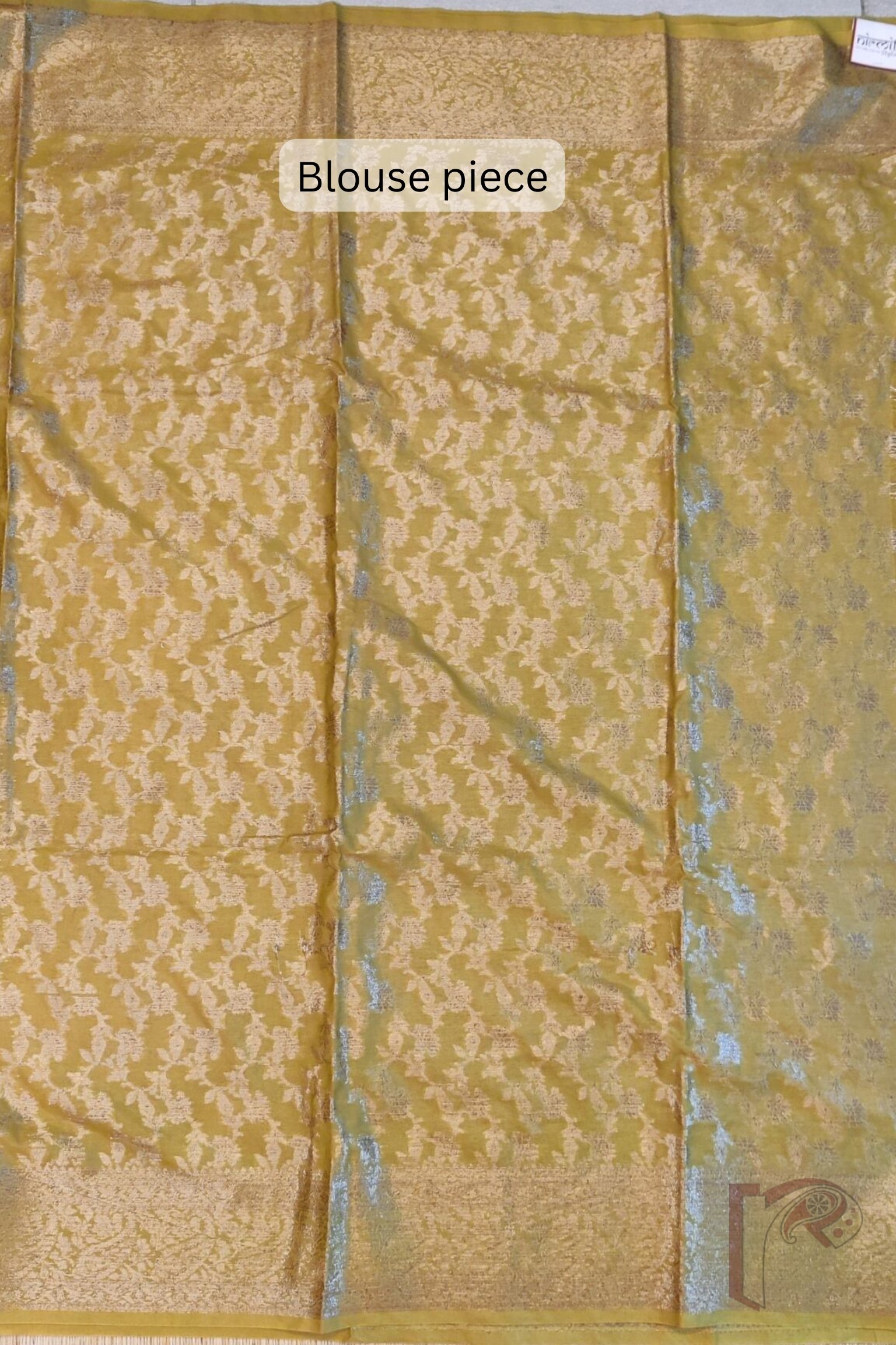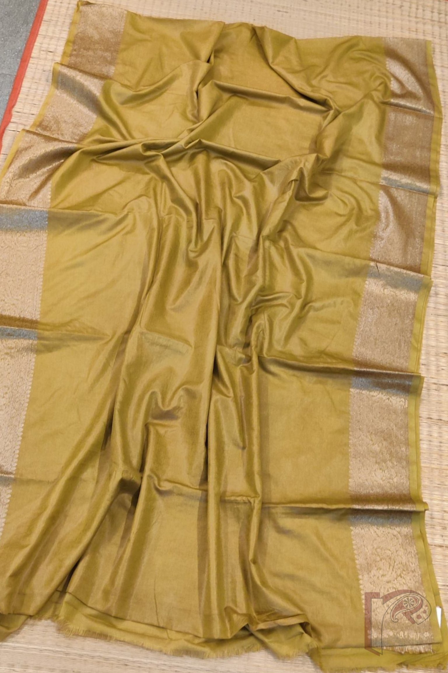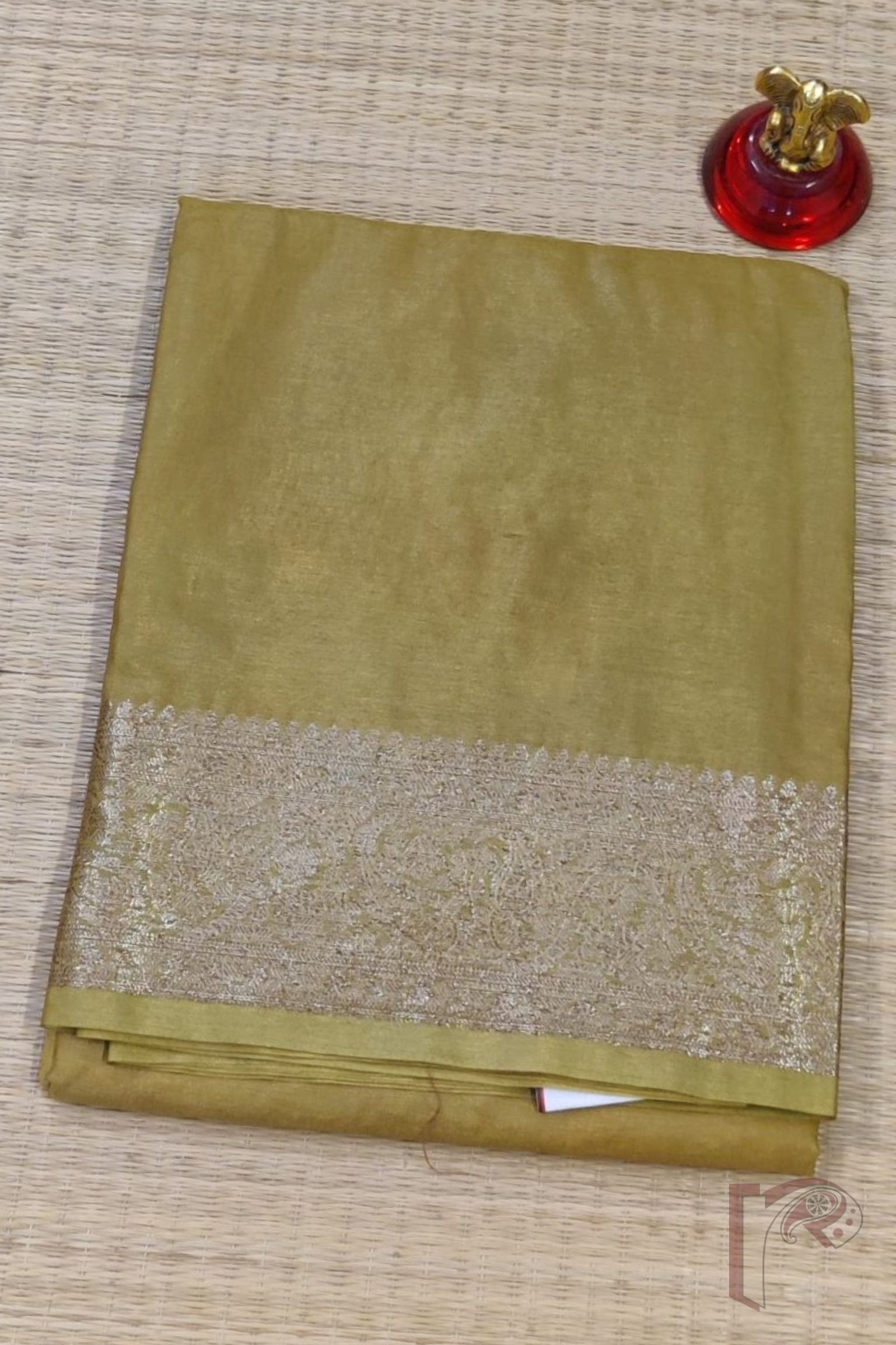 Banarasi Bloom: Light Mehendi Green Khadi Silk Saree with Dull Gold 4″ Karwa Banarasi Weave Border and Matching Woven Blouse