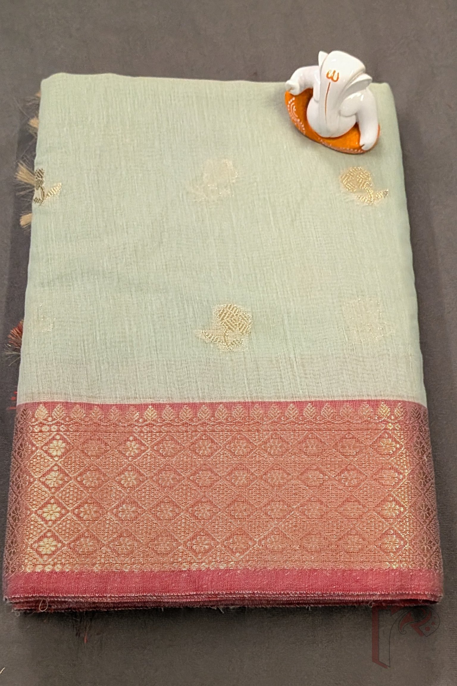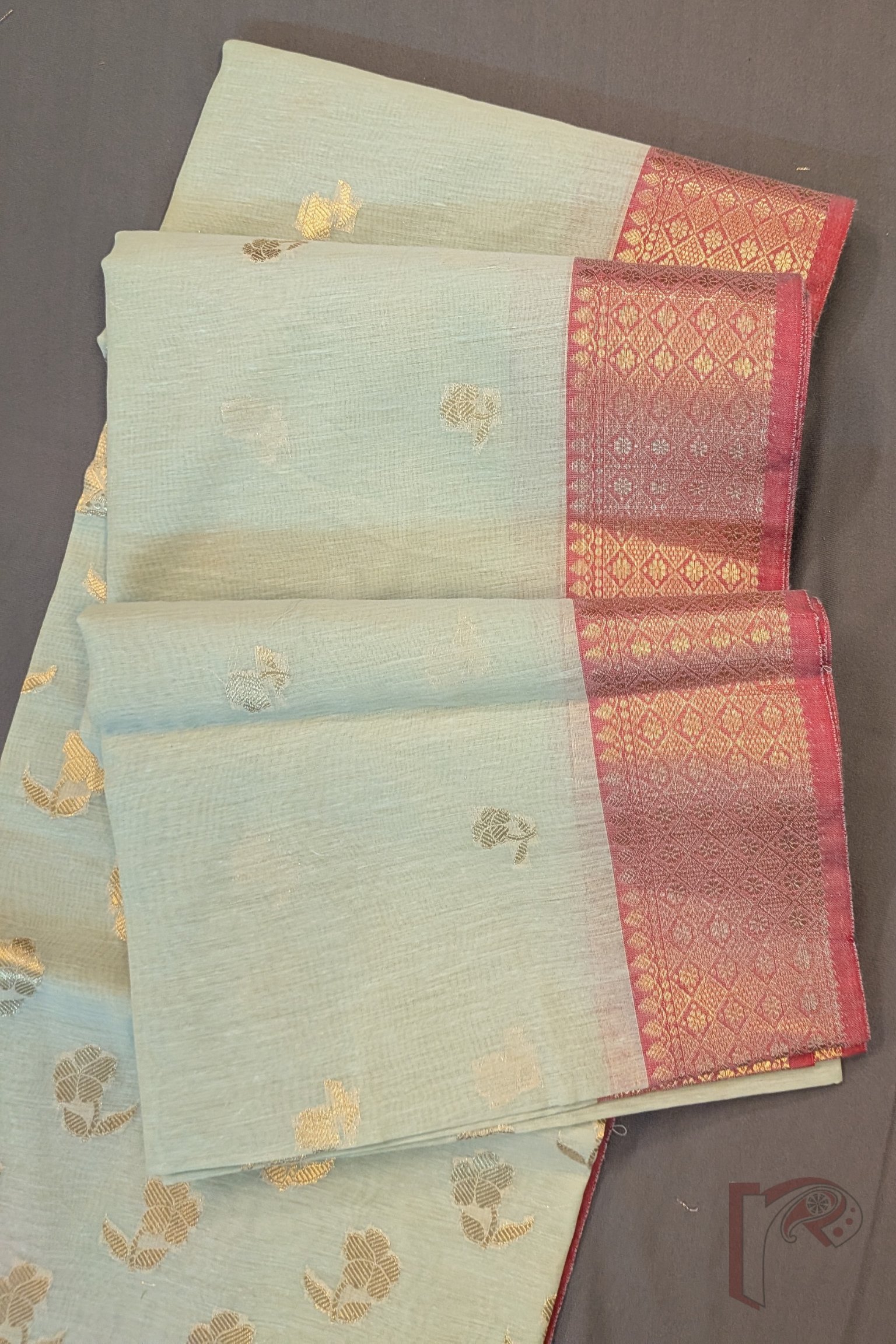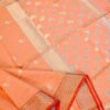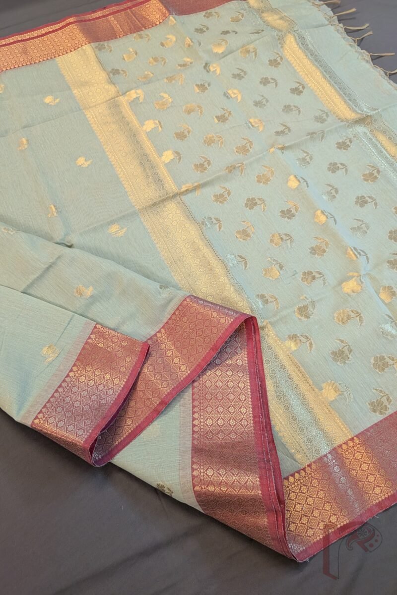 Soft and refreshing, this light pista green cotton silk blended Banarasi saree exudes effortless charm and refinement. The saree features a structured cotton base paired with a subtle silk finish, making it comfortable yet visually rich. The body is adorned with fine floral and leaf zari motifs, adding a delicate shimmer that enhances the pastel tone. The pallu is elevated with a 3-inch decorative zari border in parallel lines, densely woven with gold floral and leaf motifs that create a graceful Banarasi statement. Completing the design is a 3-inch dull pink zari border running along both sides, offering gentle contrast and balance. Ideal for day festivities, elegant gatherings, and refined evening wear, this saree is timeless and versatile.