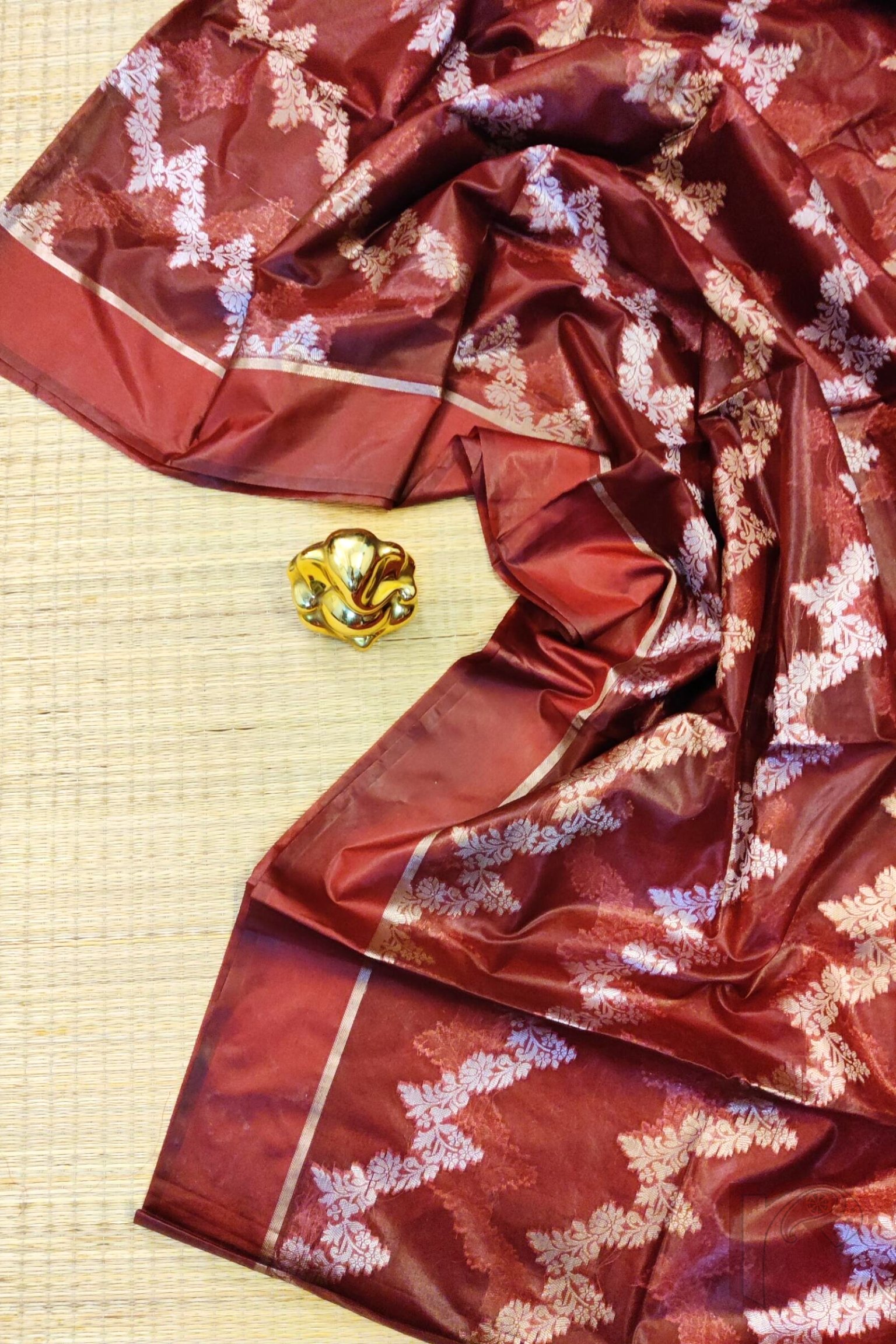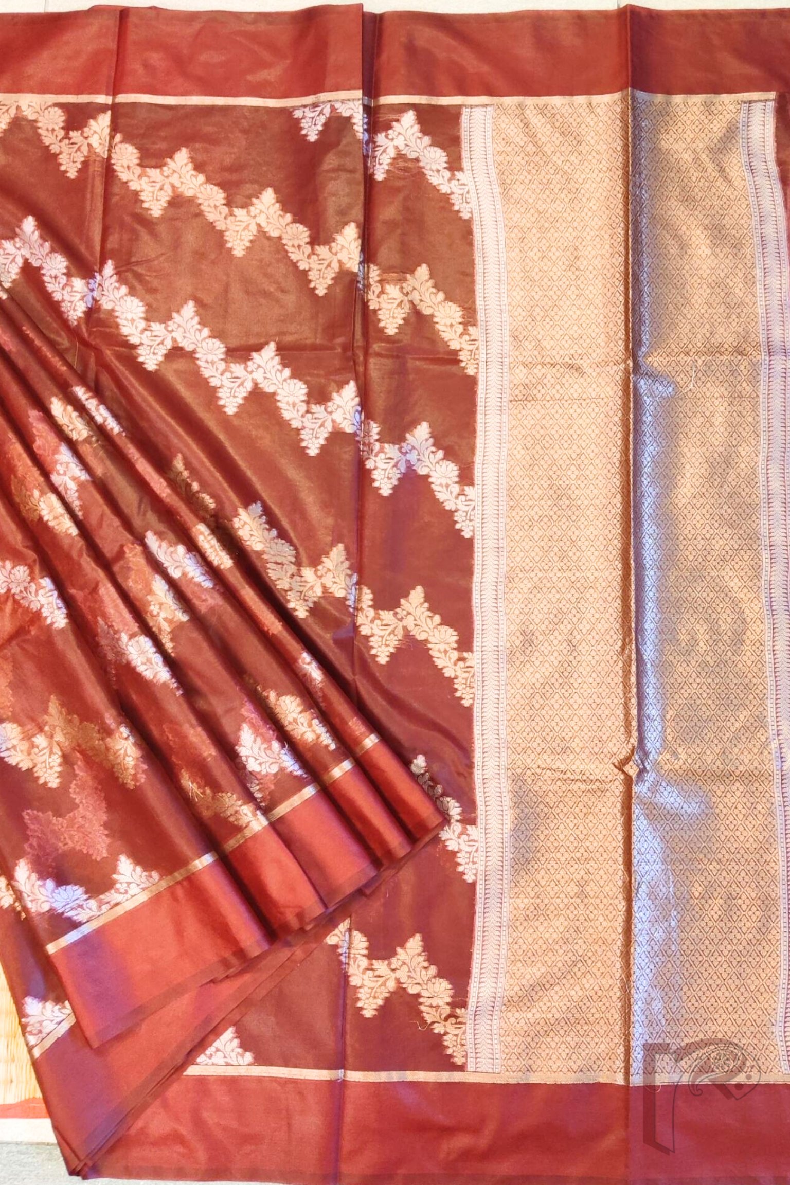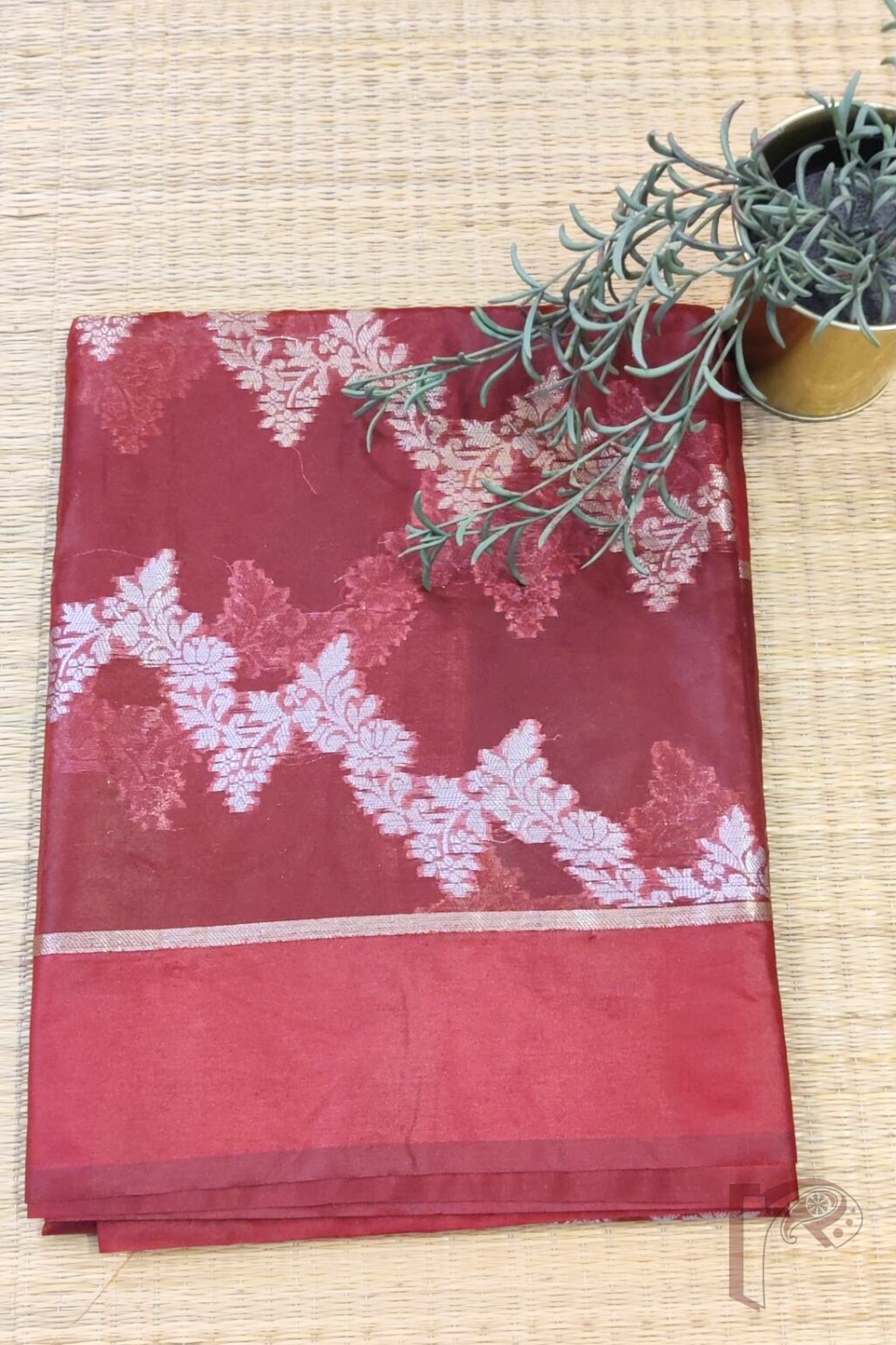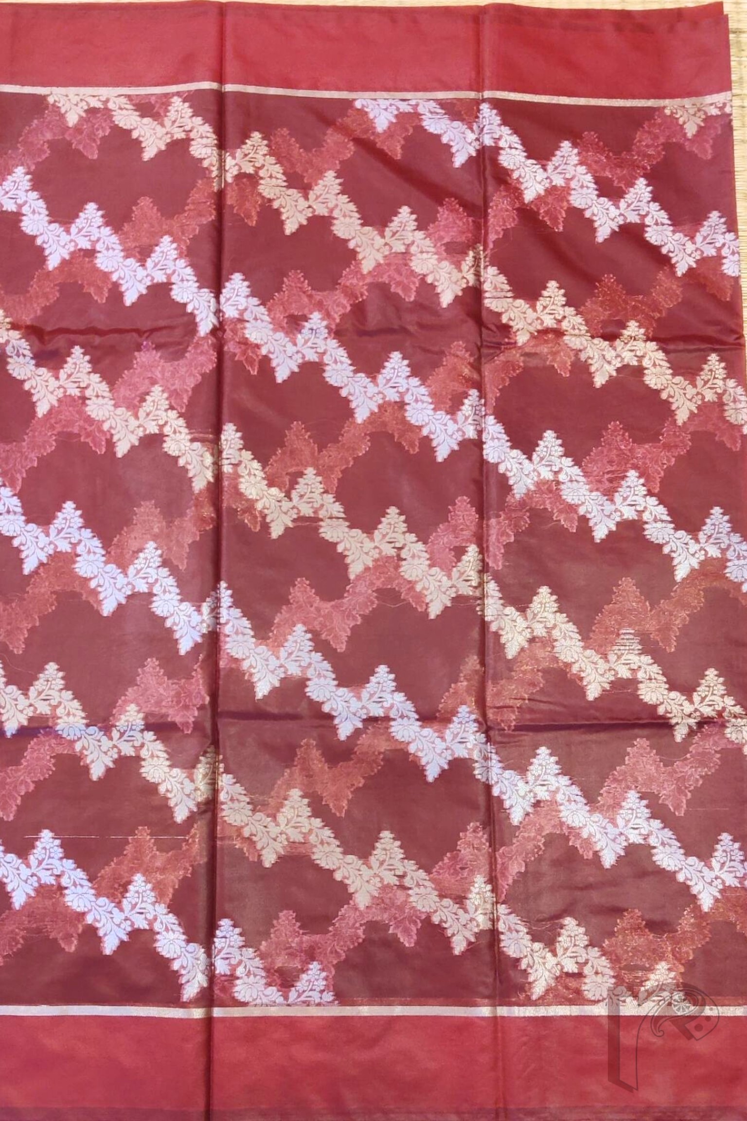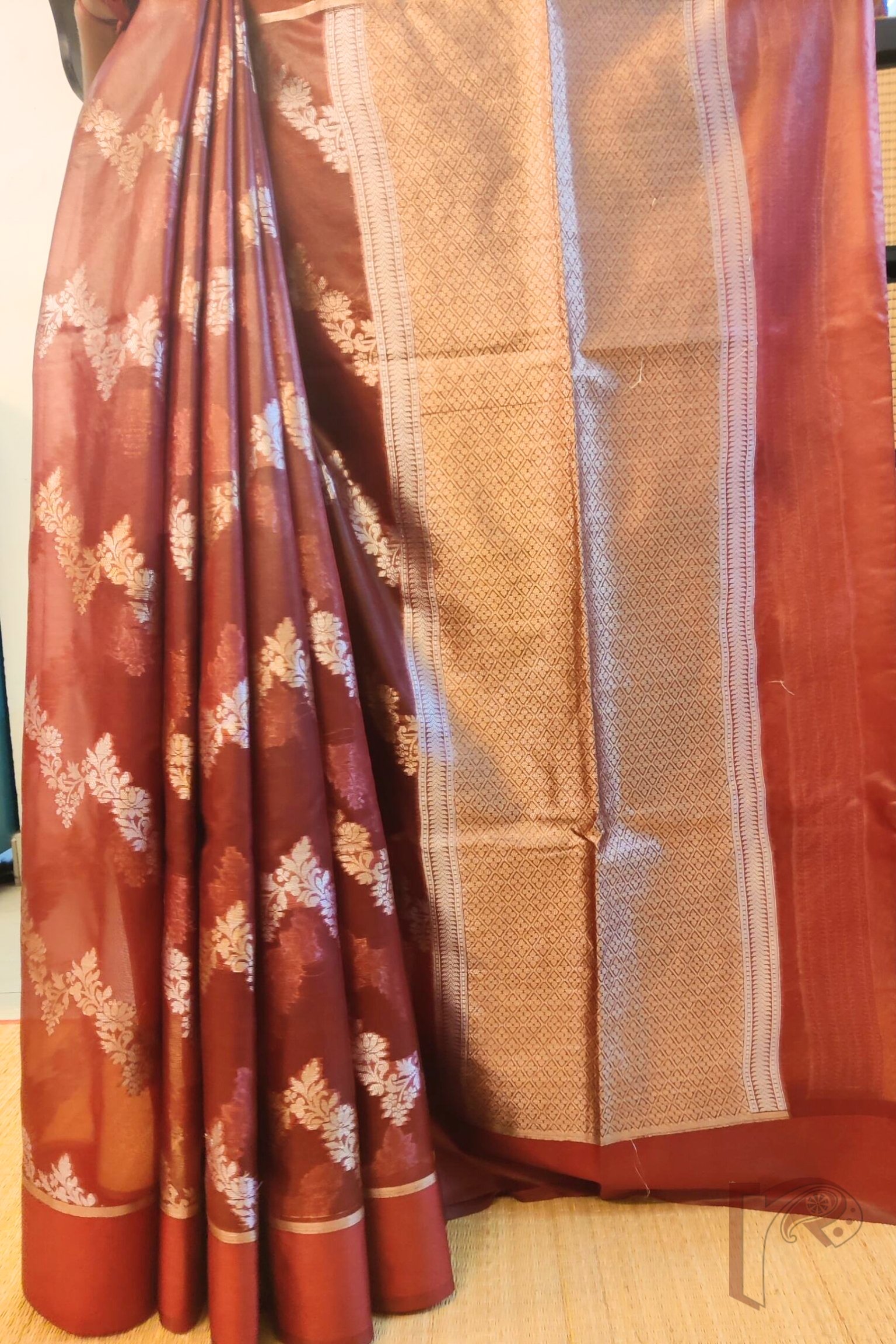 Banarasi Bloom: Maroon Semi Organza Saree with Diagonal Silver-Gold Creeper Weave and Lehriya Banarasi Border