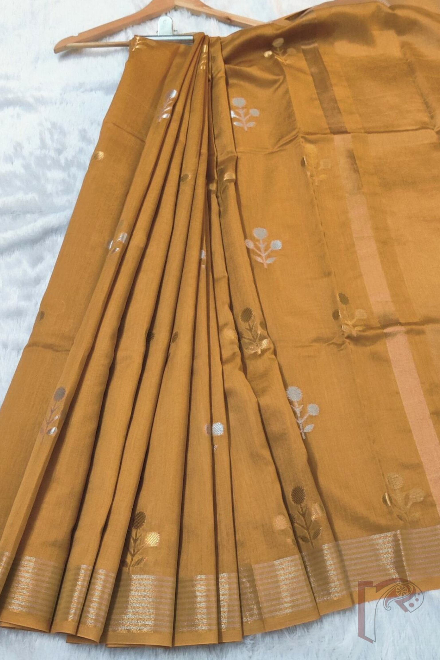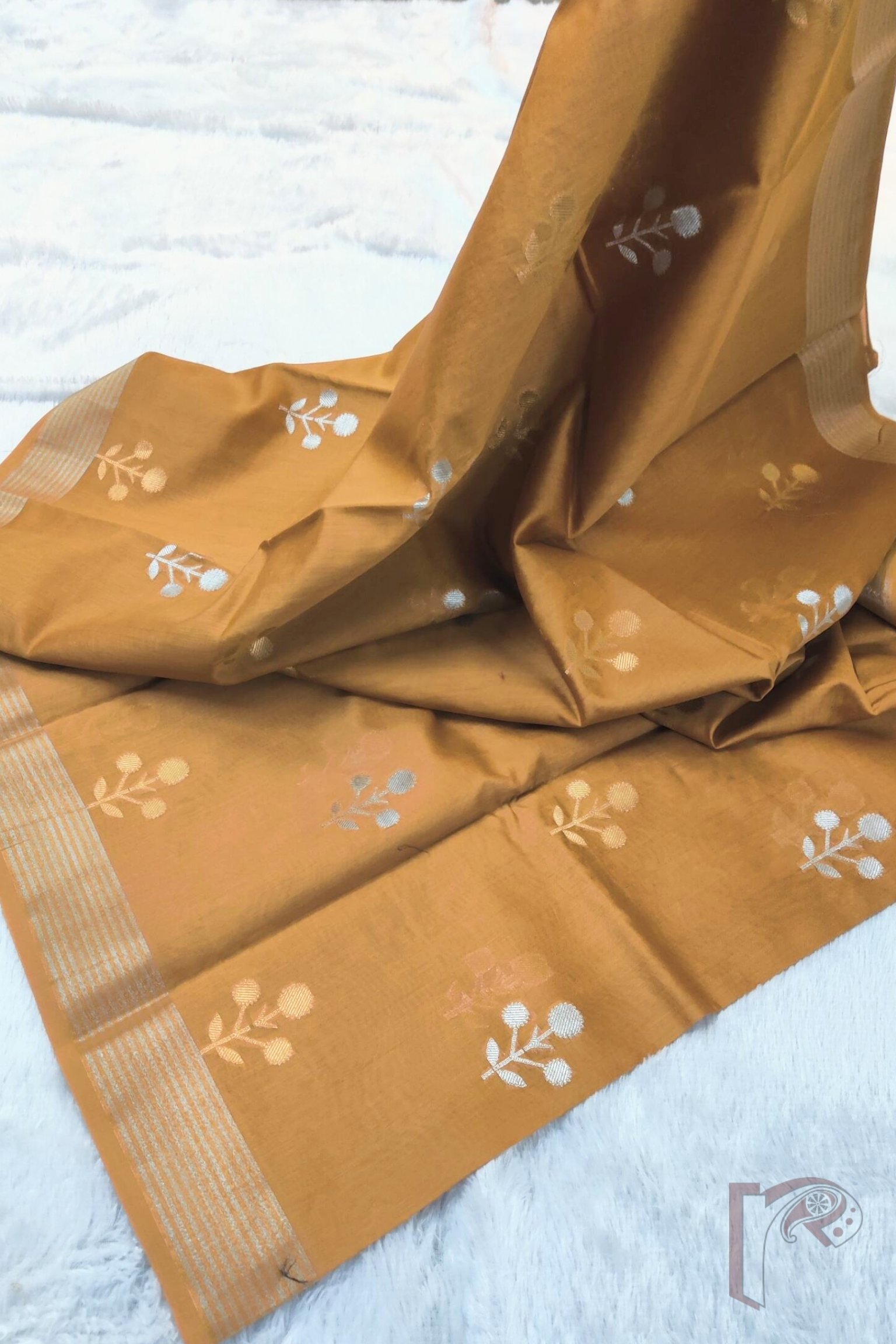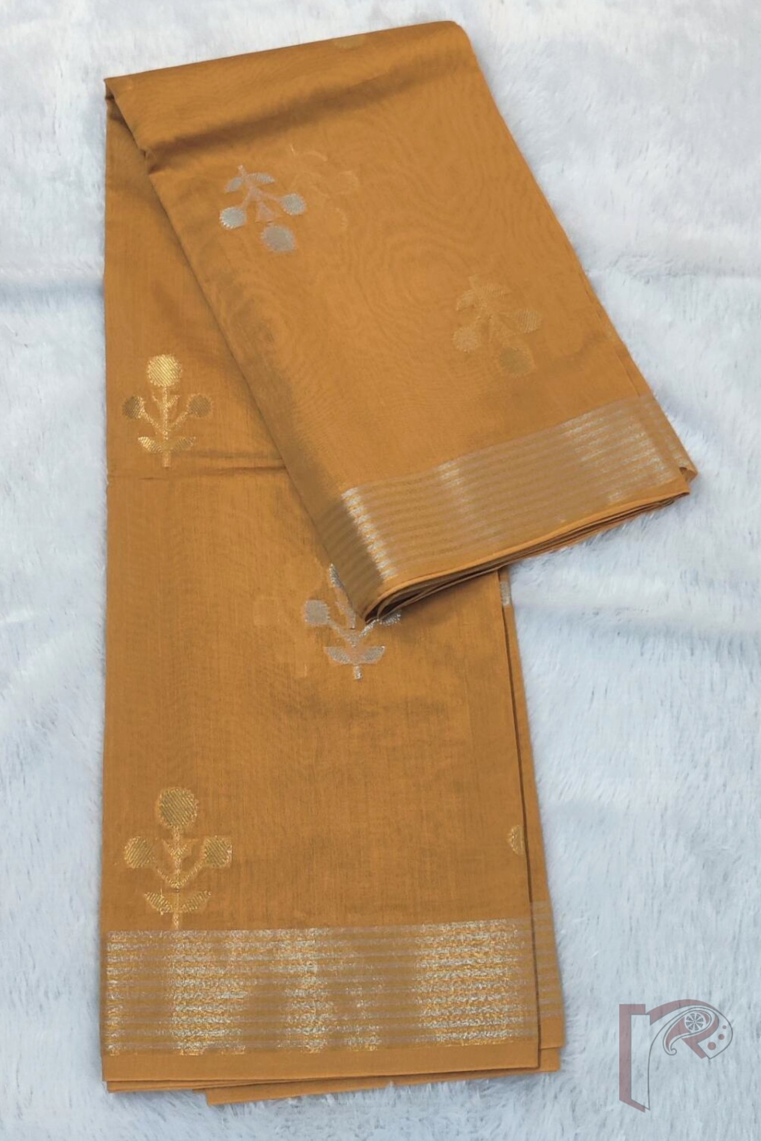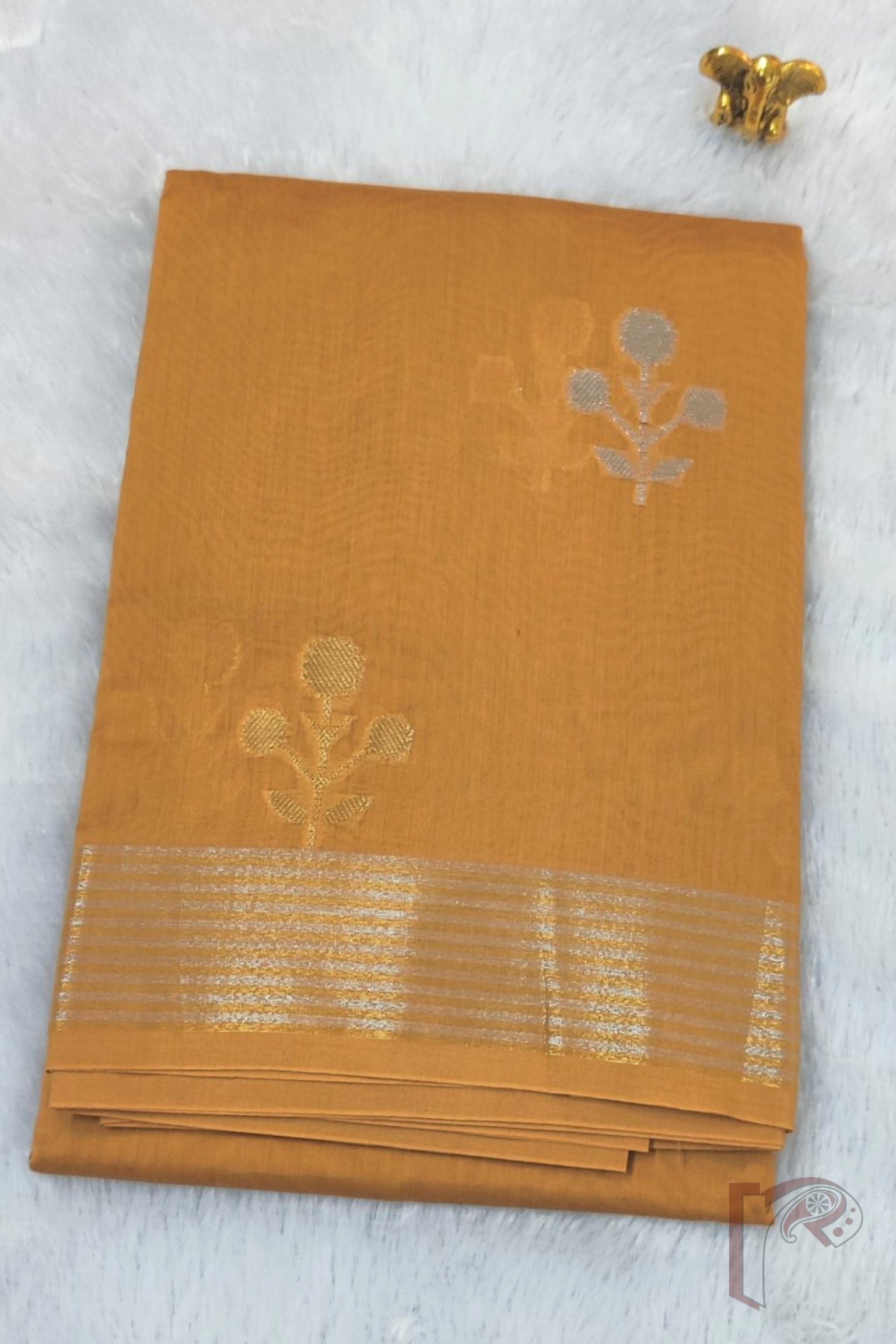 Bright and festive, this mustard yellow mercerised cotton silk saree exudes radiance and joy. Unlike traditional bold borders, it features a series of thin zari lines in silver and gold, giving it a contemporary twist. The body showcases floral stem motifs in shimmering zari, balancing tradition with modern charm. A plain mustard blouse highlighted with matching zari borders completes the look. Mercerised cotton silk’s luminous texture and lightweight drape make this saree an effortless choice for celebratory occasions.