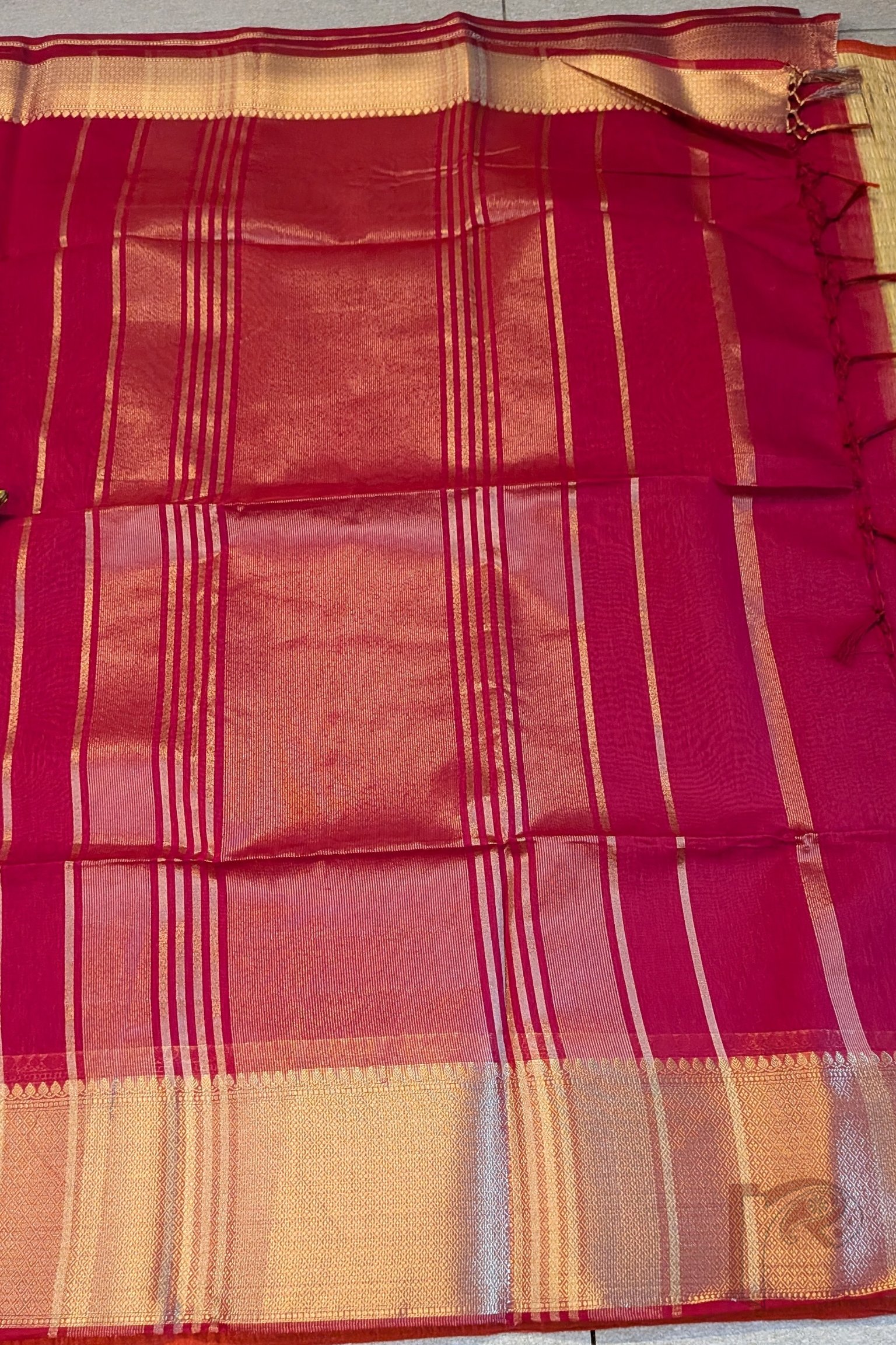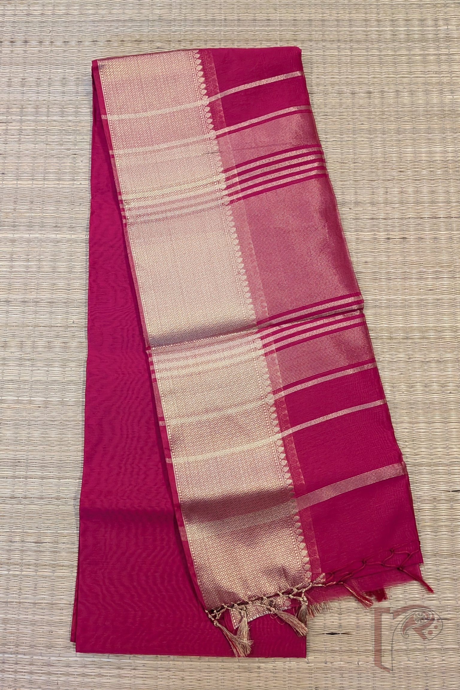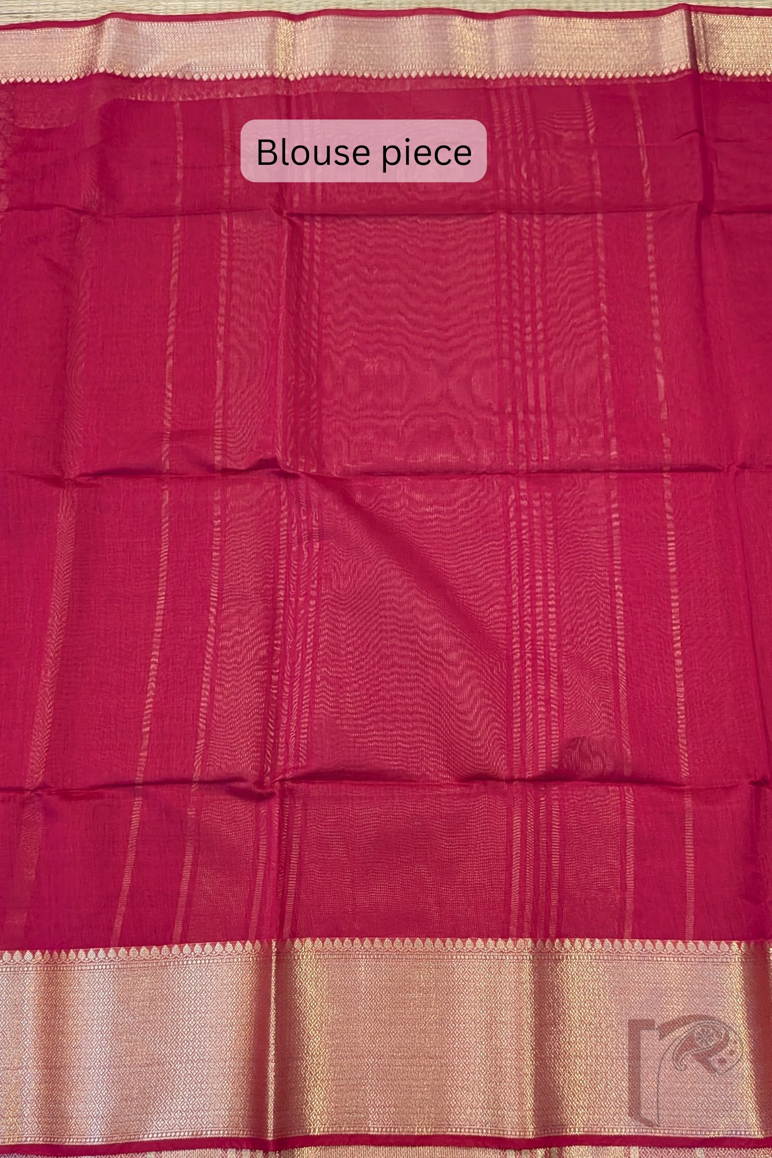 Each saree in this collection is adorned with floral stem motifs in zari, a design element that symbolizes grace and continuity in Indian weaving traditions. Borders vary from dual-toned zari finishes in gold and silver to finely woven lines, creating subtle yet striking contrasts. Completing the look, every saree is paired with a plain running blouse featuring zari borders, offering scope for customization while retaining harmony with the saree.