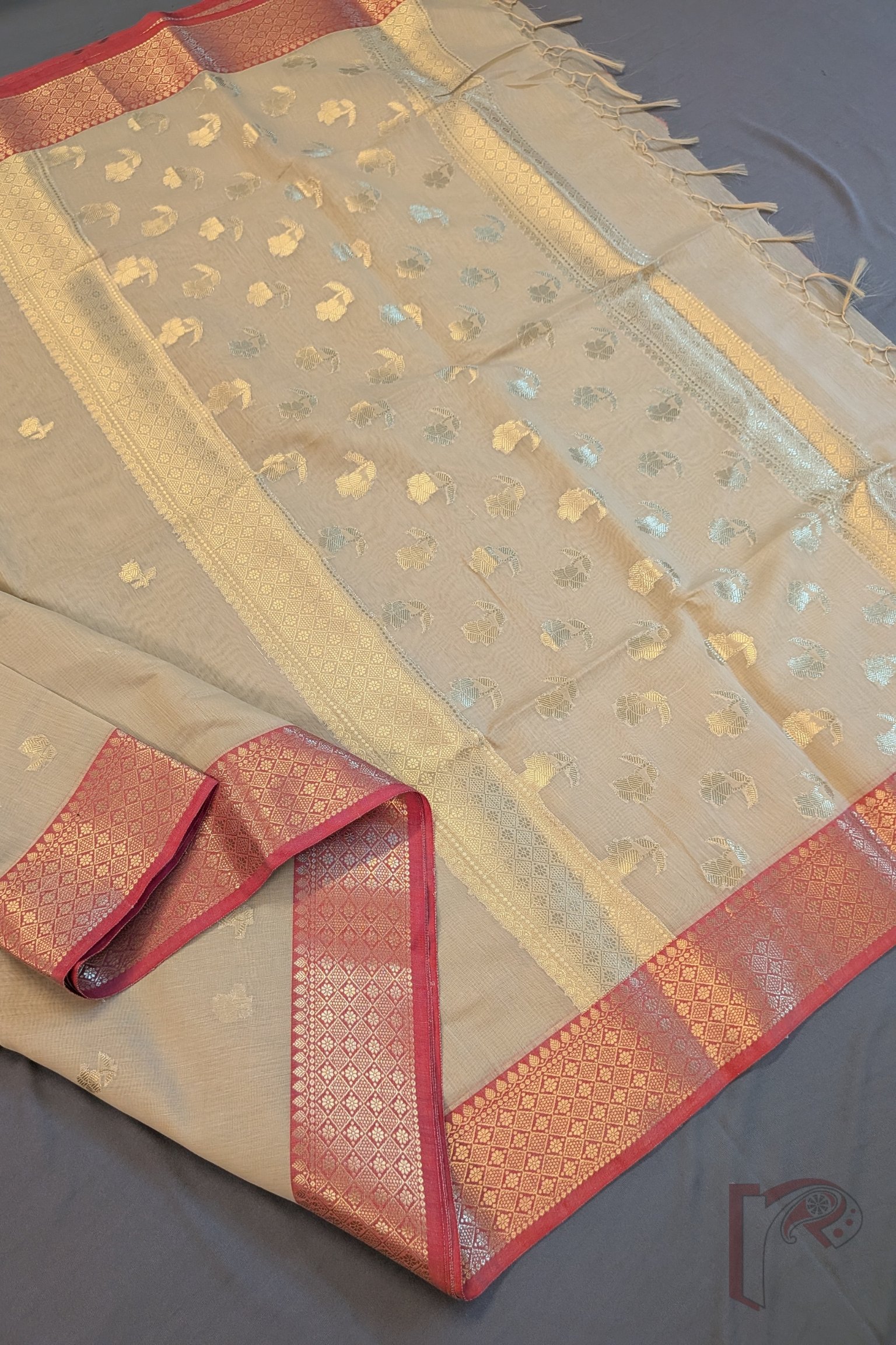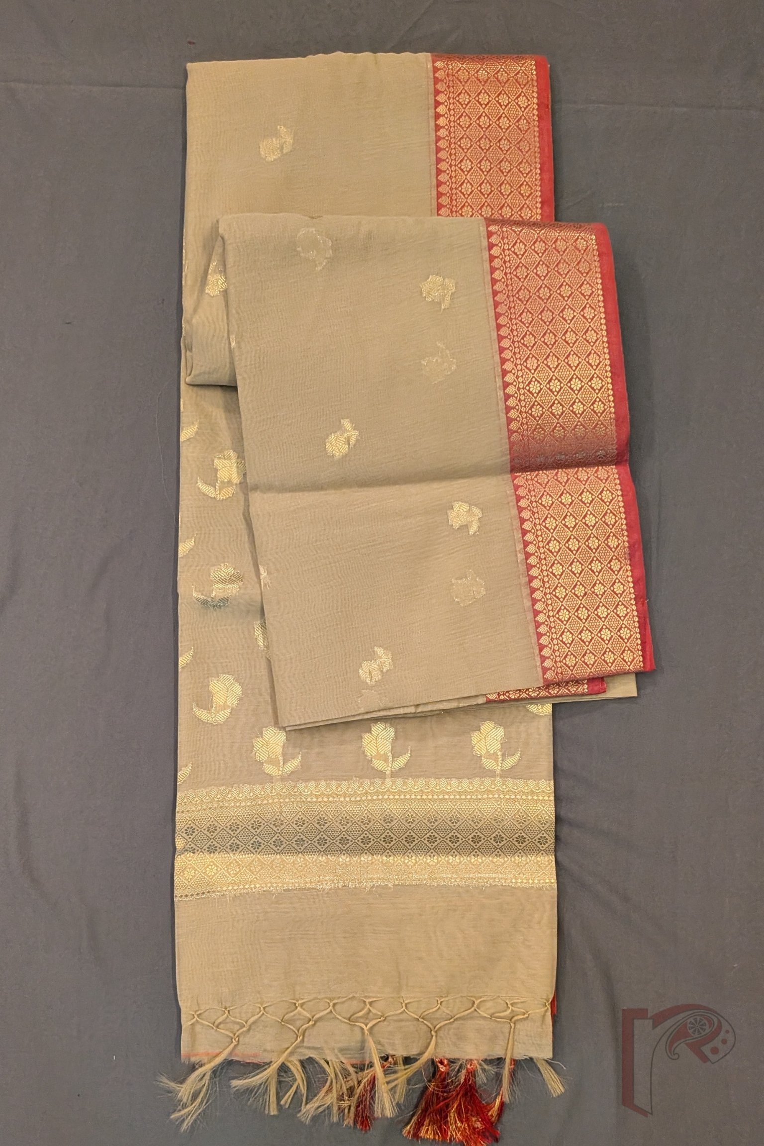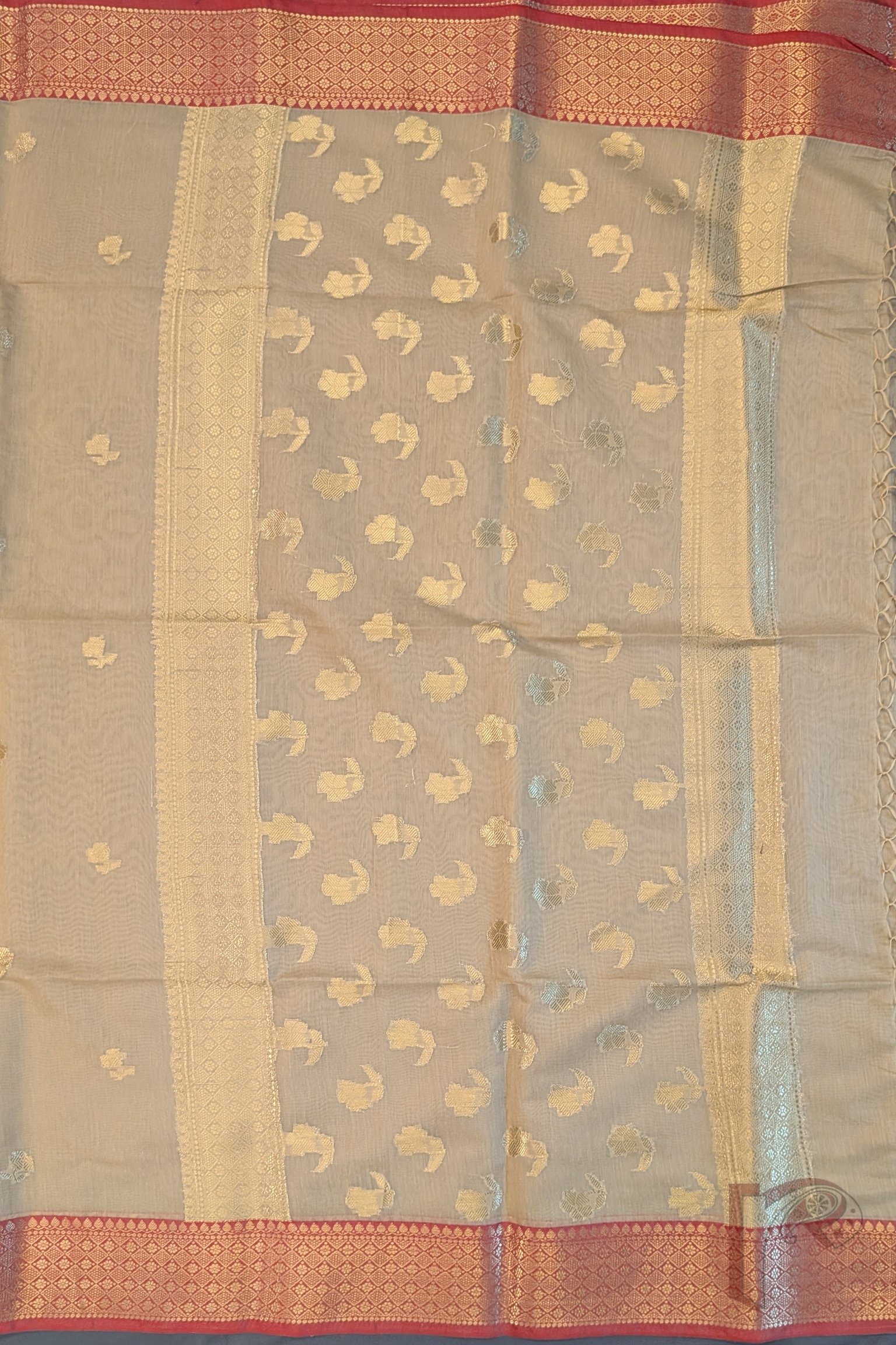 Understated and earthy, this fawn cotton silk blended Banarasi saree is perfect for those who appreciate quiet elegance. The saree features a clean cotton texture softened by a muted silk glow, offering comfort with sophistication. Its body is detailed with delicate floral and leaf zari motifs, adding just the right amount of shimmer to the neutral base. The pallu is enhanced with a 3-inch decorative zari border in parallel lines, intricately filled with gold floral and leaf motifs that elevate its traditional appeal. Running along both sides is a 3-inch dull red zari border, creating a rich contrast against the fawn body. This saree is ideal for subtle festive dressing, office celebrations, and evening elegance.