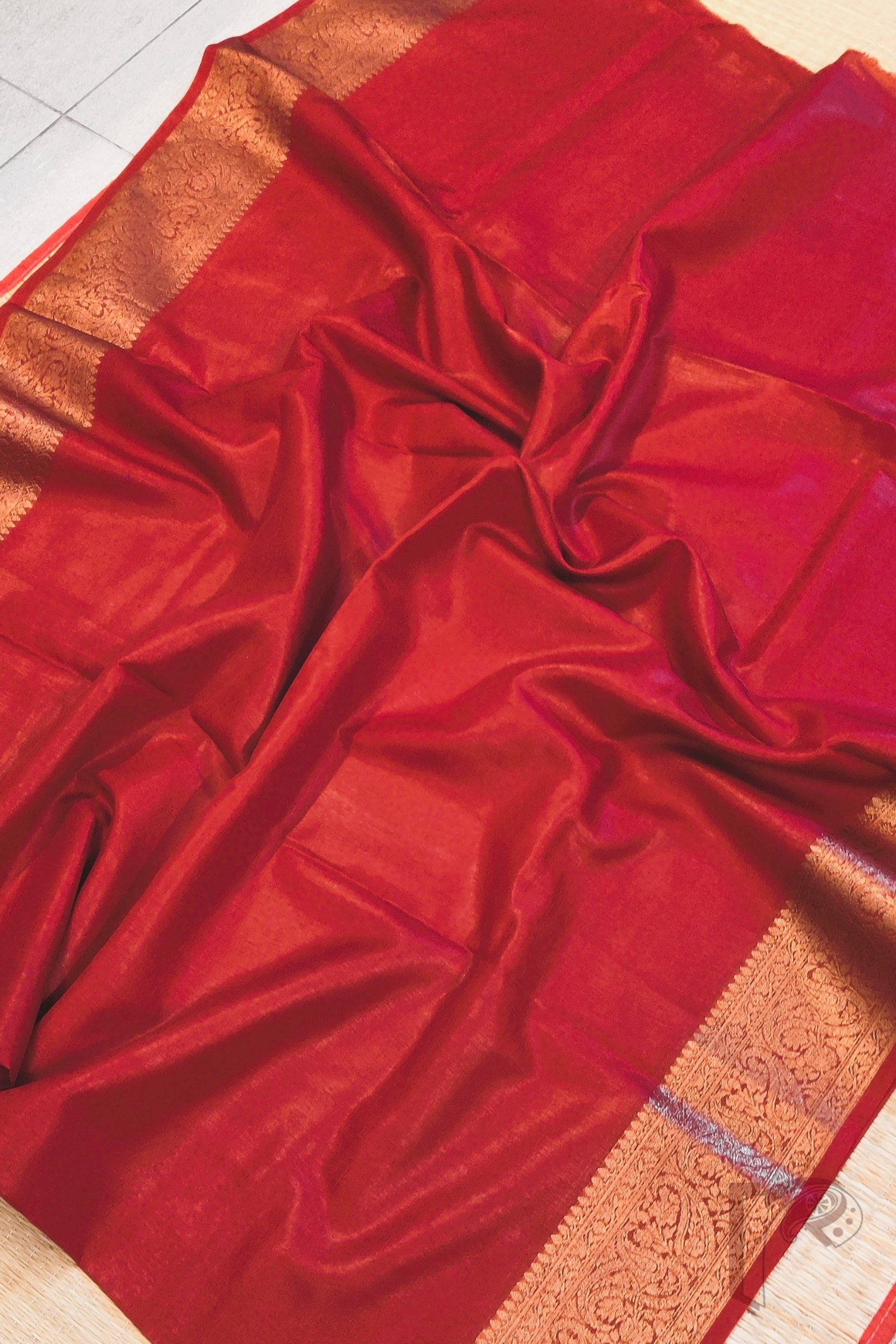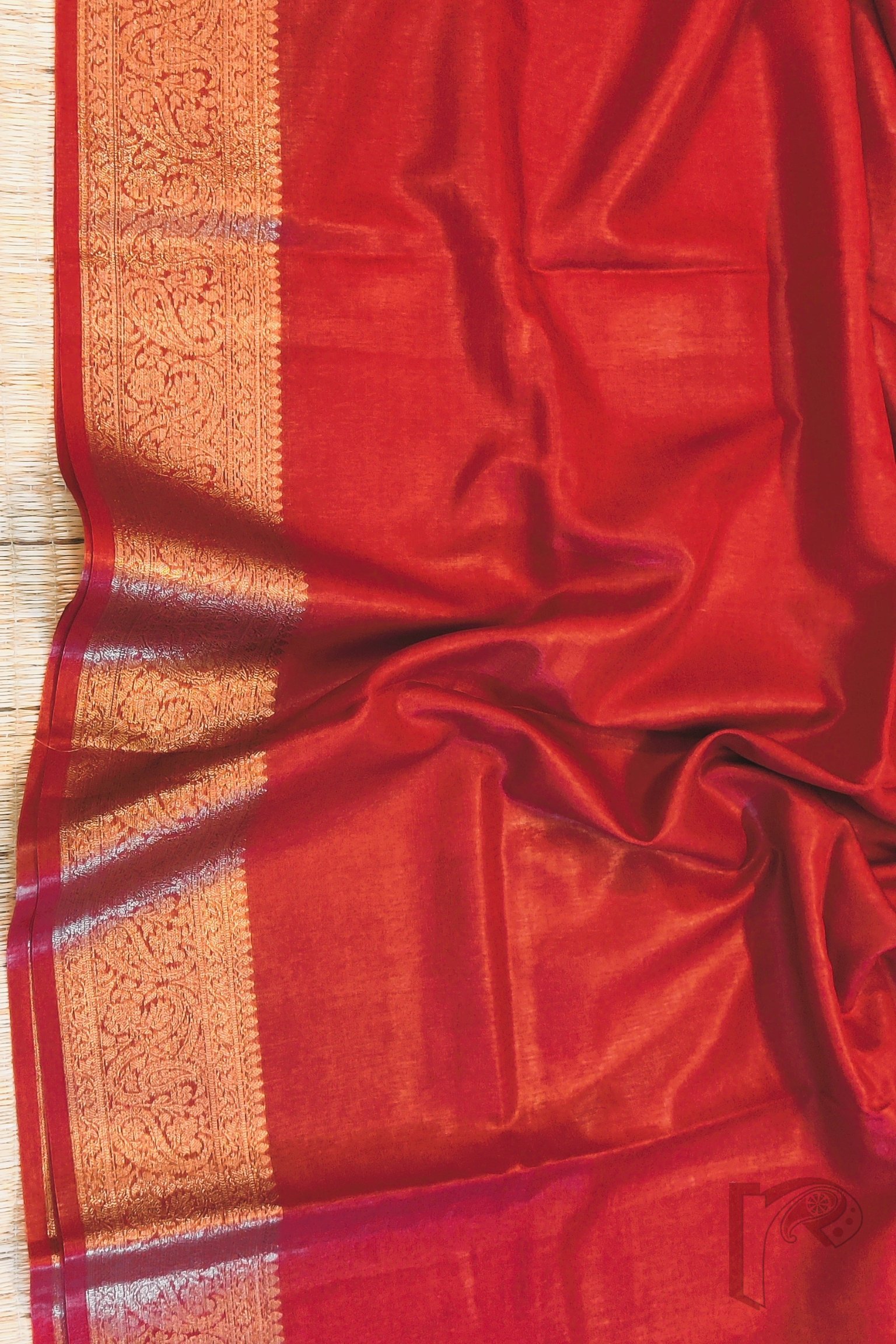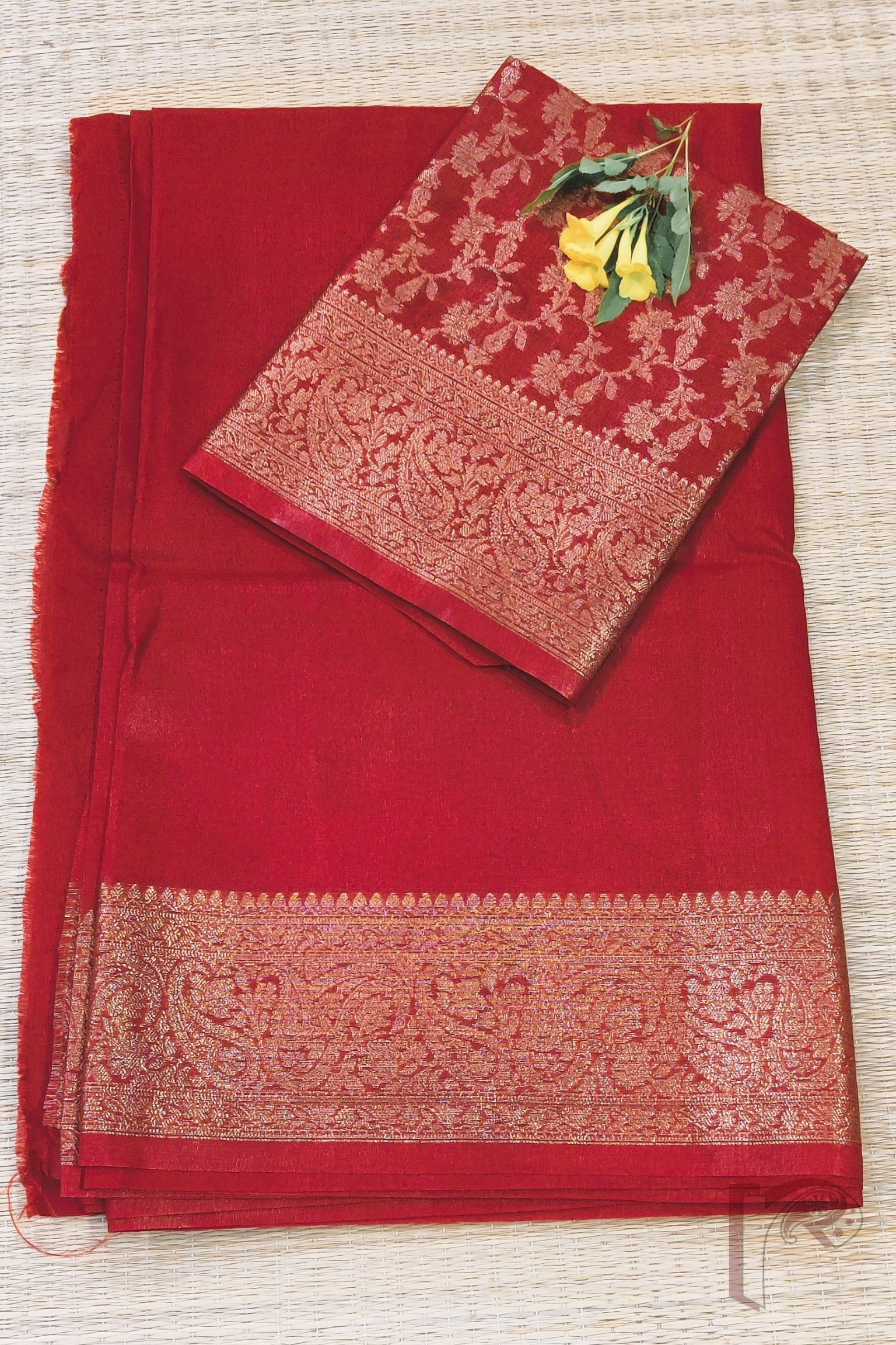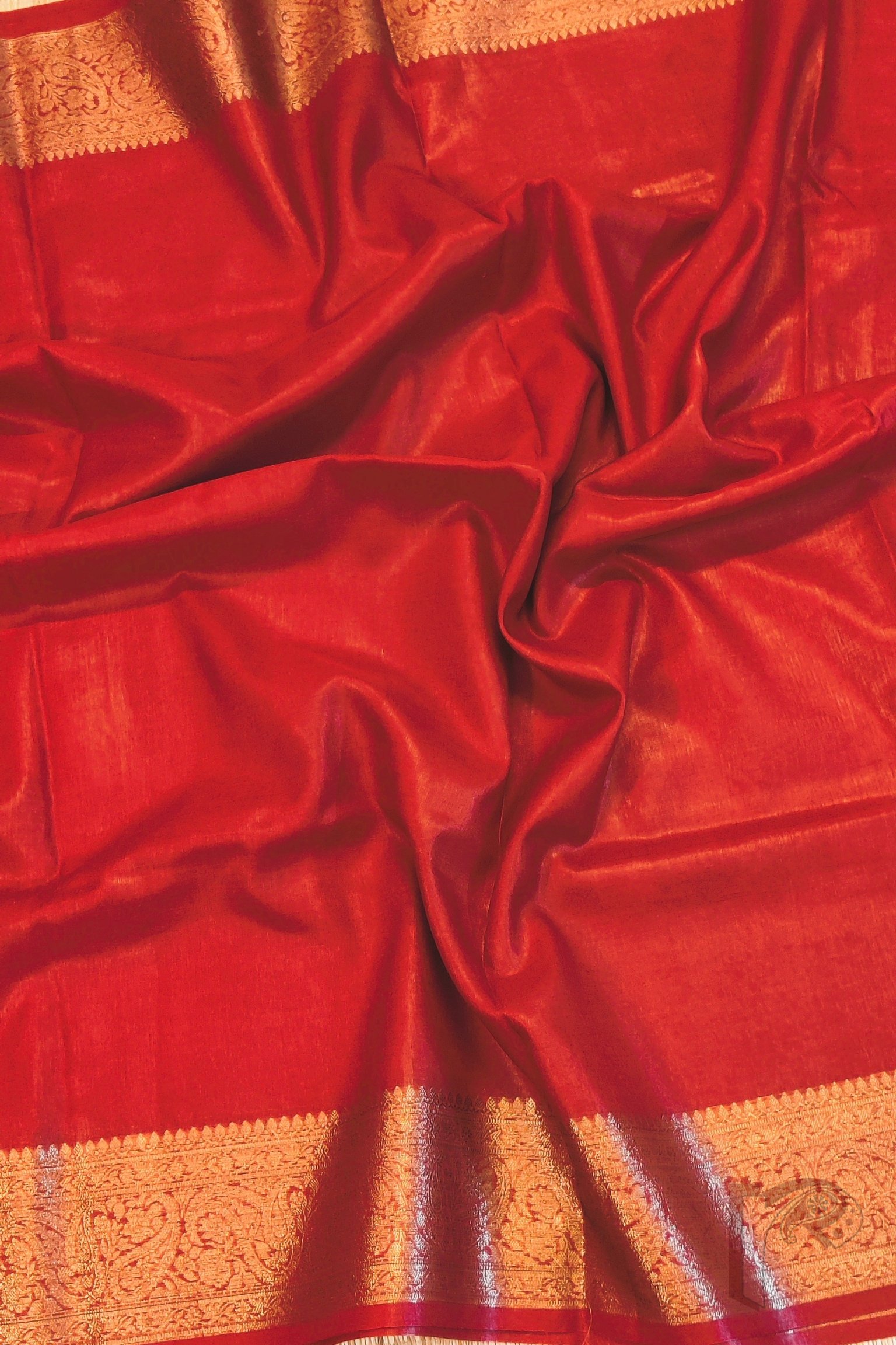 Timeless and regal, this red Khadi Silk saree is a celebration of classic elegance and rich Banarasi artistry. The saree features a stunning 4-inch Karwa Banarasi weave border in muted gold, crafted meticulously all around the saree and extending beautifully onto the pallu, creating a refined yet opulent look. The deep red body enhances the sophistication of the gold, offering the perfect balance of vibrance and heritage. Complementing the saree is its matching red blouse with an all-over Karwa Banarasi weave, adding texture and traditional charm to the ensemble. Lightweight yet luxurious, this saree is ideal for festive occasions, family ceremonies, pujas, and evening celebrations, making it a statement piece for those who adore rich Indian weaves and bold, elegant colours.