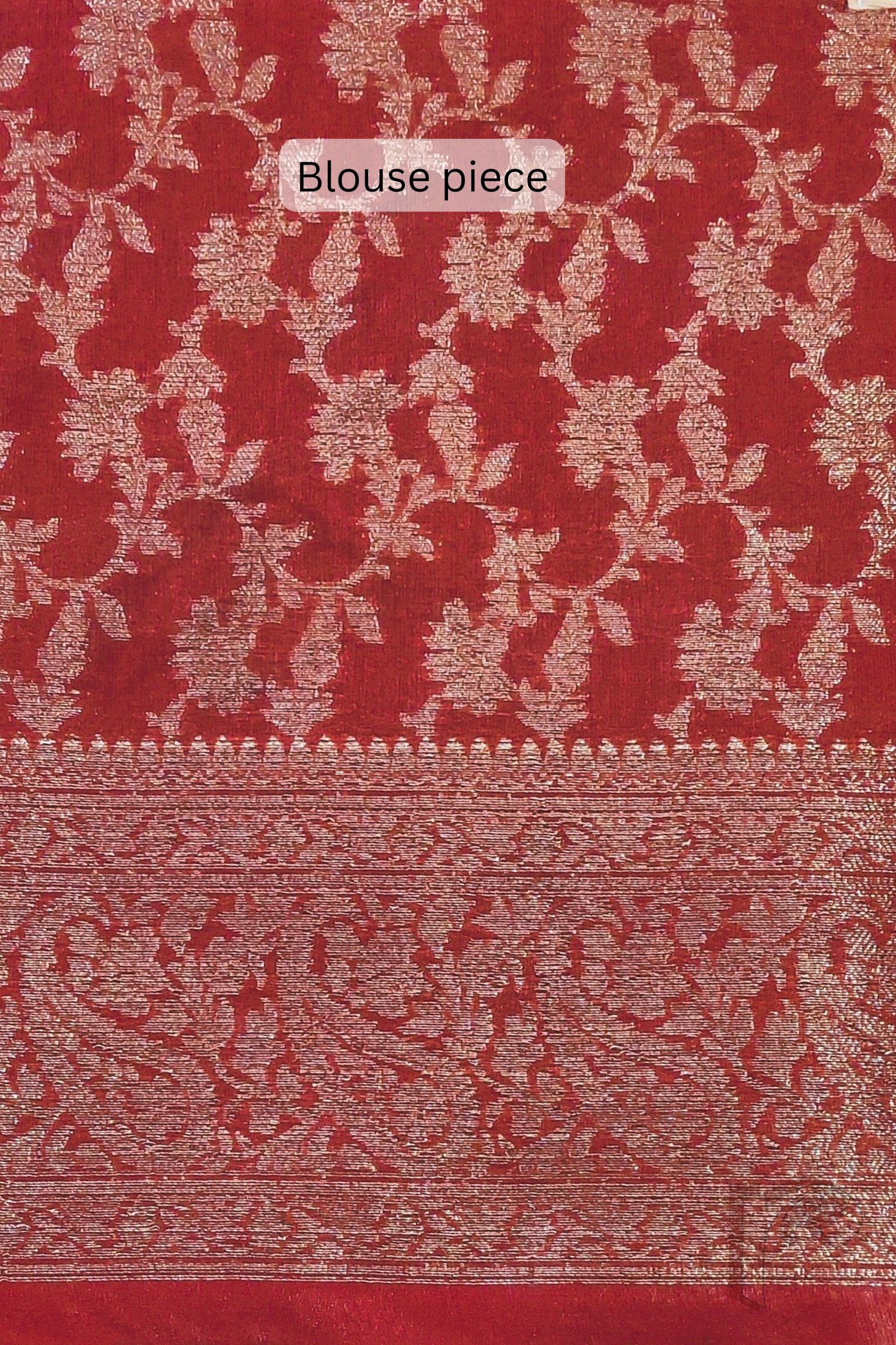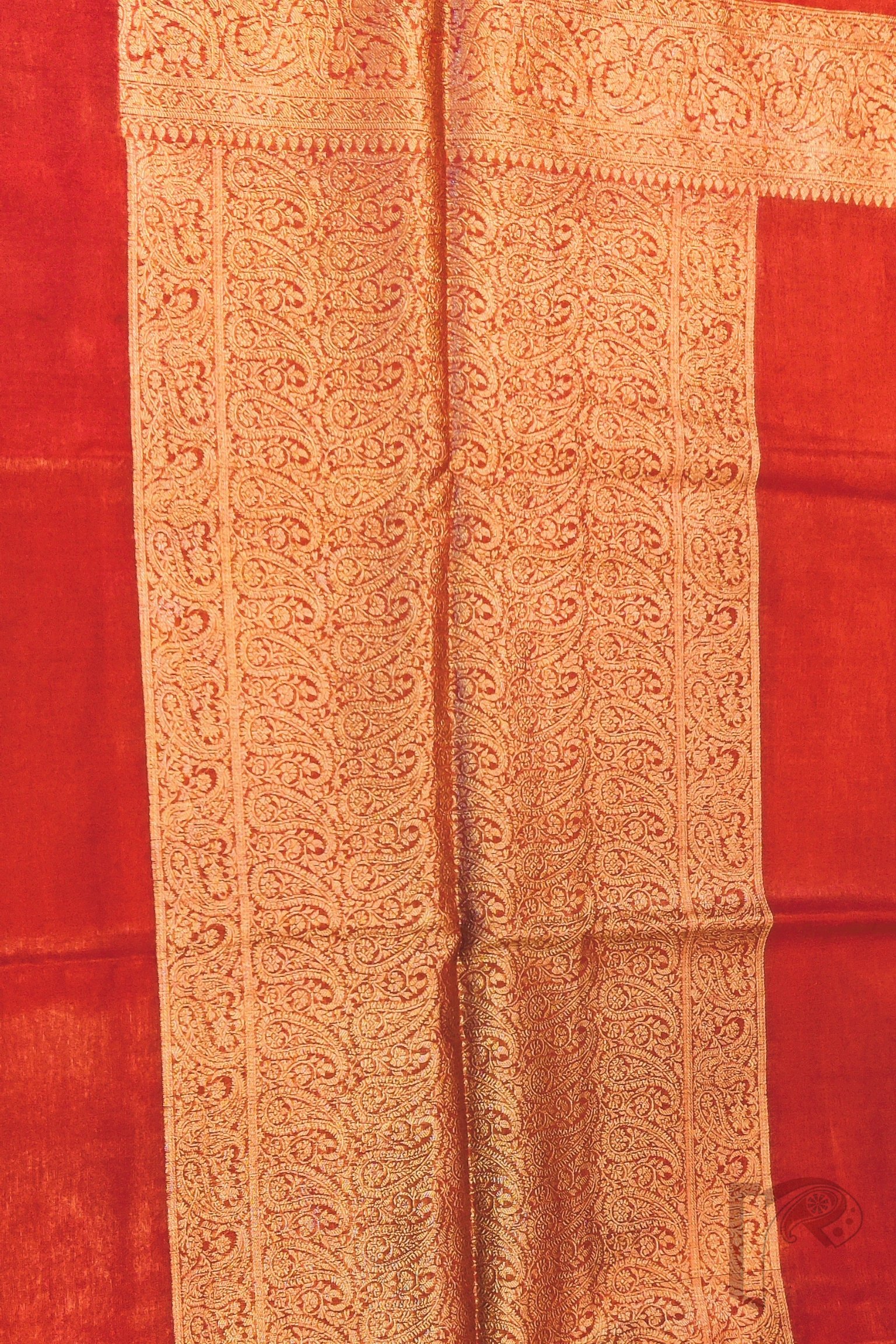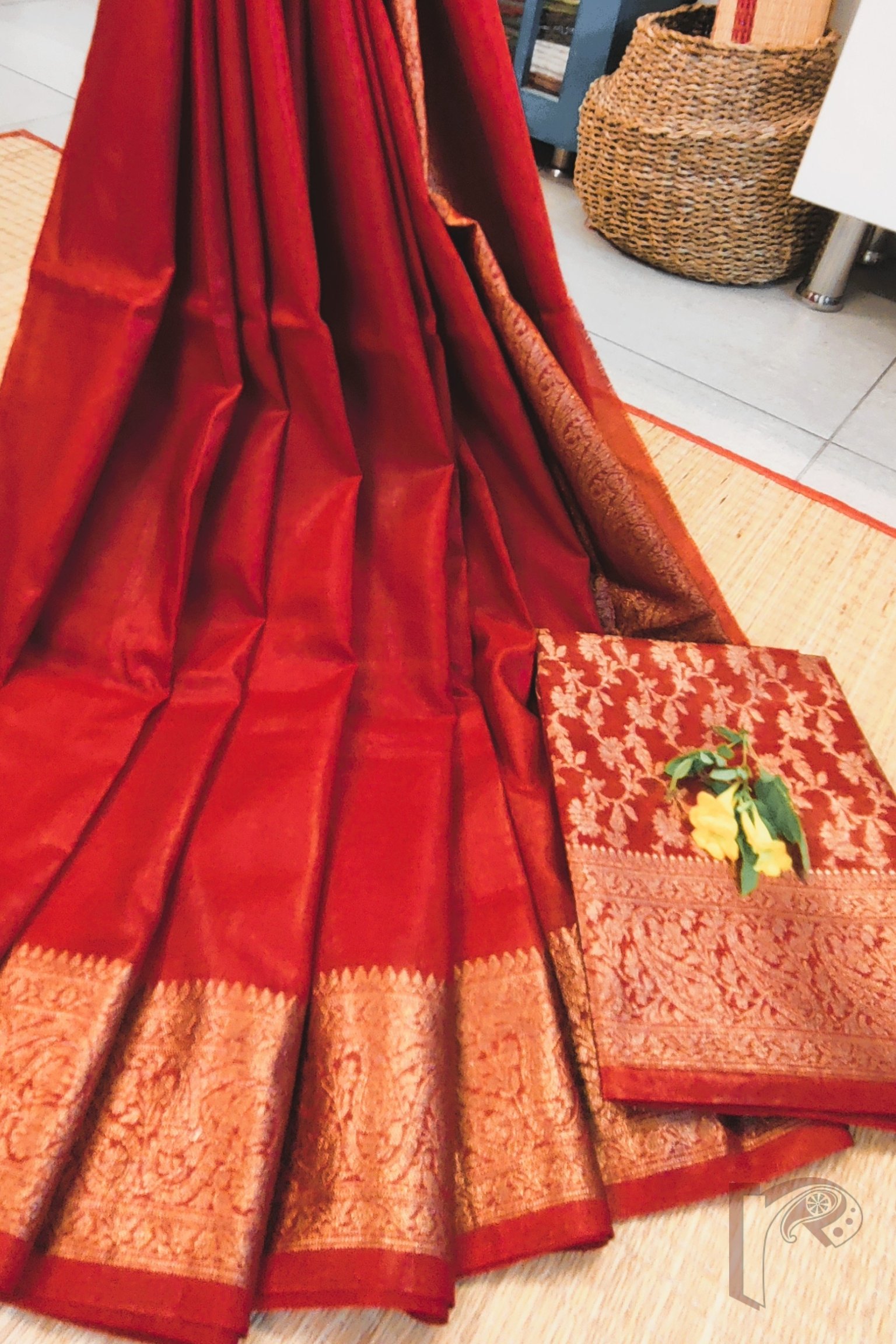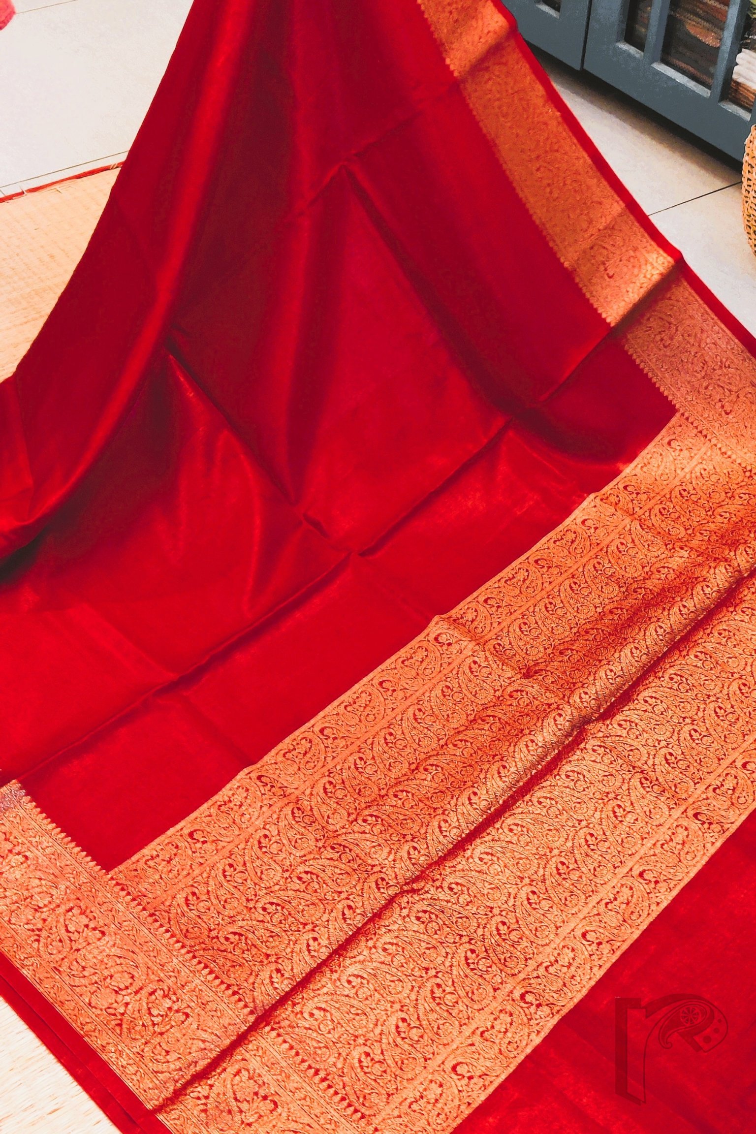 Timeless and regal, this red Khadi Silk saree is a celebration of classic elegance and rich Banarasi artistry. The saree features a stunning 4-inch Karwa Banarasi weave border in muted gold, crafted meticulously all around the saree and extending beautifully onto the pallu, creating a refined yet opulent look. The deep red body enhances the sophistication of the gold, offering the perfect balance of vibrance and heritage. Complementing the saree is its matching red blouse with an all-over Karwa Banarasi weave, adding texture and traditional charm to the ensemble. Lightweight yet luxurious, this saree is ideal for festive occasions, family ceremonies, pujas, and evening celebrations, making it a statement piece for those who adore rich Indian weaves and bold, elegant colours.