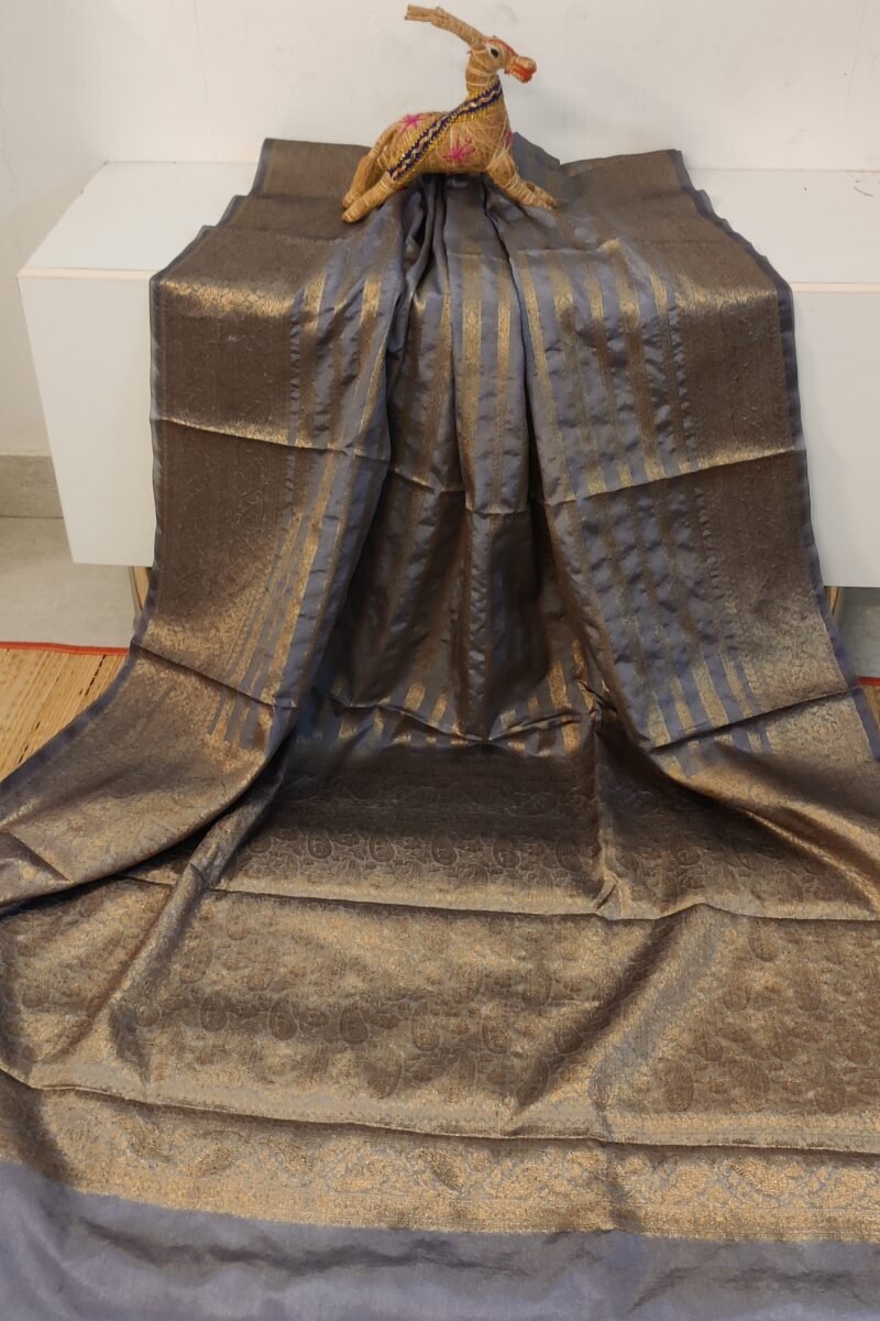 Banarasi Bloom: Soft Grey and Gold Khadi Silk Saree with Banarasi Weave