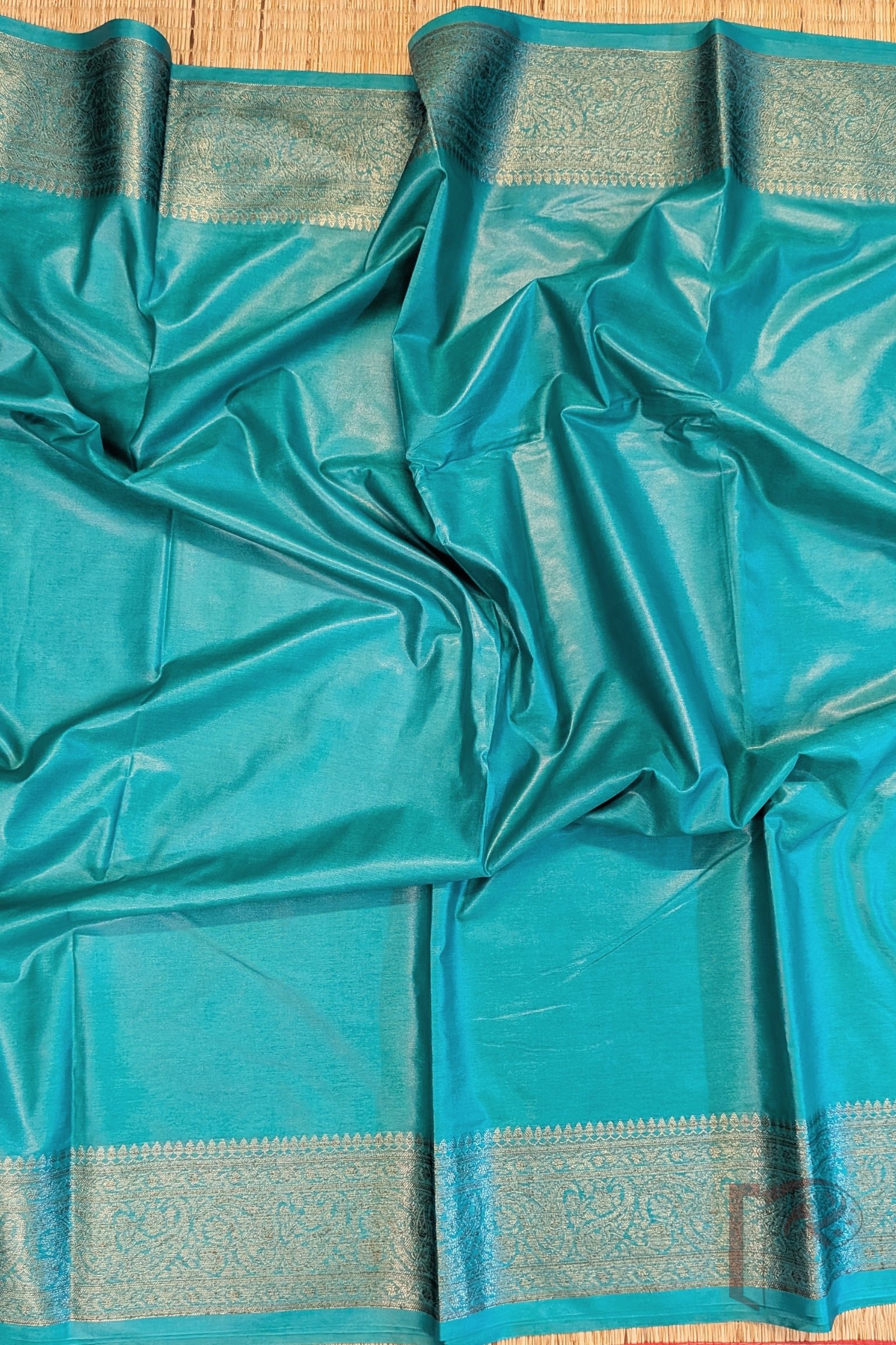 Elegant and enchanting, this teal green Khadi Silk saree brings together the richness of classic Banarasi craftsmanship and the soothing charm of a deep contemporary hue. The saree is adorned with a 4-inch Karwa Banarasi weave border in muted gold, running gracefully along all sides and continuing onto the pallu, creating an exquisite visual harmony. The interplay of teal and gold lends the saree a regal yet understated luminosity, perfect for those who desire elegance without excess. Completing the ensemble is the matching teal blouse, intricately woven with an all-over Karwa Banarasi pattern, elevating the ensemble with its refined detail. This saree is an impeccable choice for festive gatherings, traditional celebrations, weddings, and graceful evening events, offering a look that is both timeless and beautifully sophisticated.