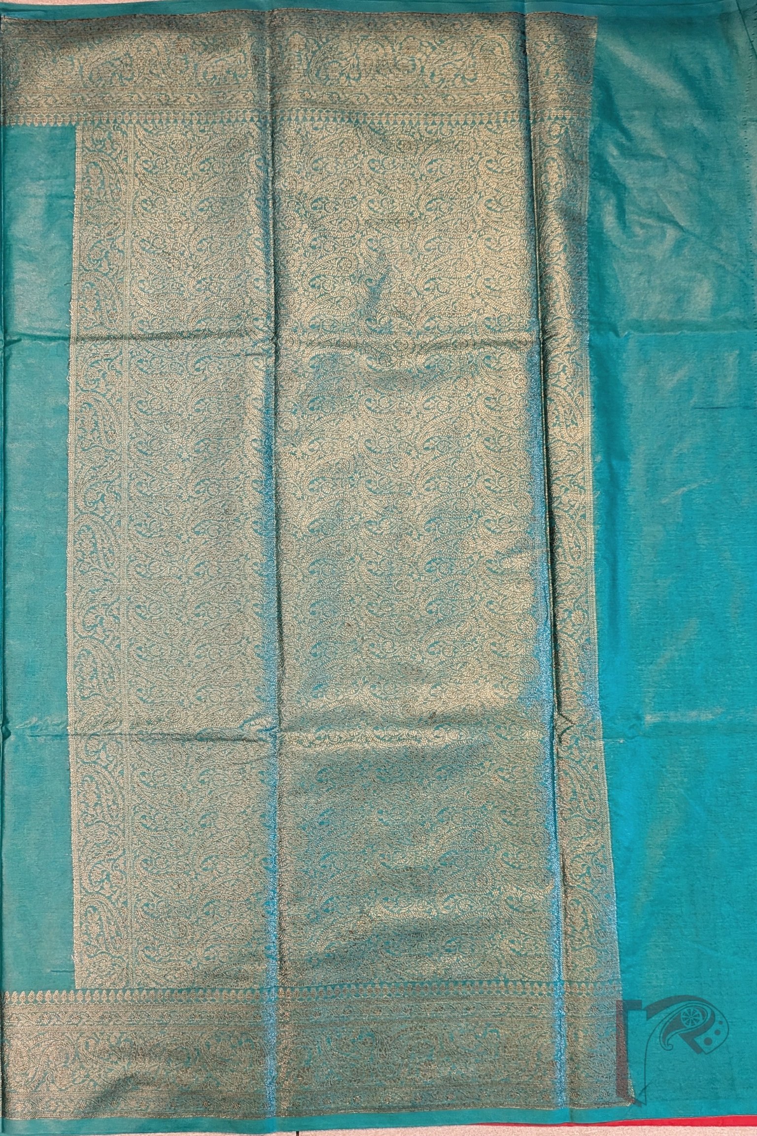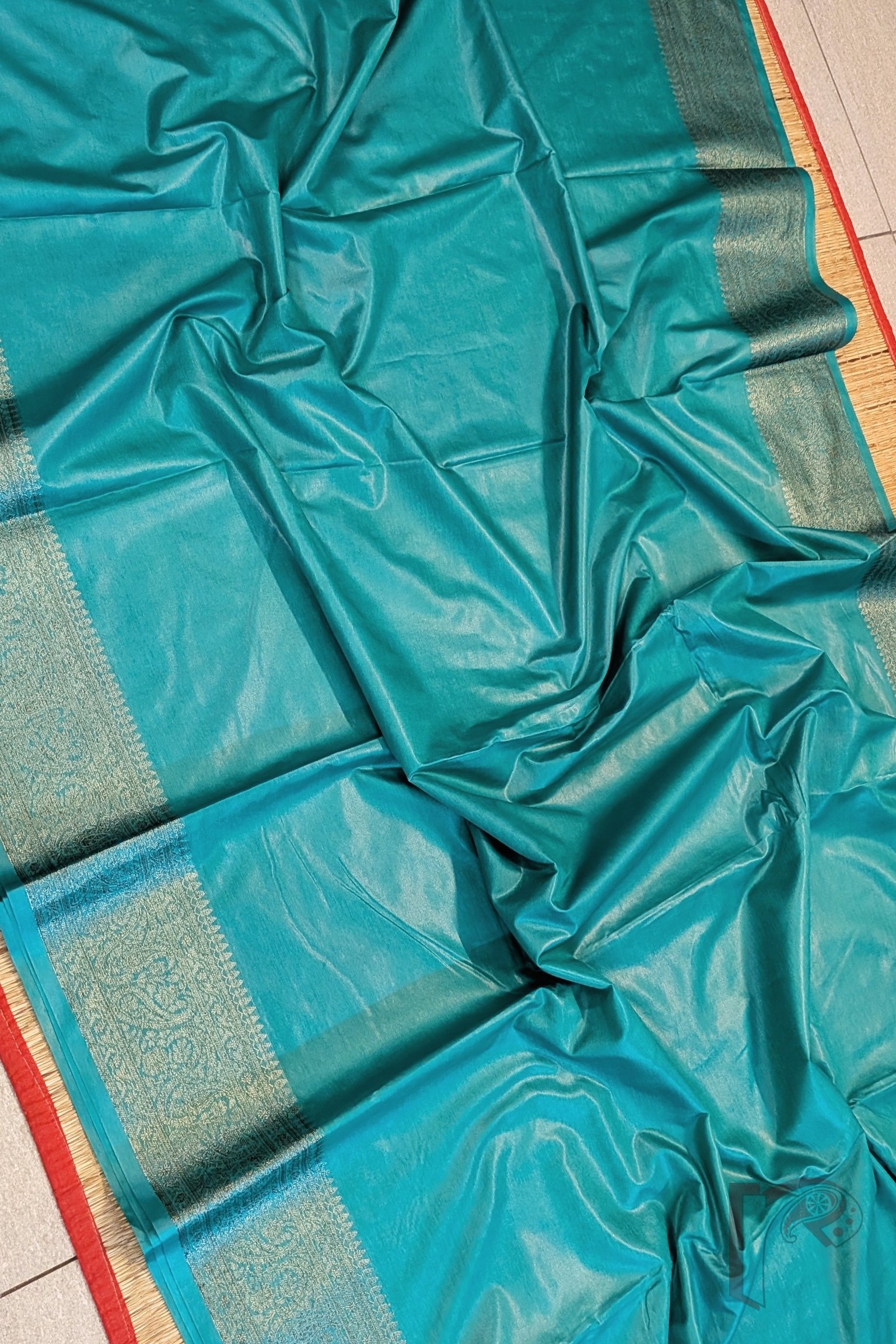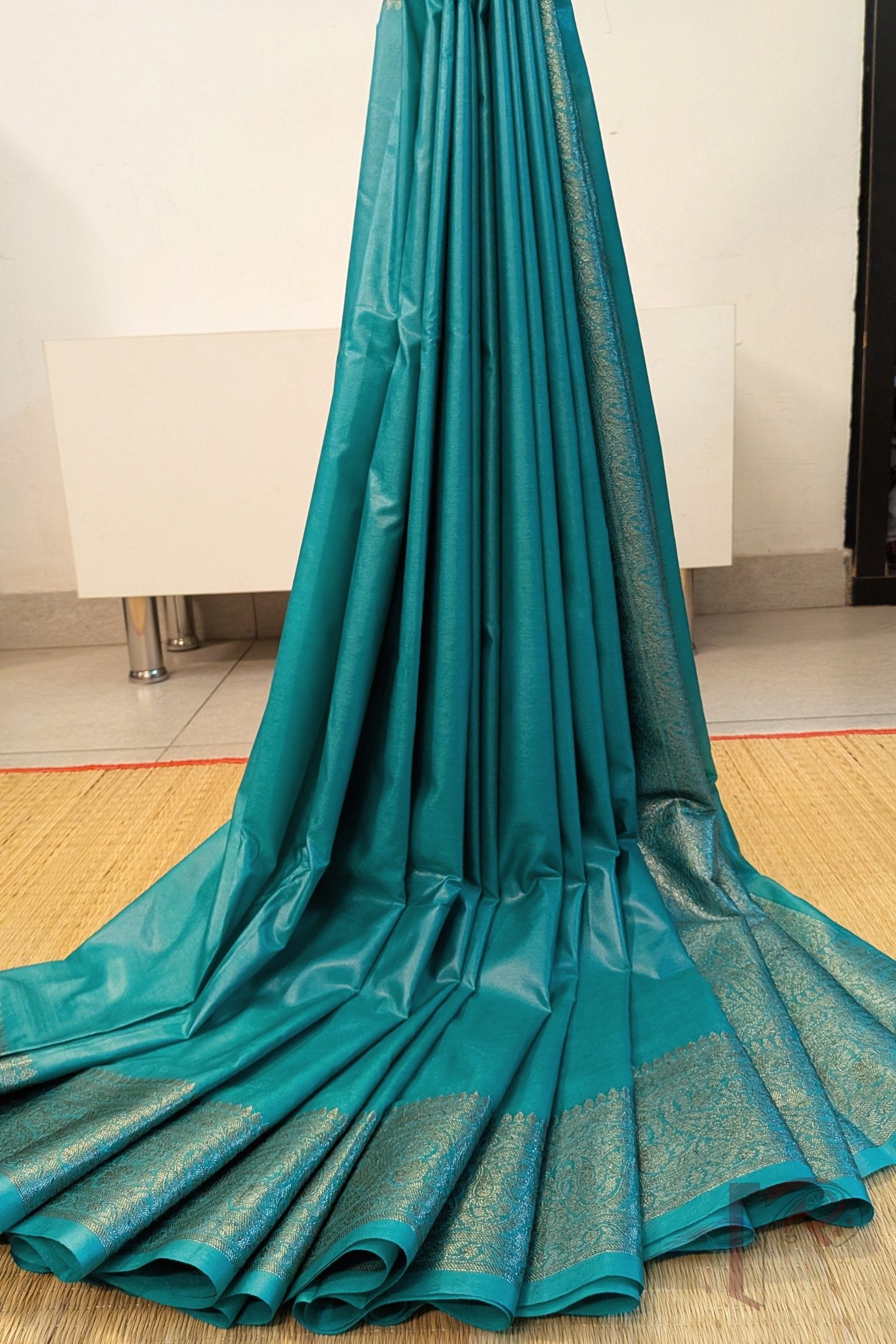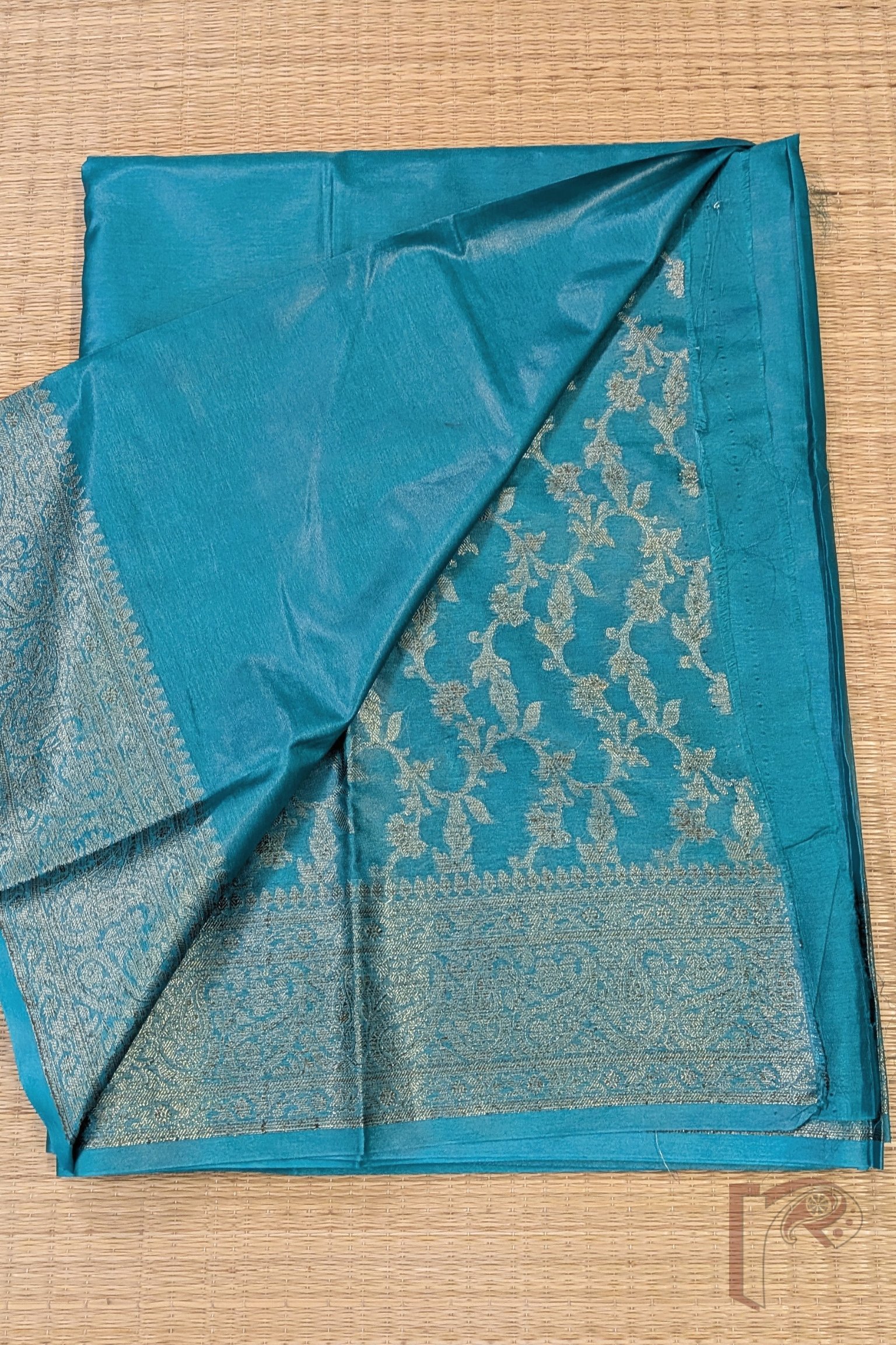 Banarasi Bloom: Teal Green Khadi Silk Saree with 4″ Karwa Banarasi Weave Border and Muted Gold Woven Pallu