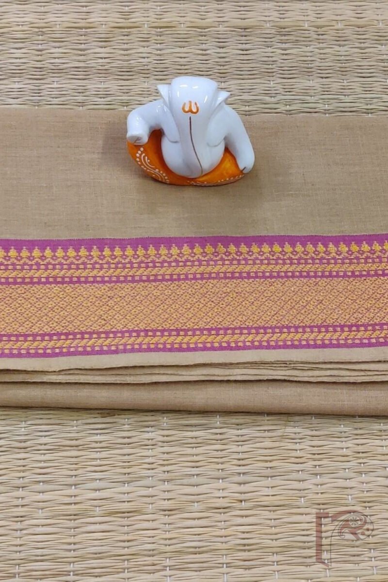 A neutral beige body accented with a rich purplish-pink border featuring yellow thread jaal weave, this Mangalgiri blouse piece is the epitome of grace. The combination of earthy and vibrant tones makes it a versatile pairing for bright or muted sarees. The handloom quality enhances its visual richness.
