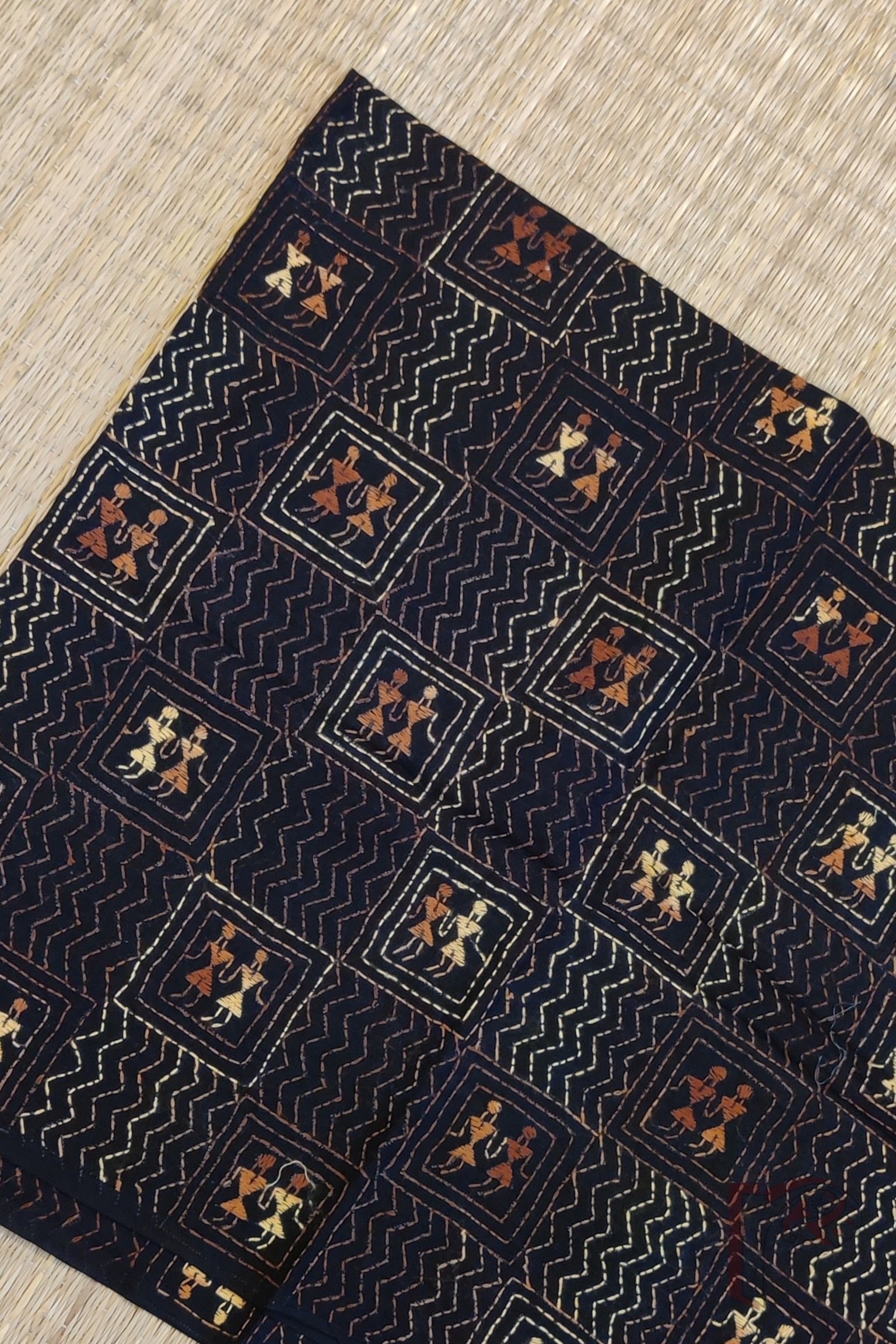 Black Cotton Blouse with Brown and Cream Zigzag and Figure Pattern Full Kantha Embroidery – Unstitched Fabric