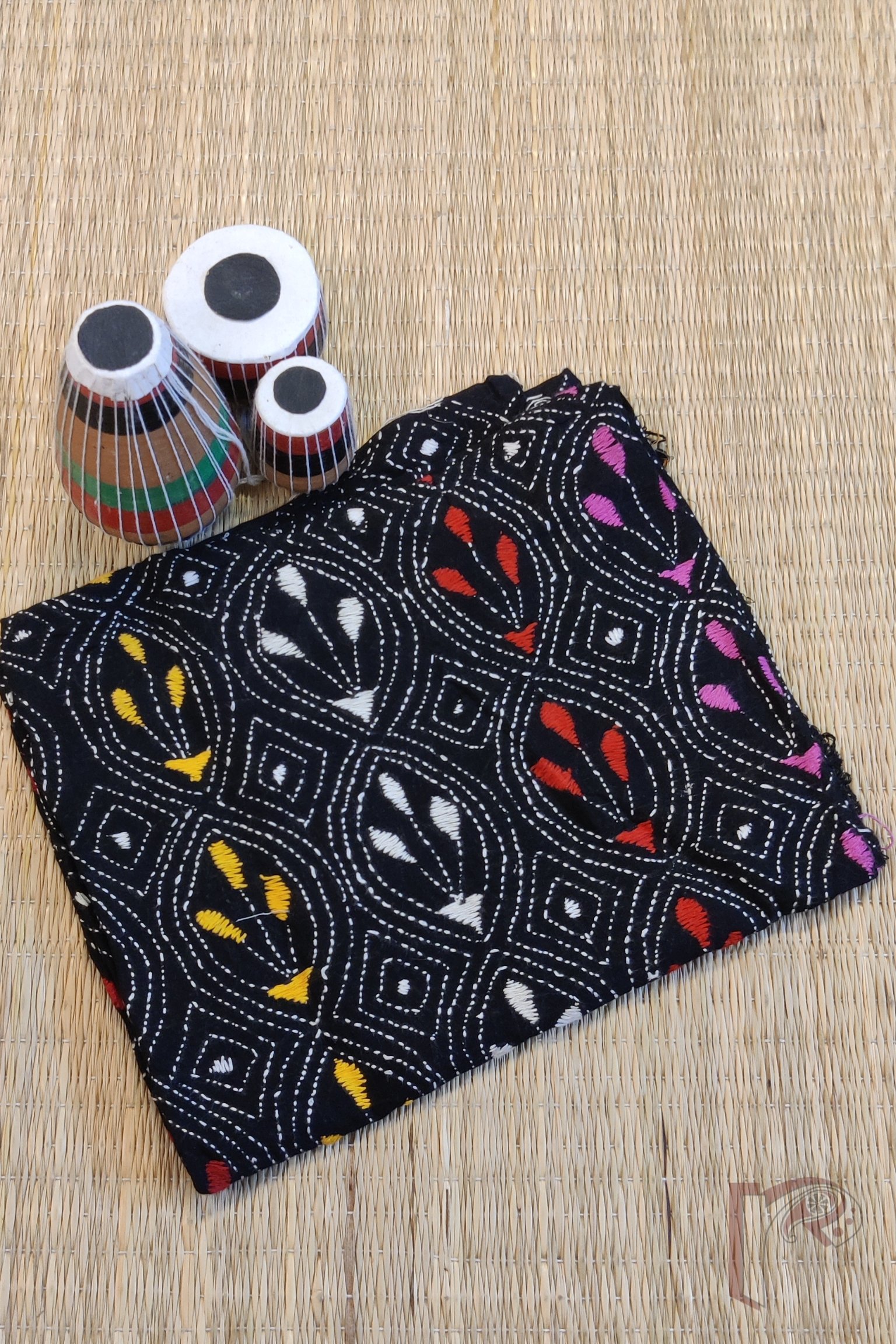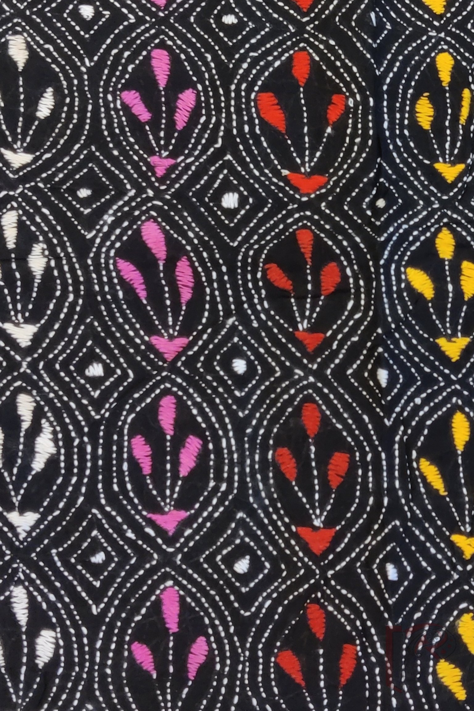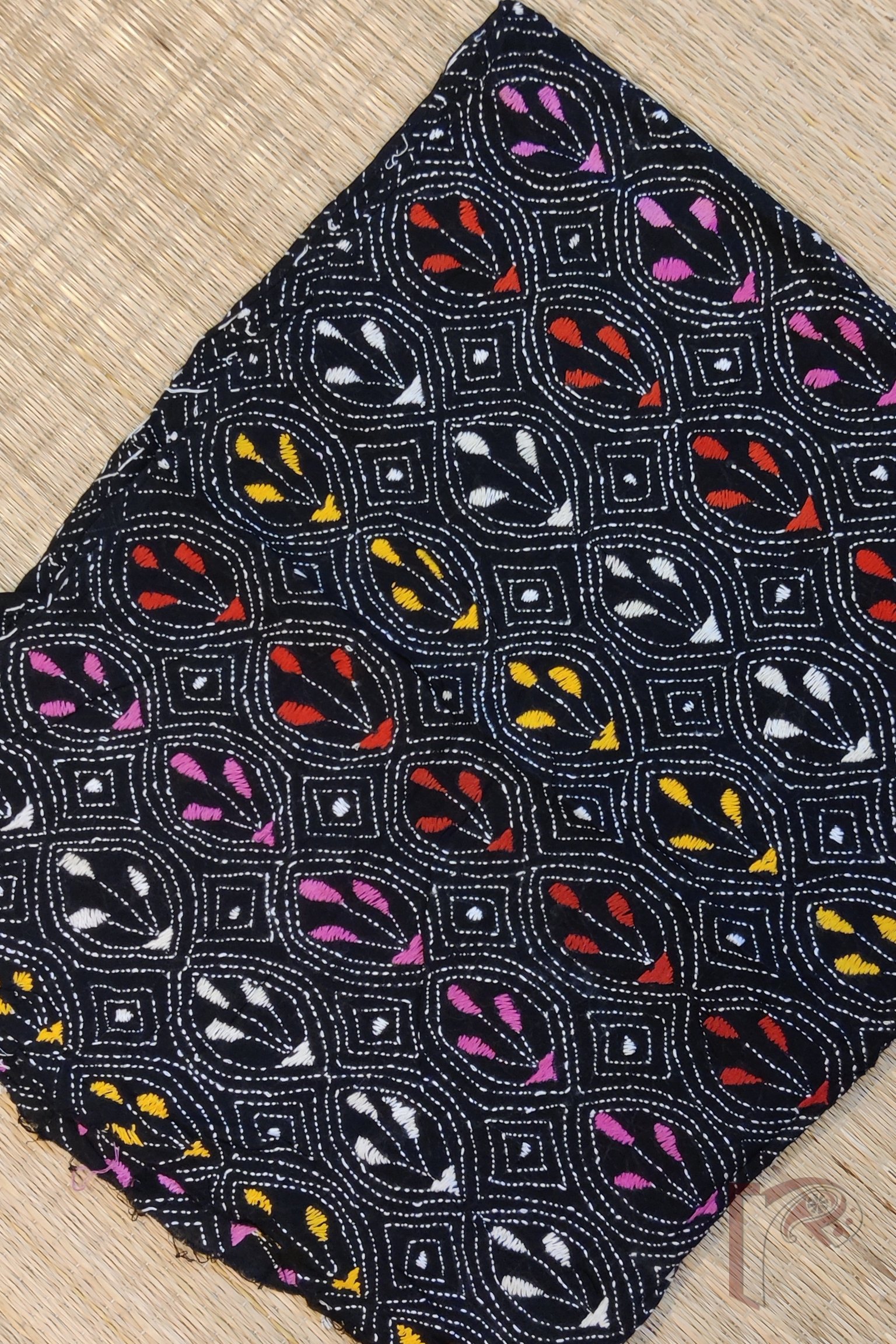 This striking black cotton blouse piece is intricately hand-embroidered with full Kantha continuous stitch in white, forming graceful oval motifs that enclose three-leaf patterns in shades of yellow, red, pink, and white. The design unfolds in an all-over jal pattern, creating a sense of rhythm and elegance across the fabric. Each thread is hand-done with care, resulting in rich surface texture and timeless appeal. Perfect for pairing with vibrant or muted sarees alike, this blouse captures the balance between folk artistry and refined sophistication.