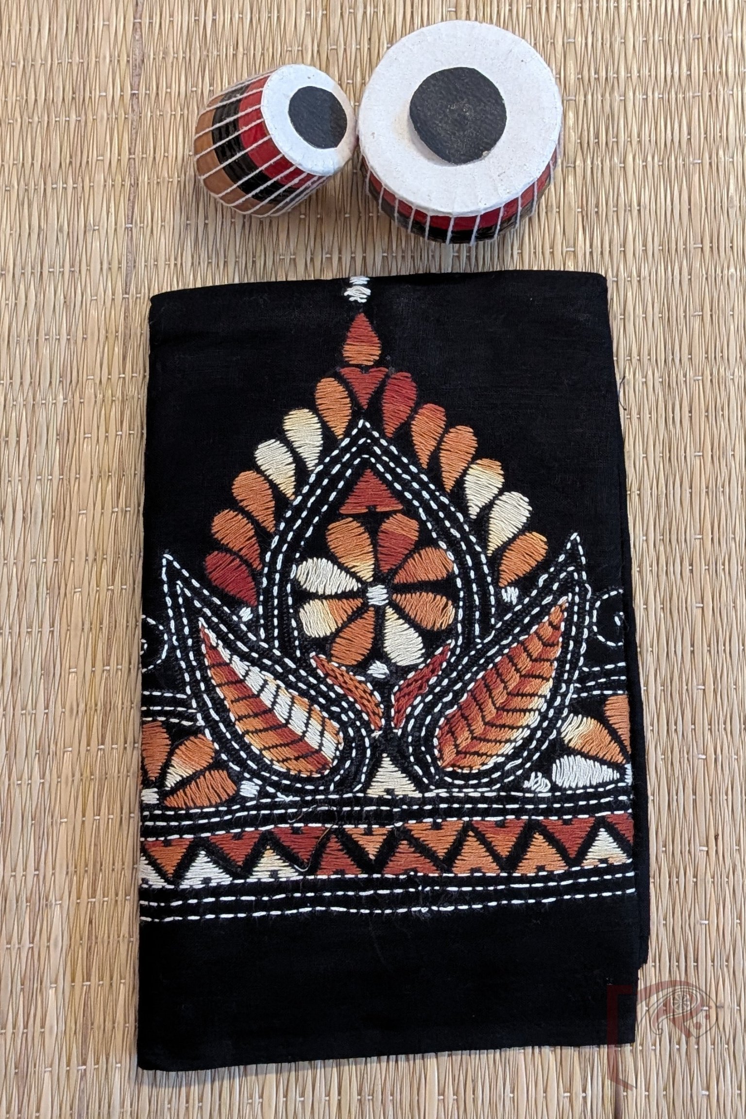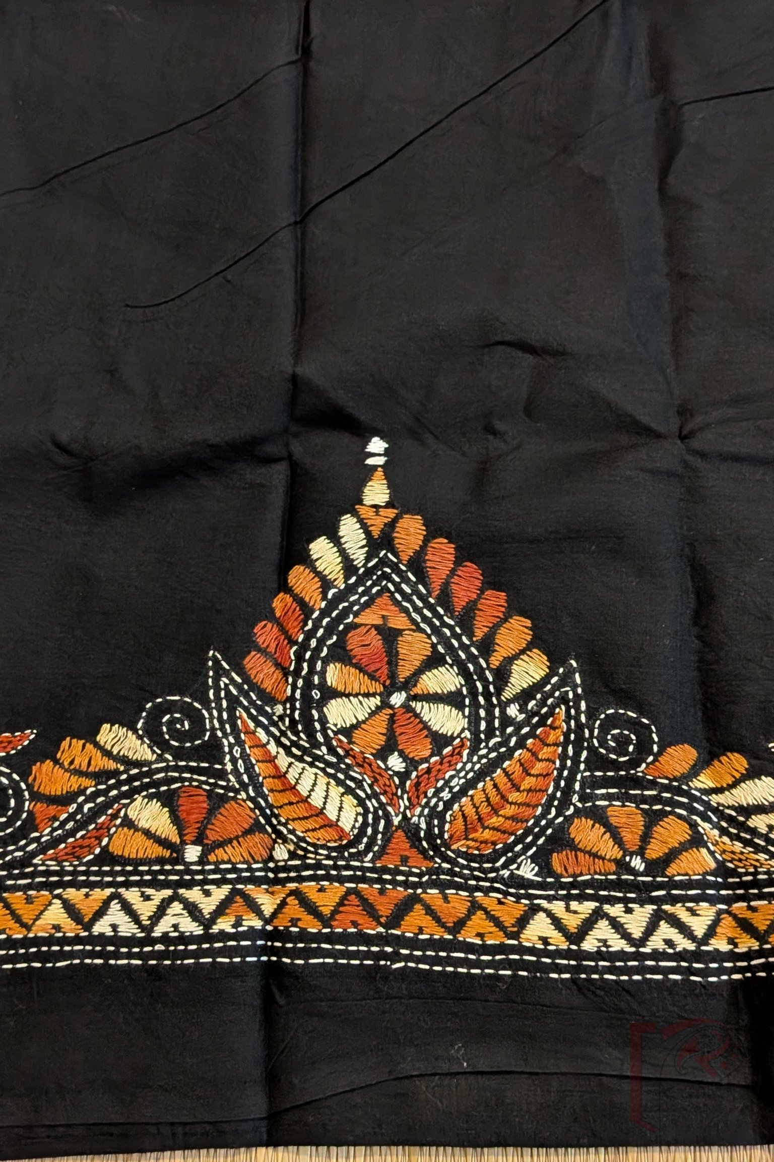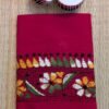 This black cotton blouse piece stands out with its traditional floral and kolka motifs embroidered in soothing shades of brown and cream. The muted thread colours lend a vintage elegance to the deep black base, making the design refined yet visually rich. Crafted for comfort and durability, this piece is ideal for pairing with bold or neutral sarees alike. Its balanced colour palette and detailed hand embroidery make it a graceful choice for lovers of understated ethnic style.