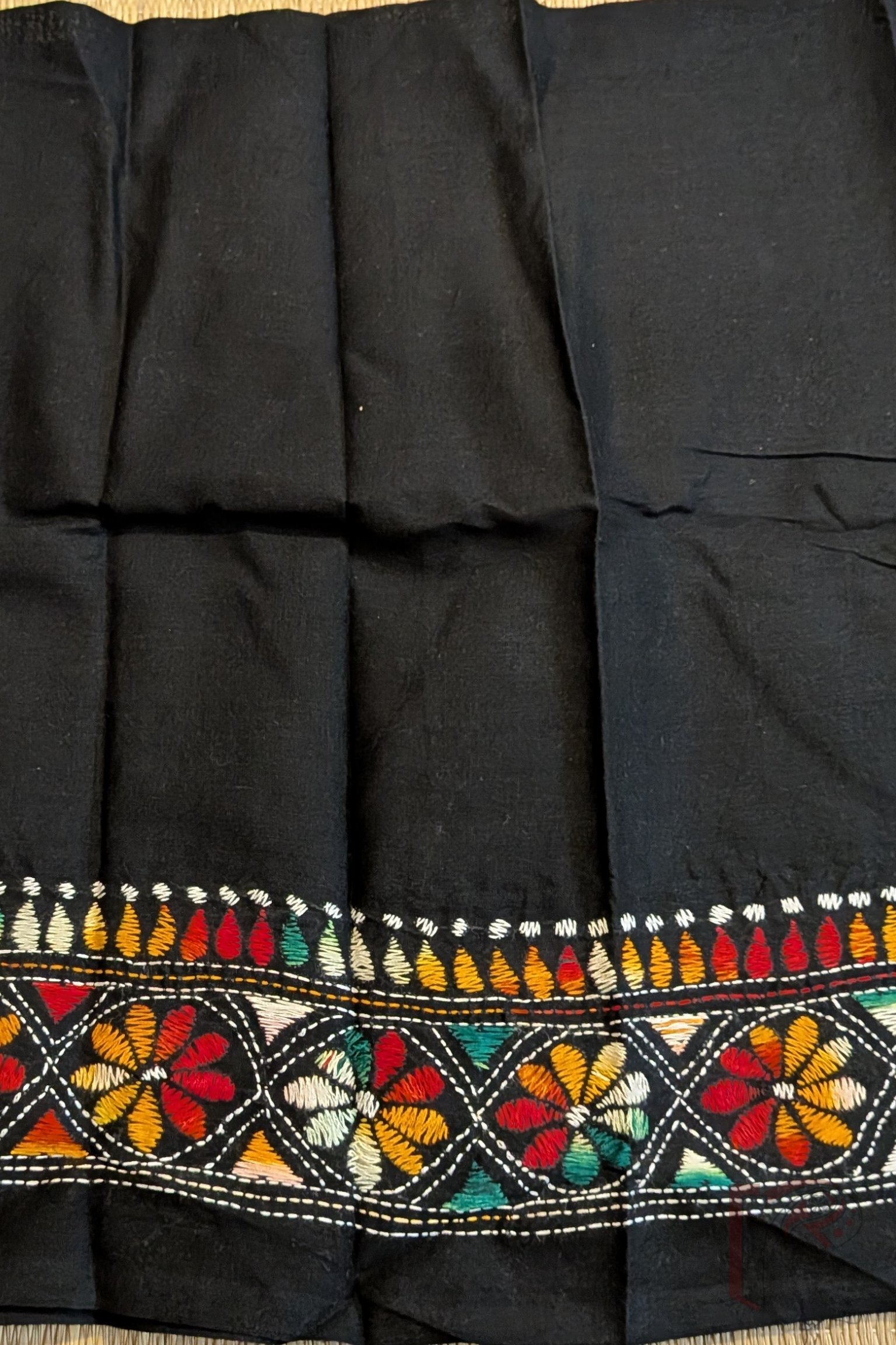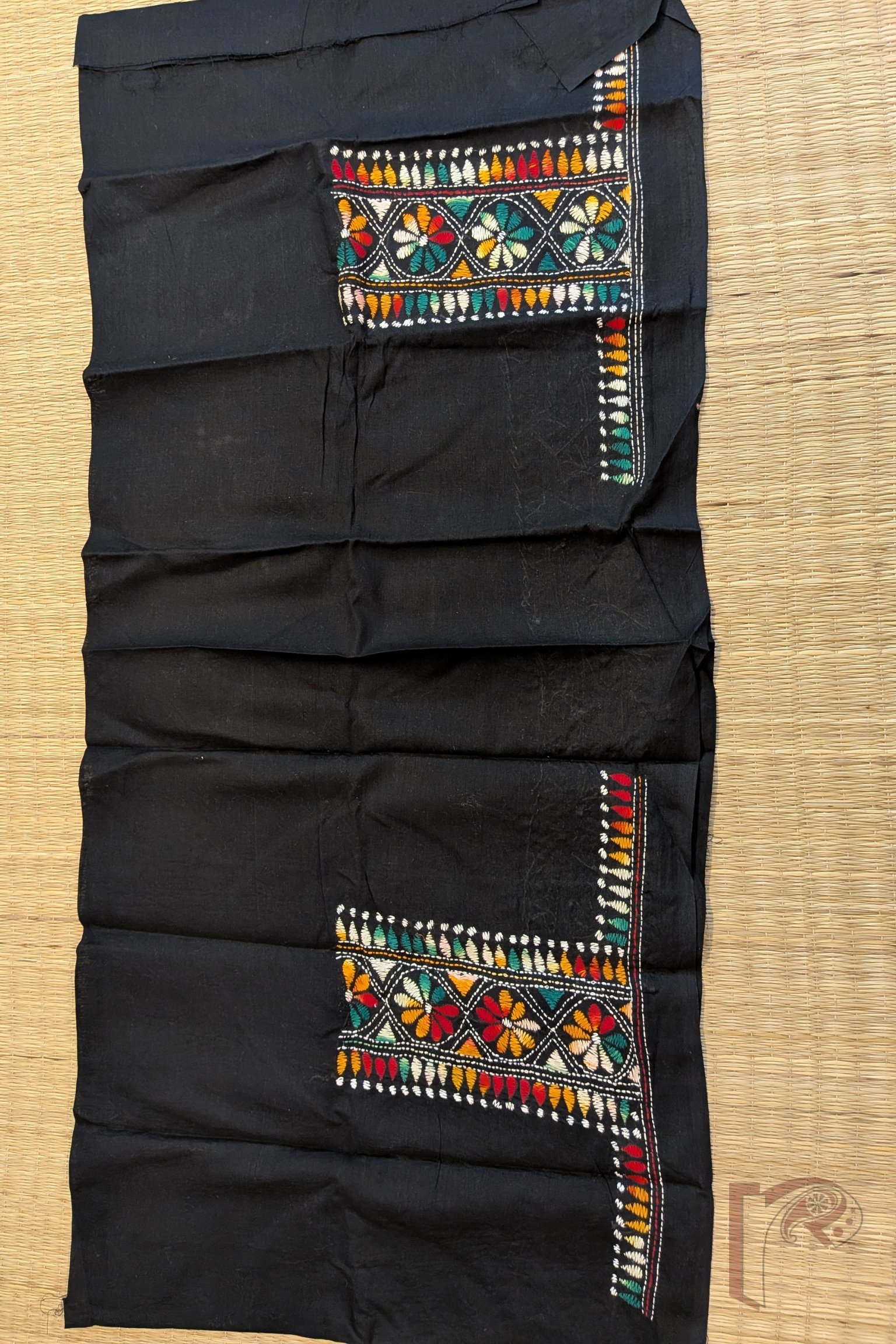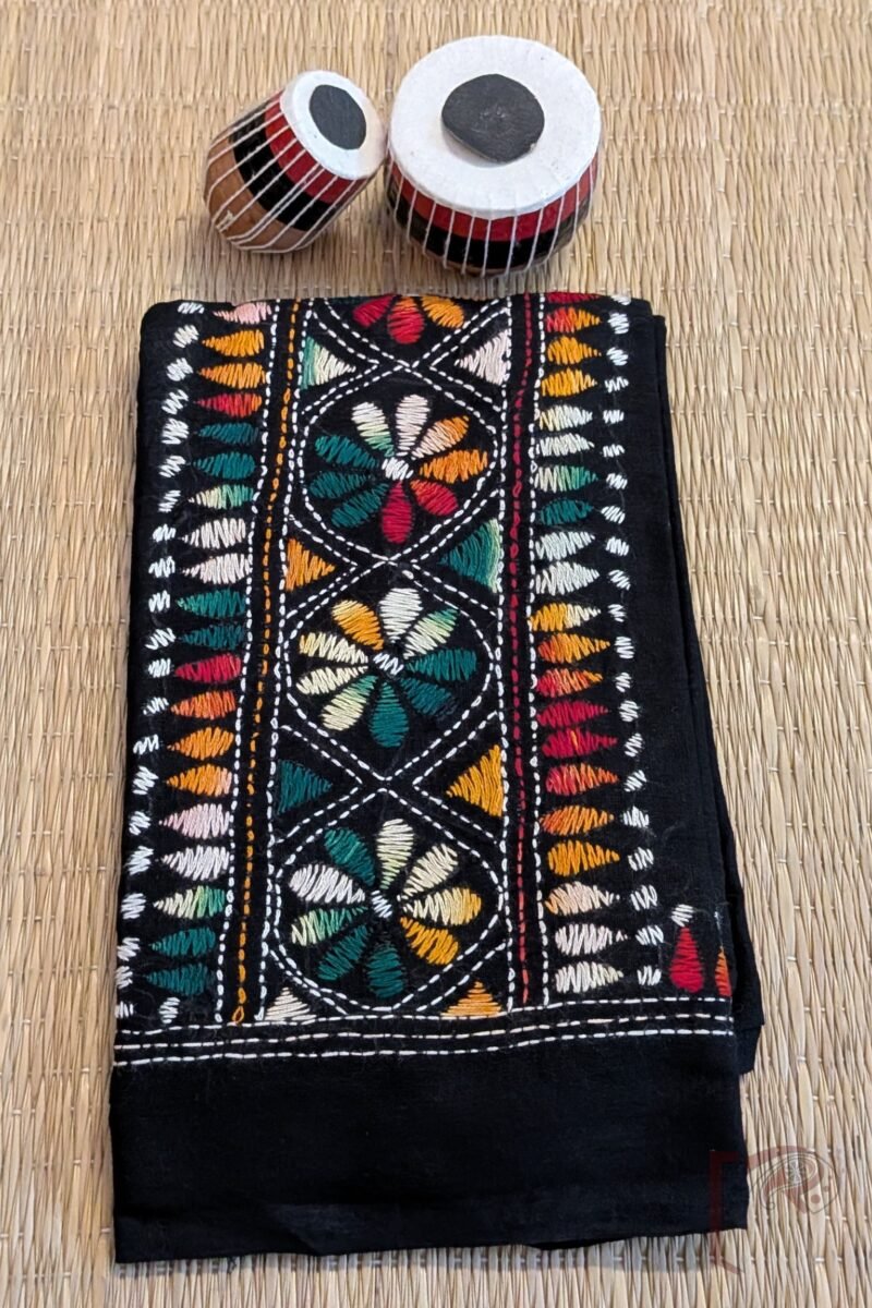 Bold and beautifully detailed, this black cotton blouse piece features pretty kantha embroidery in multicolour threads, designed as an 8-inch vertical border along the sleeves and complemented by a 3-inch horizontal border pattern. The structured placement of motifs adds a contemporary rhythm to traditional hand embroidery. Crafted in breathable cotton, this blouse piece blends strong visual impact with everyday comfort, making it ideal for statement saree pairings. The vibrant threads against the black base celebrate kantha’s graphic elegance and artisanal depth.