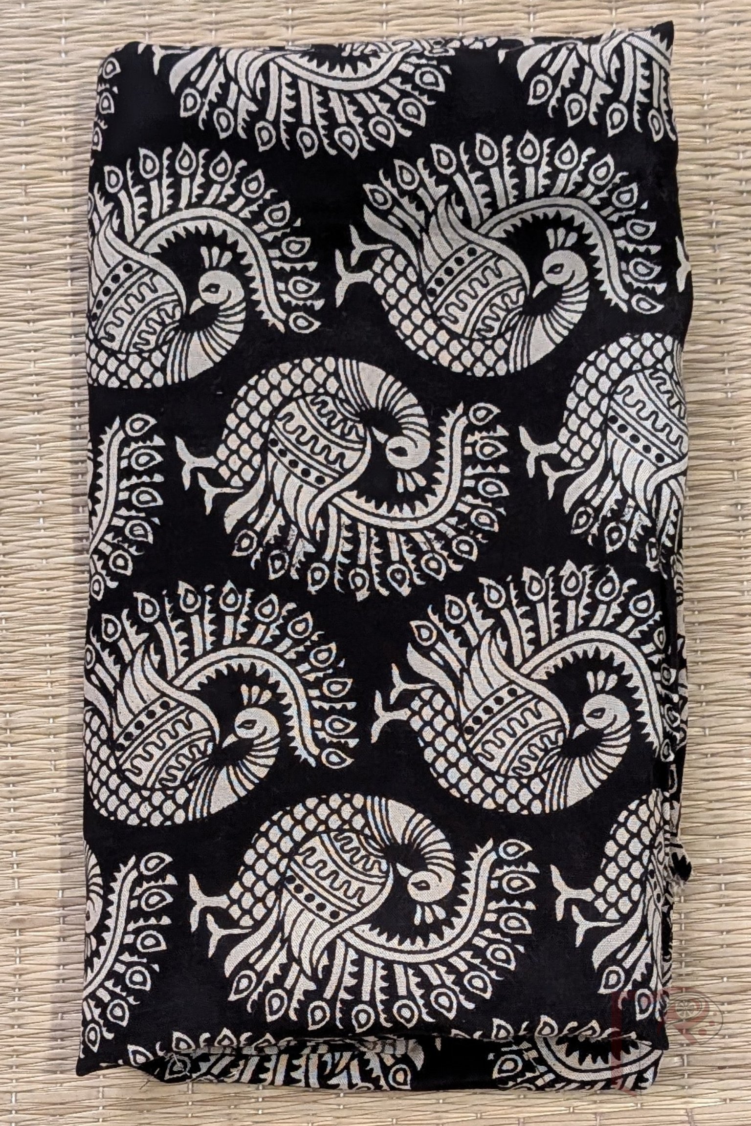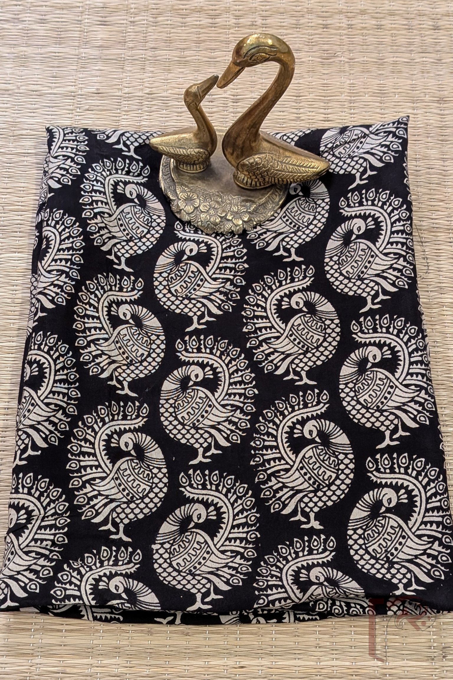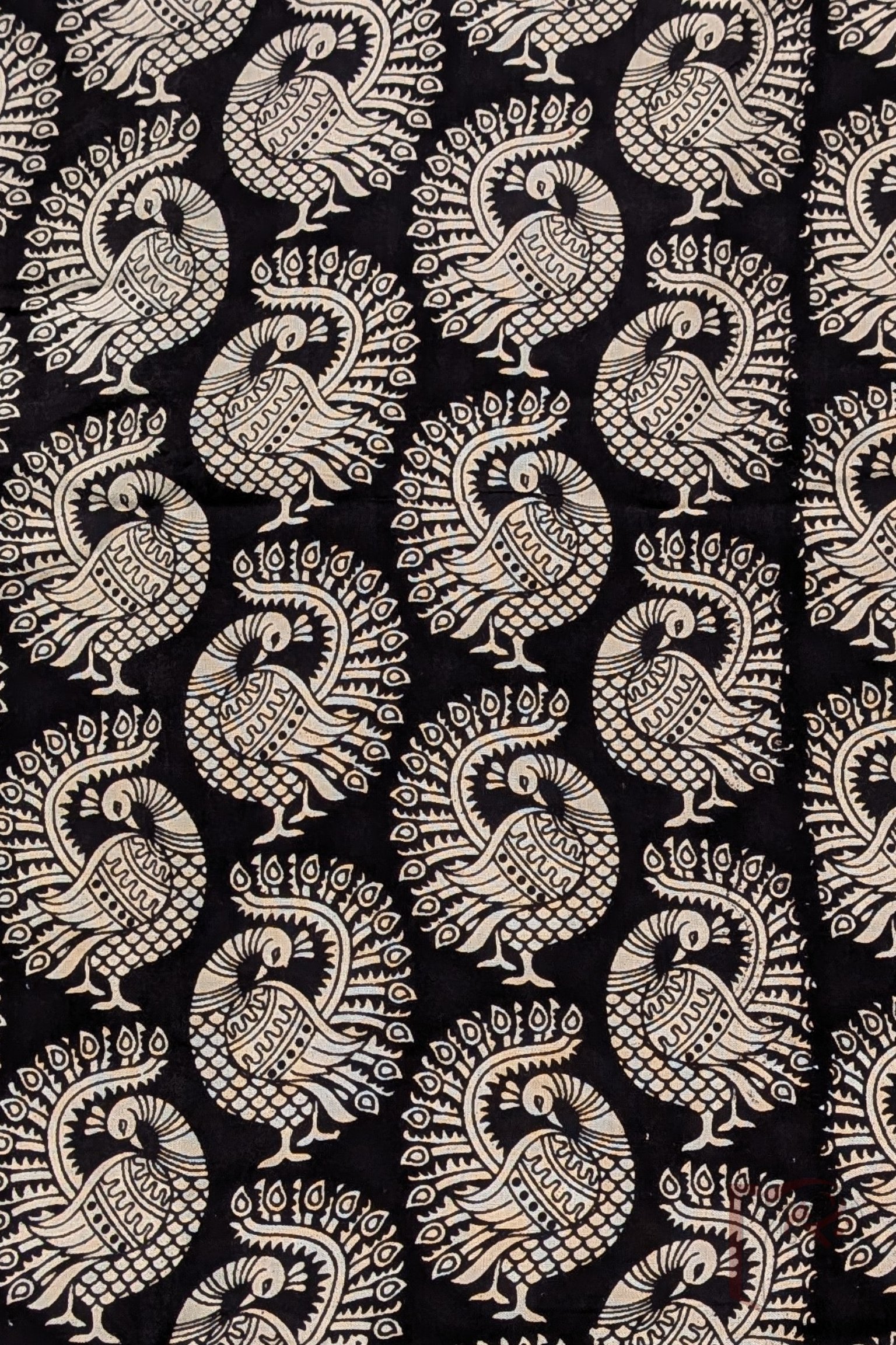 A timeless black cotton silk Kalamkari blouse showcasing peacock motifs arranged in consecutive order, printed in cream and defined with black outlines for refined clarity. The flowing sequence of peacocks adds rhythm and continuity to the design, symbolizing beauty and grace. The luxurious black base enhances the contrast, giving the blouse a sophisticated appeal. Made from soft cotton silk with smooth texture and gentle shine, it delivers both elegance and comfort. The repeating avian pattern creates a look that is graceful, bold, and beautifully traditional, ideal for statement saree pairings.