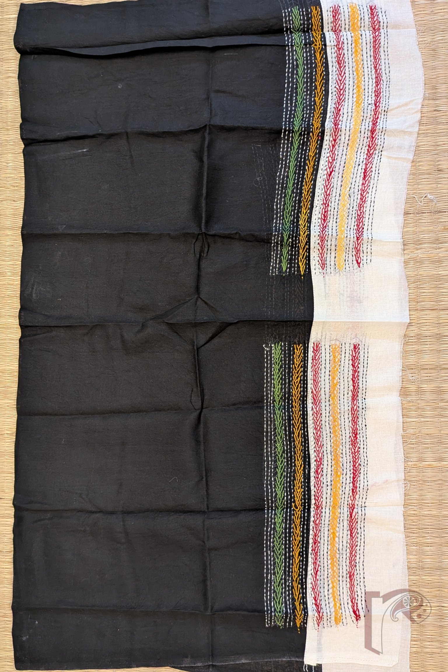 This classic black cotton unstitched blouse piece is elevated with a crisp white cotton attached border, offering timeless contrast. The blouse is adorned with multicolour hand embroidery, adding softness and visual interest to the dark base. Versatile and breathable, it pairs effortlessly with almost any saree, making it a wardrobe essential. A design that blends bold colour with delicate craftsmanship.