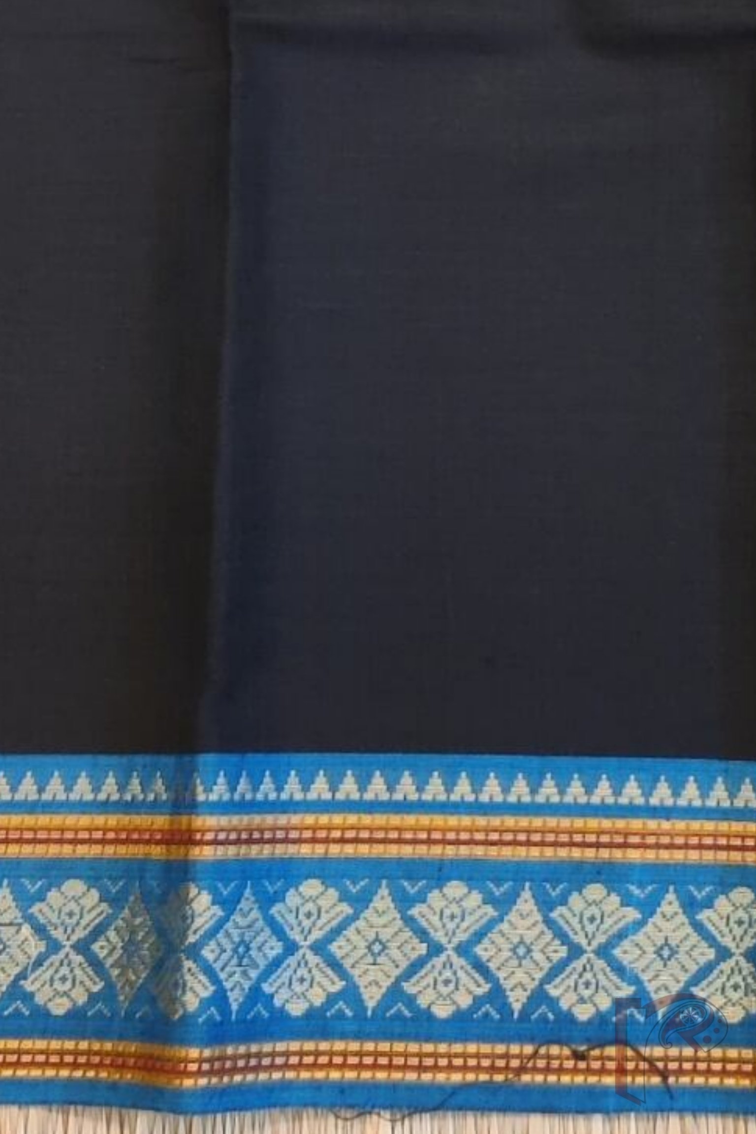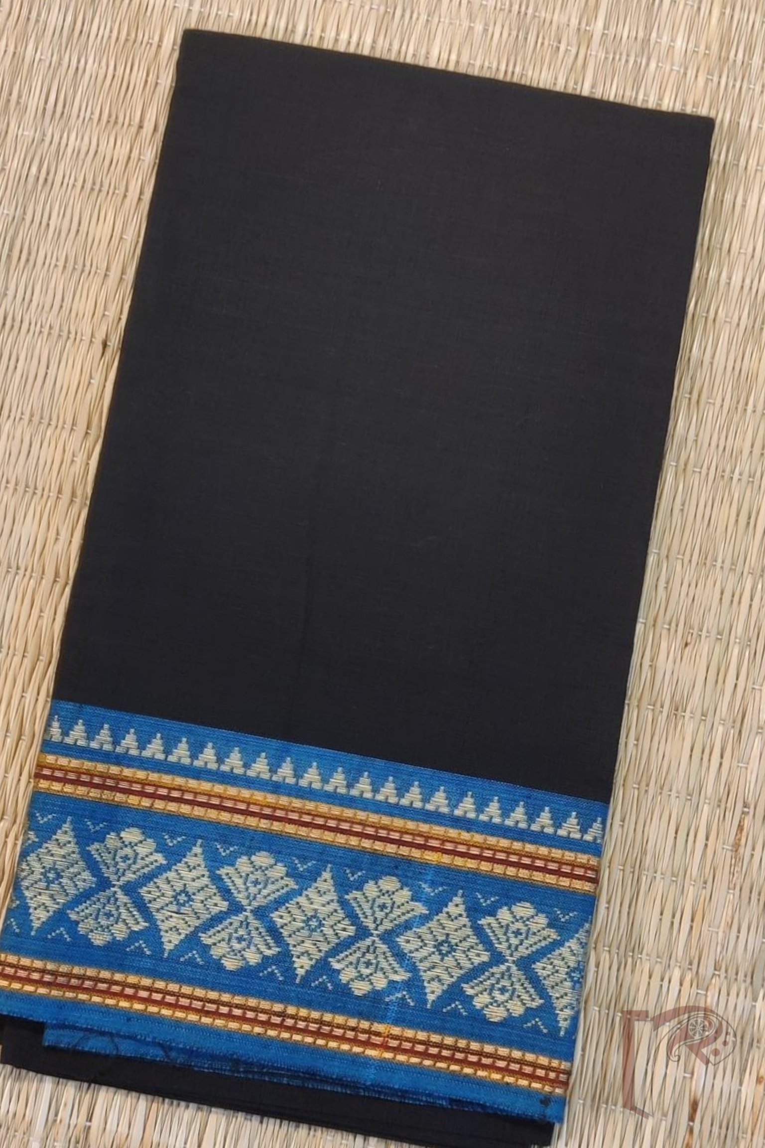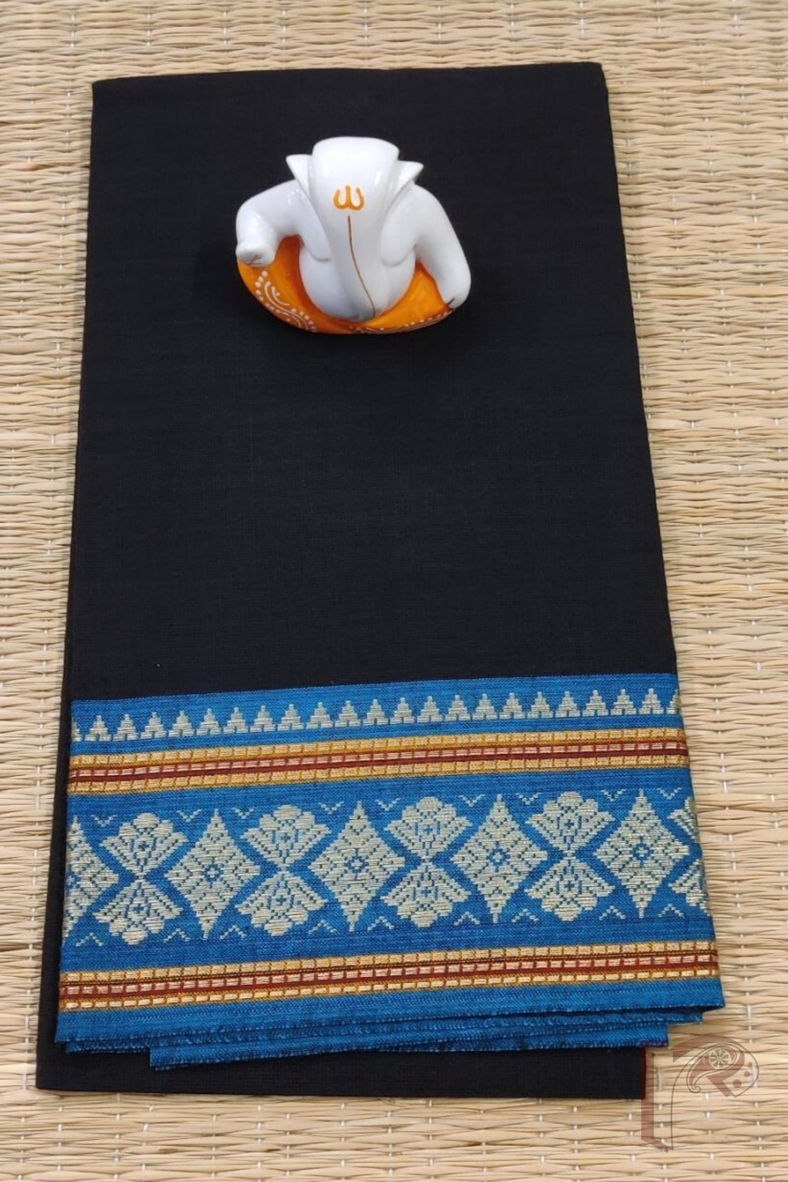 An elegant black Mangalgiri cotton fabric that features a striking light blue border with cream temple motifs, floral patterns, and fine yellow stripes. This piece is rich in traditional detailing and ideal for contrast styling with solid or printed sarees. The fine handloom finish adds structure, while the temple border lends a classic South Indian touch.