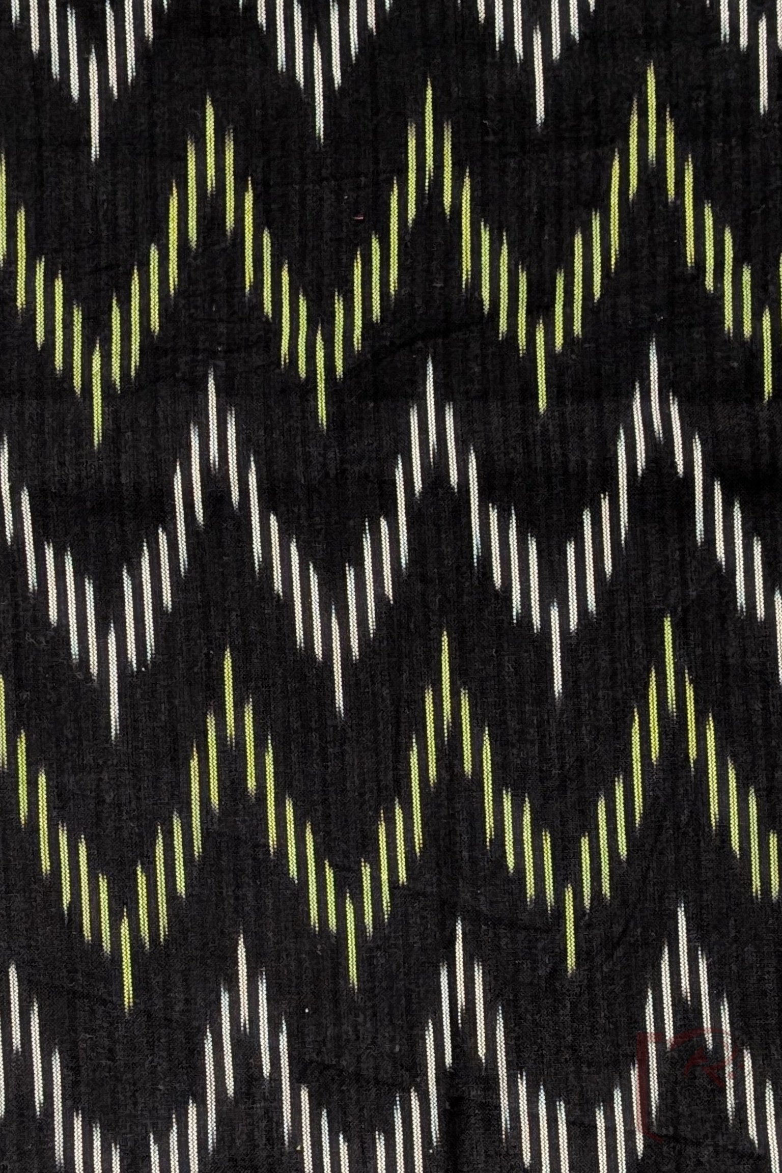 Bold and visually striking, this black cotton Ikkat blouse piece features small white and green dashes meticulously arranged to form a dynamic zigzag pattern. The rhythmic flow of the zigzag design creates movement and contrast against the deep black base, making it a statement fabric for standout ensembles. The subtle infusion of green alongside white adds freshness and dimension to the design. Woven using authentic Ikkat dyeing techniques, the motifs carry a handcrafted charm that elevates its appeal. Made from soft, skin-friendly cotton, this blouse piece offers both durability and comfort, making it a powerful addition to festive and evening wear collections.