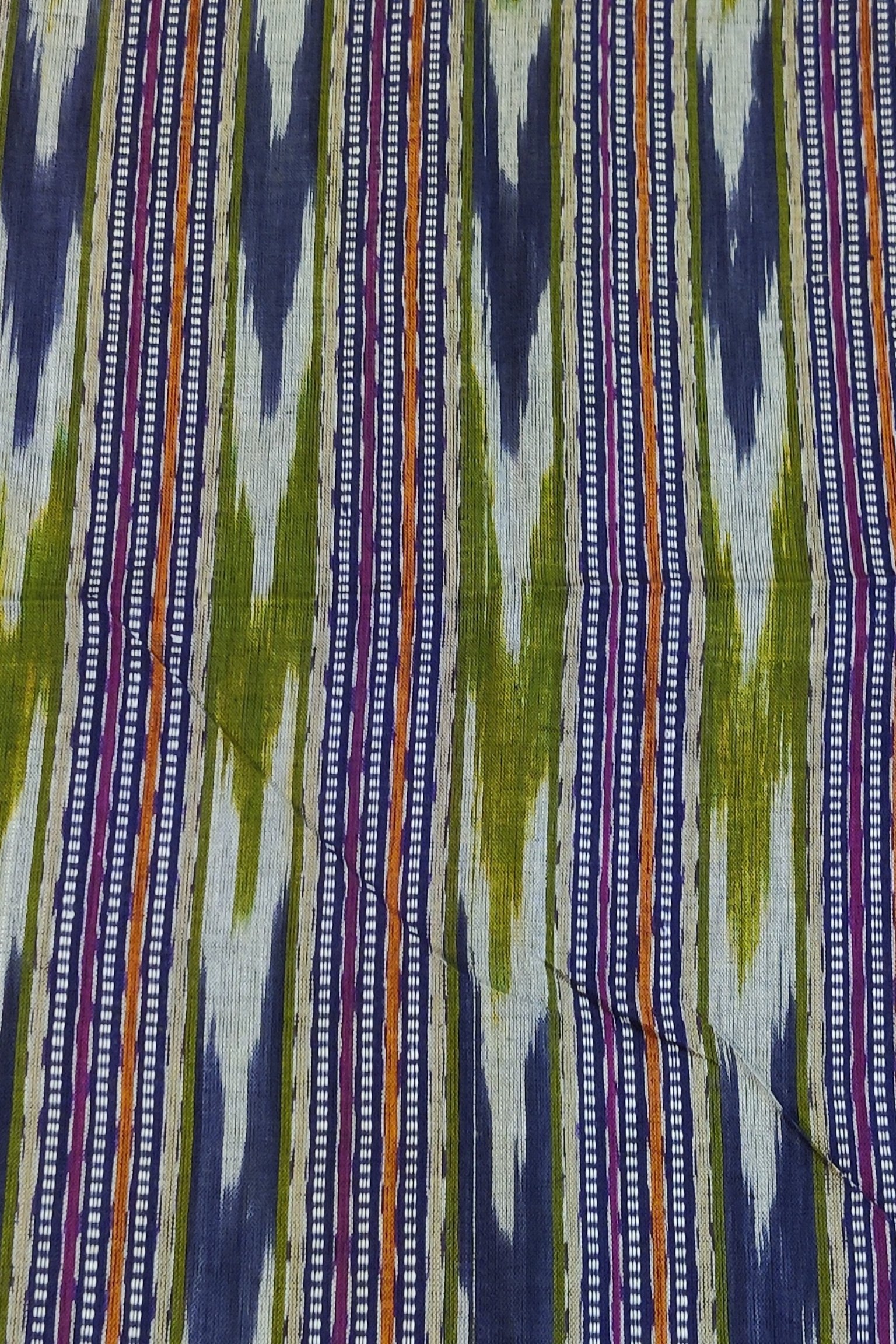 A vibrant blue, mehandi green and grey Sambalpuri blouse piece featuring 1 inch orange and pink stripes highlighted with fine white thread weaving. The colorful accents bring life to the muted base tones, creating a lively yet elegant textile. The ikkat like pattern is evenly woven making it suitable for stylish blouse cuts. Bright contrast stripes, breathable cotton texture and traditional handloom weaving give this fabric its distinctive charm.