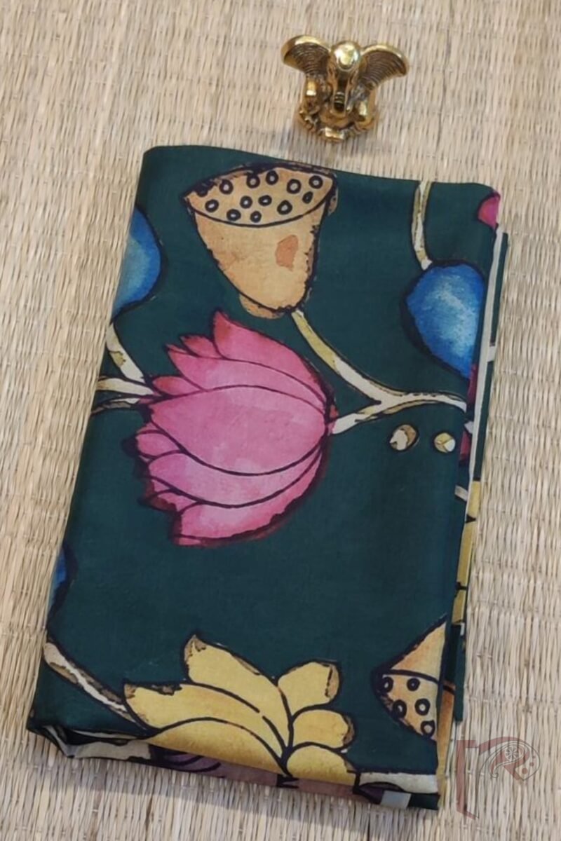 Bottle Green Dupion Silk Blouse with Kalamkari Flowers and Olive Blue Leaves