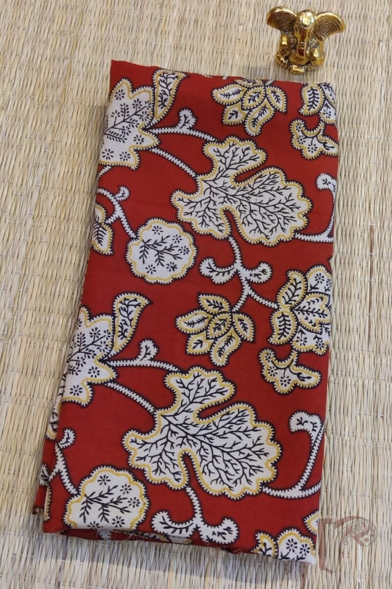 This striking brick red mercerised cotton blouse material features a graceful lotus flower and leaf pattern in cream with hints of yellow and fine black outlines, adding depth and definition to the design. The mercerised finish lends a smooth texture and subtle sheen, making the fabric both durable and elegant. Perfect for pairing with traditional handloom or silk sarees, this blouse piece celebrates timeless motifs while offering a vibrant, sophisticated look.