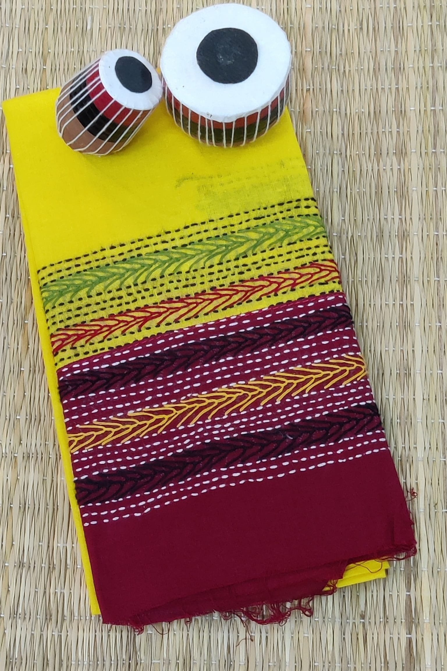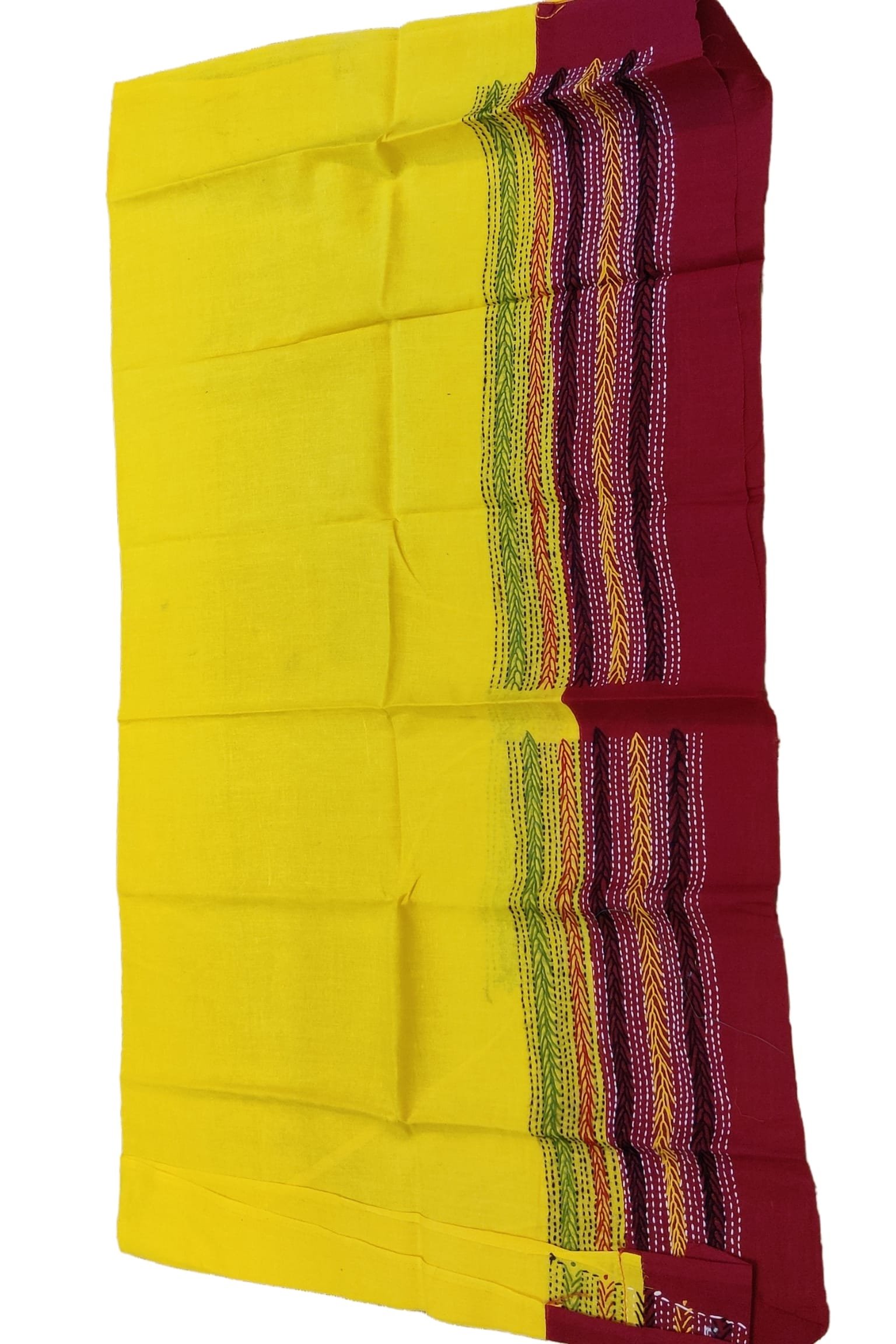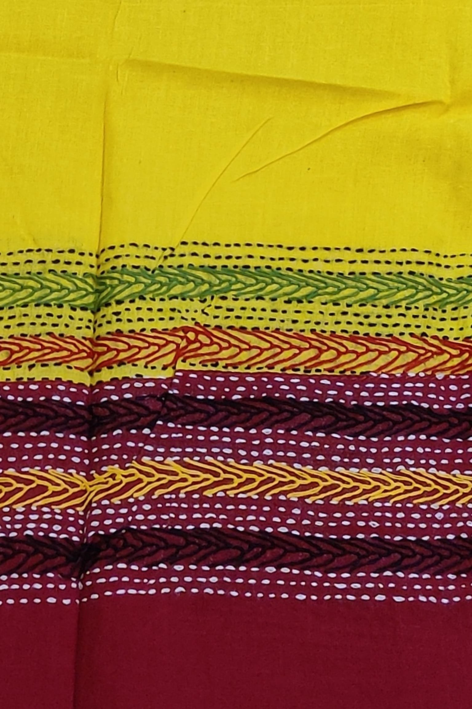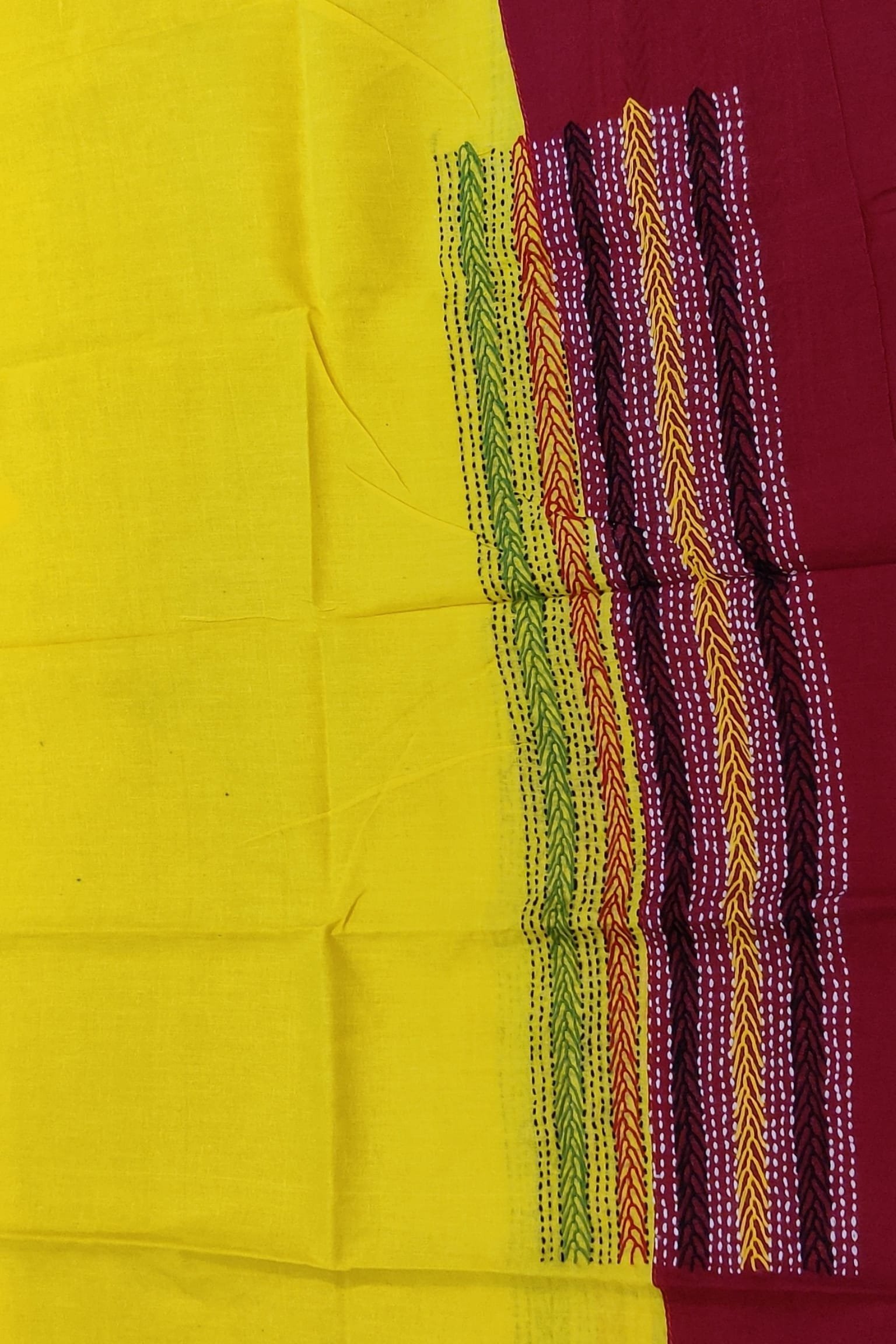 This vibrant bright canary yellow cotton blouse is beautifully accented with a contrasting maroon cotton attached border, creating a bold and eye-catching combination. The blouse piece is delicately hand embroidered in multicolour threads, adding texture and artisanal charm to the bright base. Designed to be both striking and versatile, this piece can be effortlessly paired with handloom, printed, or plain cotton sarees. The breathable cotton fabric ensures comfort while the colourful embroidery lends a lively handcrafted elegance, making it a smart mix-and-match blouse for both casual and festive styling.