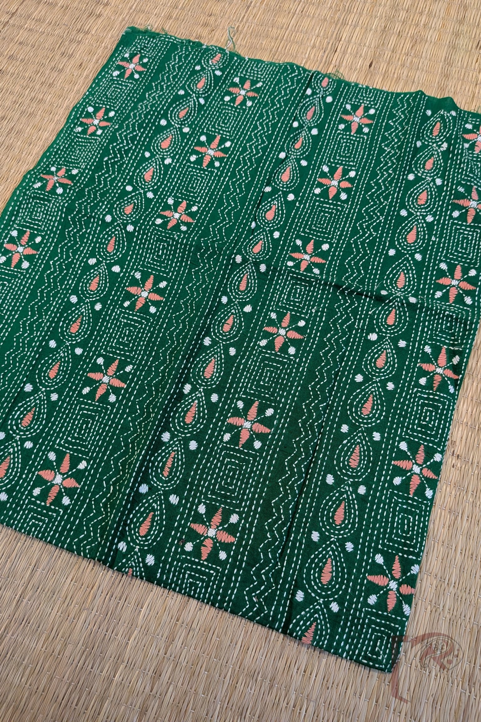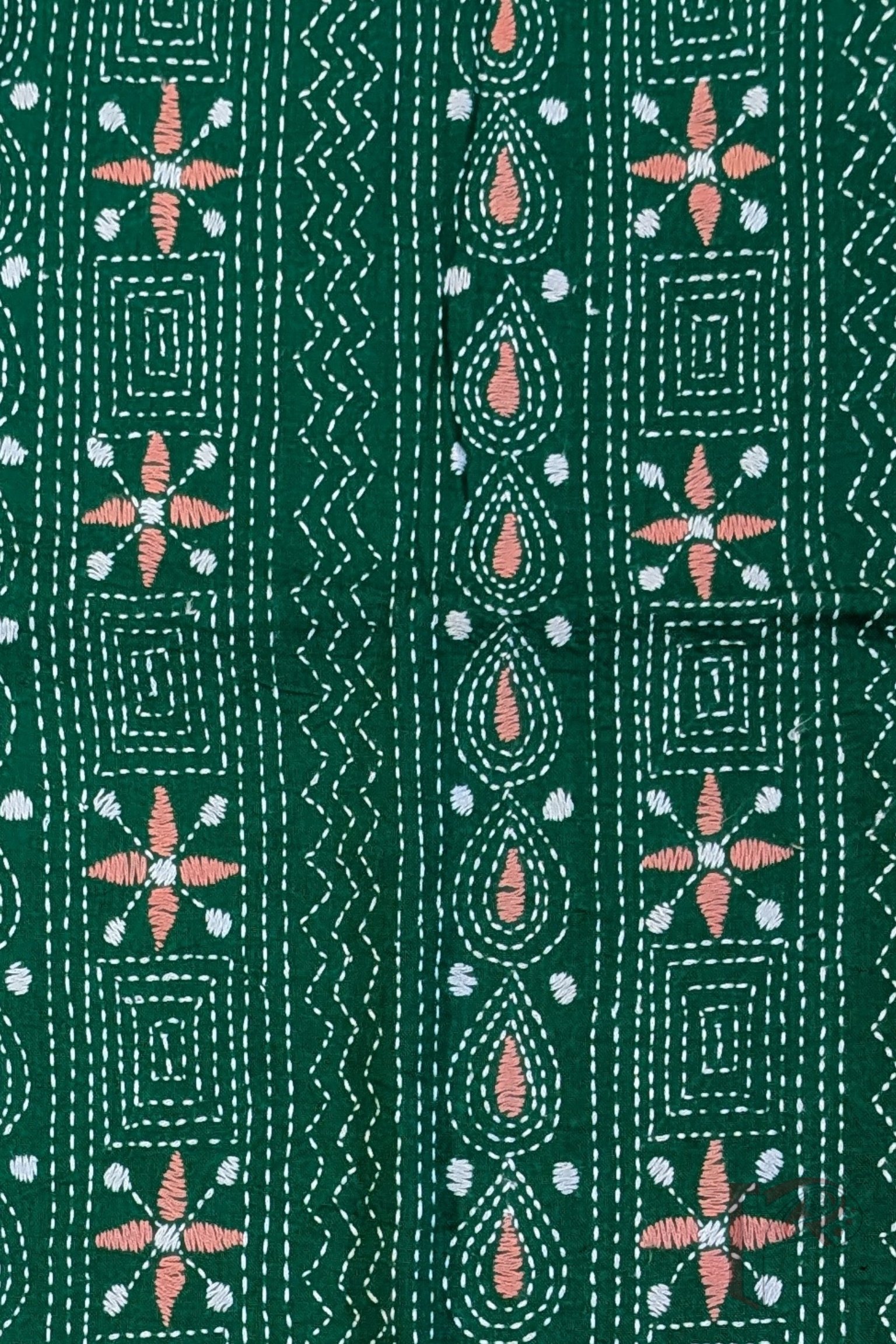Bright Green Cotton Blouse with White Geometric Kantha and Peach Floral Motifs