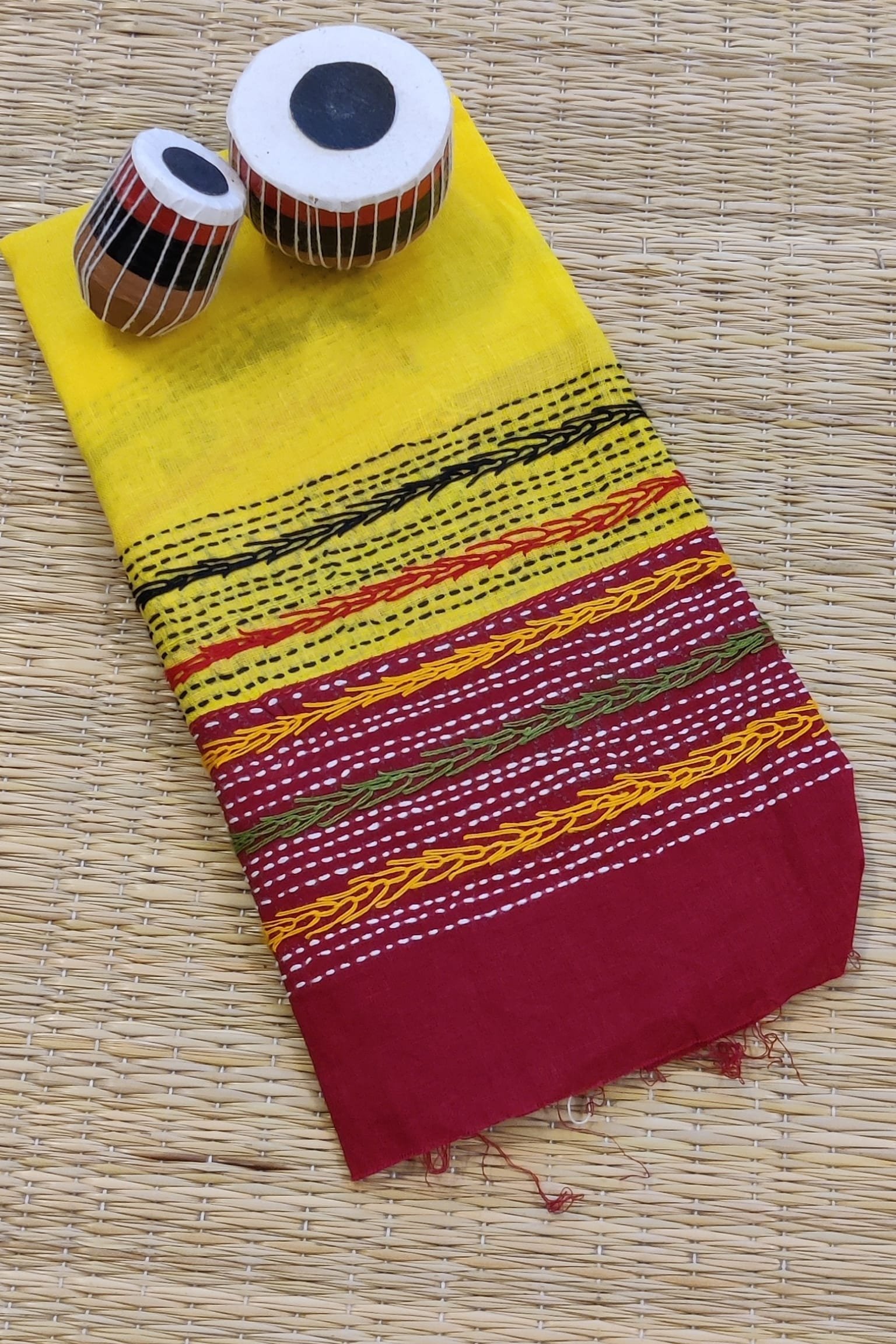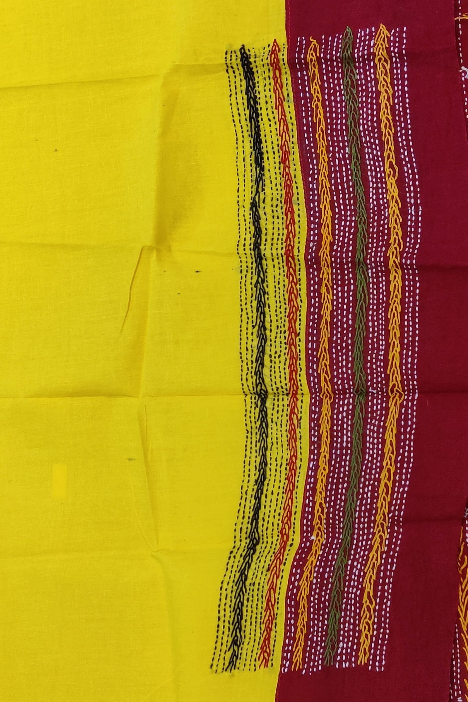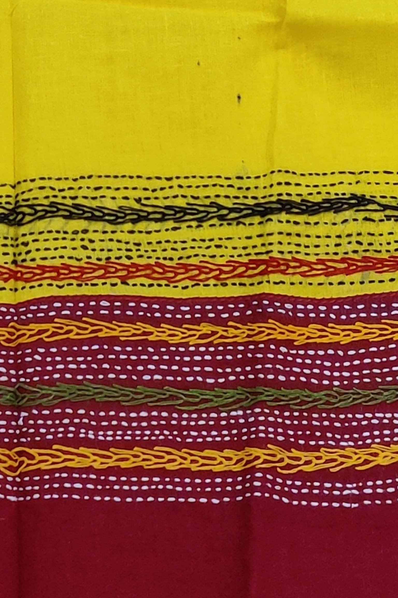This eye-catching bright yellow cotton blouse features a deep maroon cotton attached border, creating a rich and traditional contrast. The blouse piece is beautifully enhanced with multicolour hand embroidery, adding dimension and handcrafted detail. Soft cotton ensures breathable comfort, while the vibrant palette makes it easy to mix and match with a variety of sarees. The design reflects a lively fusion of colour and craft, perfect for statement ethnic styling.