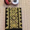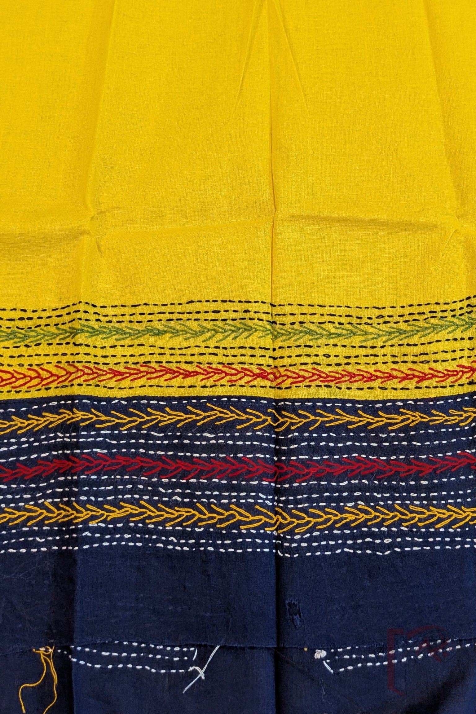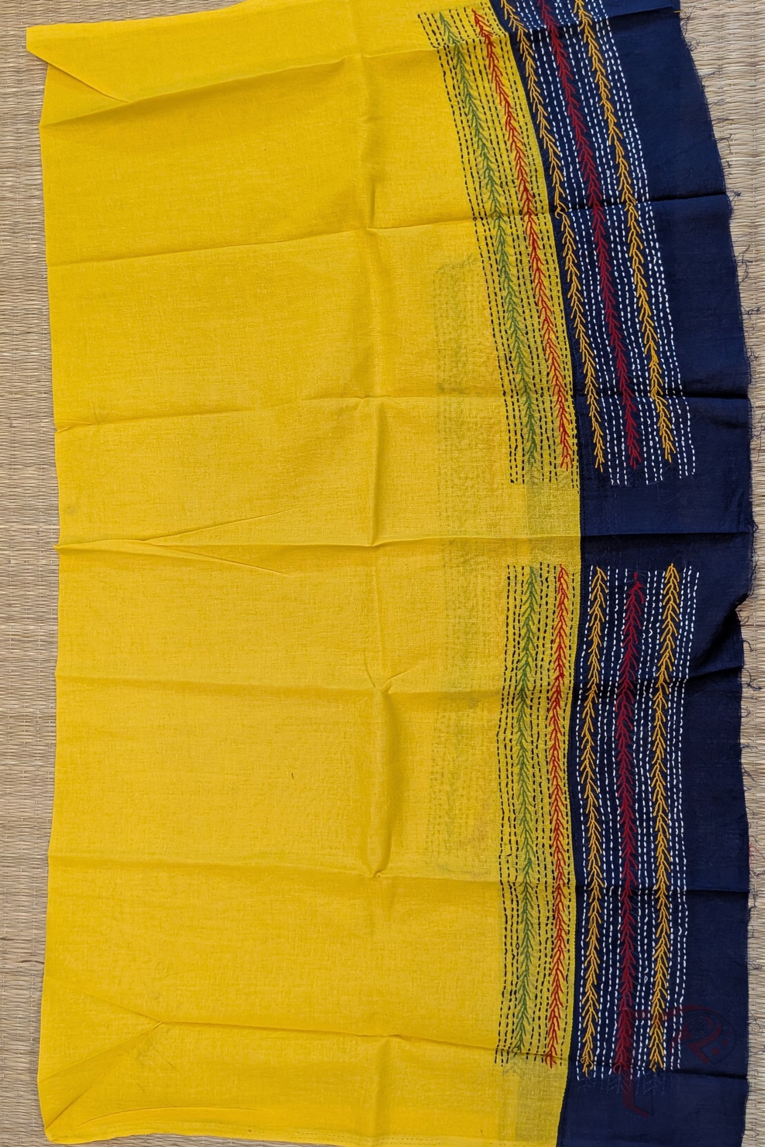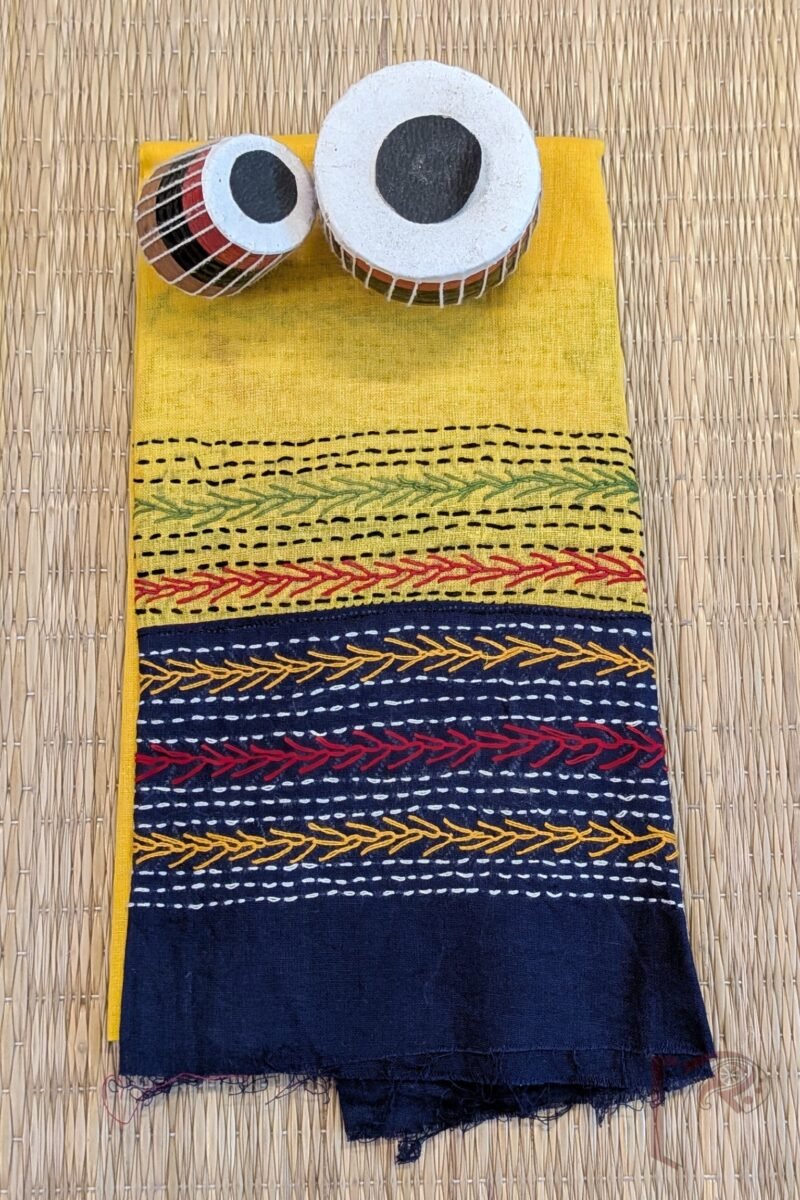 This cheerful bright yellow cotton unstitched blouse piece is beautifully enhanced with a contrasting blue cotton attached border, creating a striking frame for the design. The surface is enriched with multicolour hand embroidery, lending the blouse a playful yet refined character. Soft, breathable cotton ensures all-day comfort, while the vibrant embroidery makes it an ideal choice for pairing with handloom, jamdani, or everyday cotton sarees. Designed for effortless mix-and-match styling, this blouse brings fresh colour, artisan detail, and versatile elegance into your wardrobe.