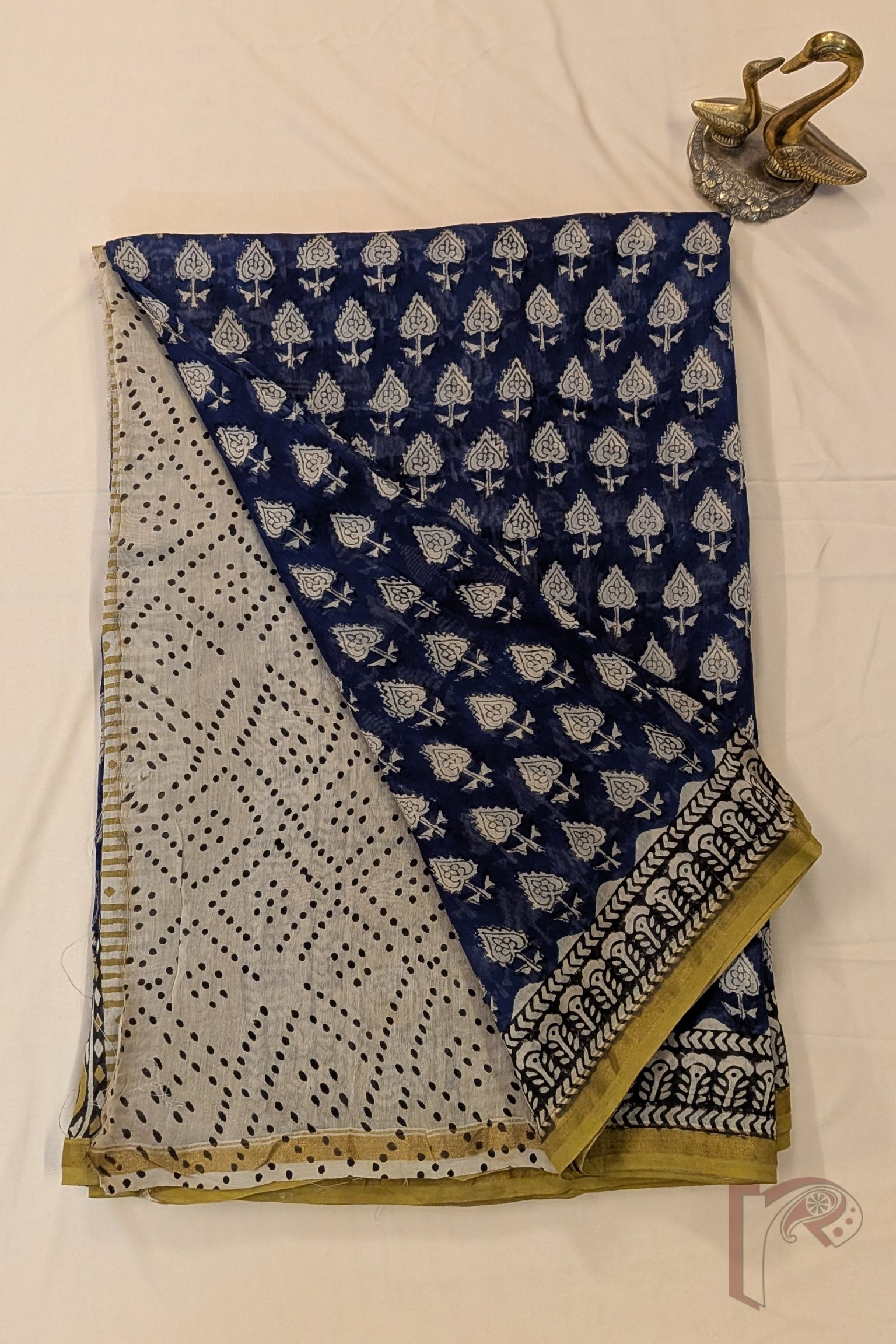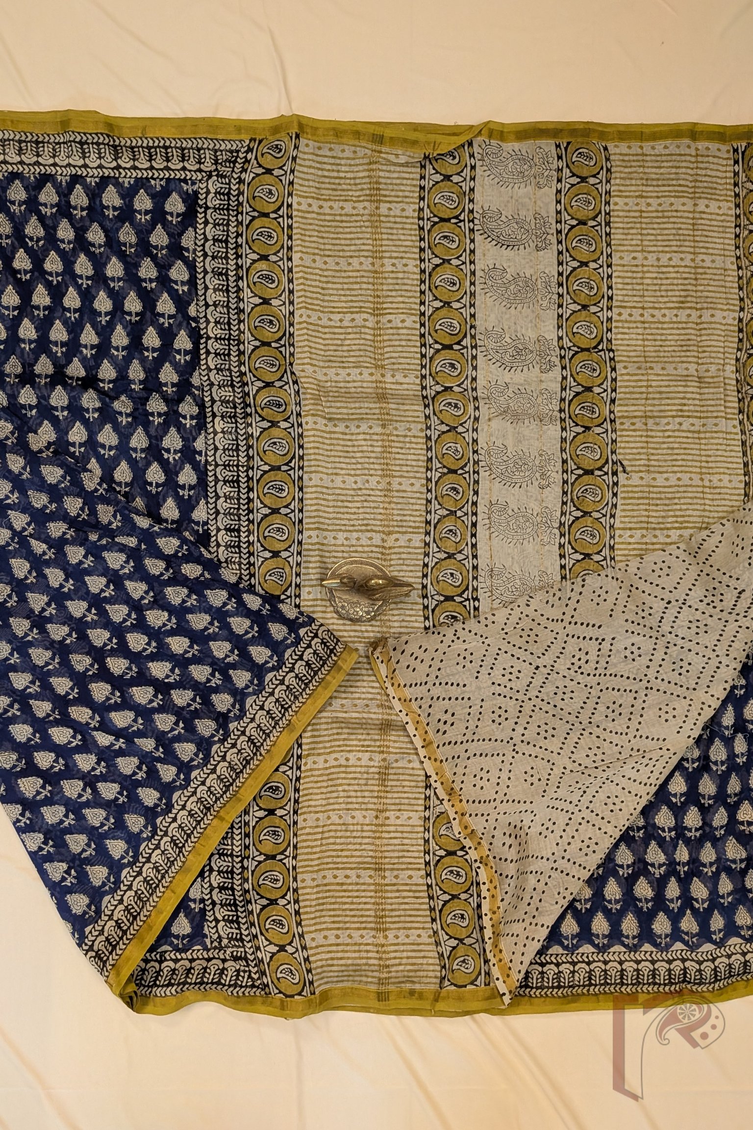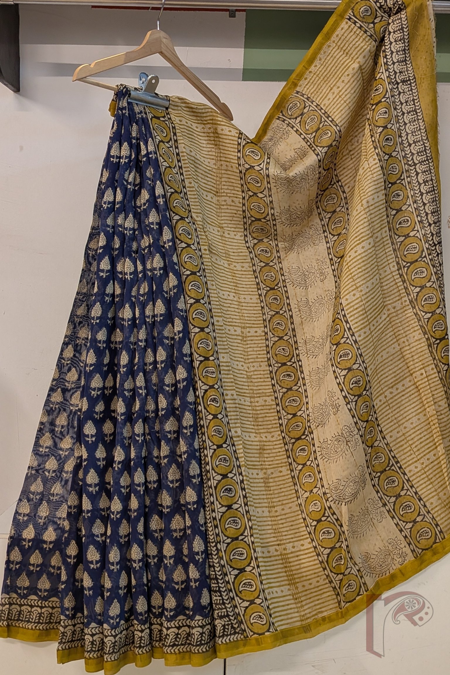 This beautiful blue Chanderi silk saree features spade-like leaf motifs on stems, block printed in cream and outlined in black. The saree is highlighted with a slim mustard yellow border and an additional 2-inch black-and-cream block print border, giving it refined definition. The pallu displays a creative mix of abstract linework and mango motifs in mustard and black over cream, adding to its artistic charm. With a matching block-printed blouse featuring a dotted diamond pattern, this saree offers a blend of freshness, symmetry and handcrafted beauty.