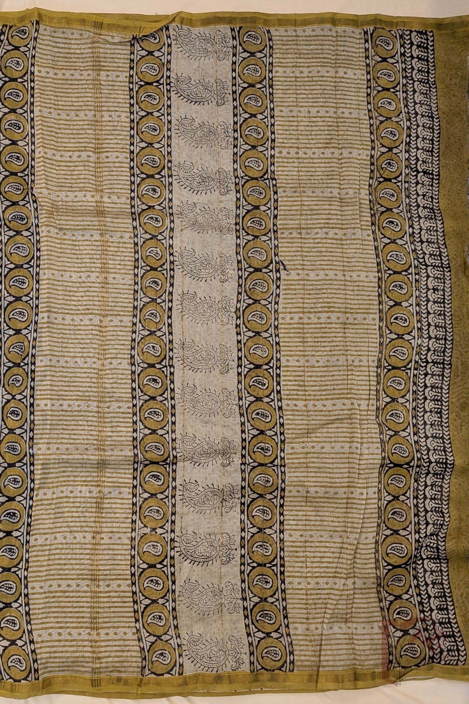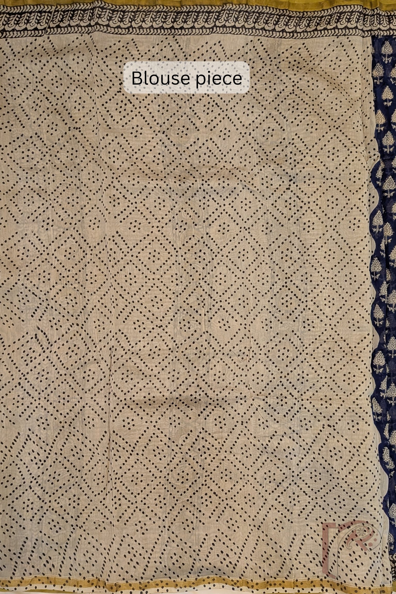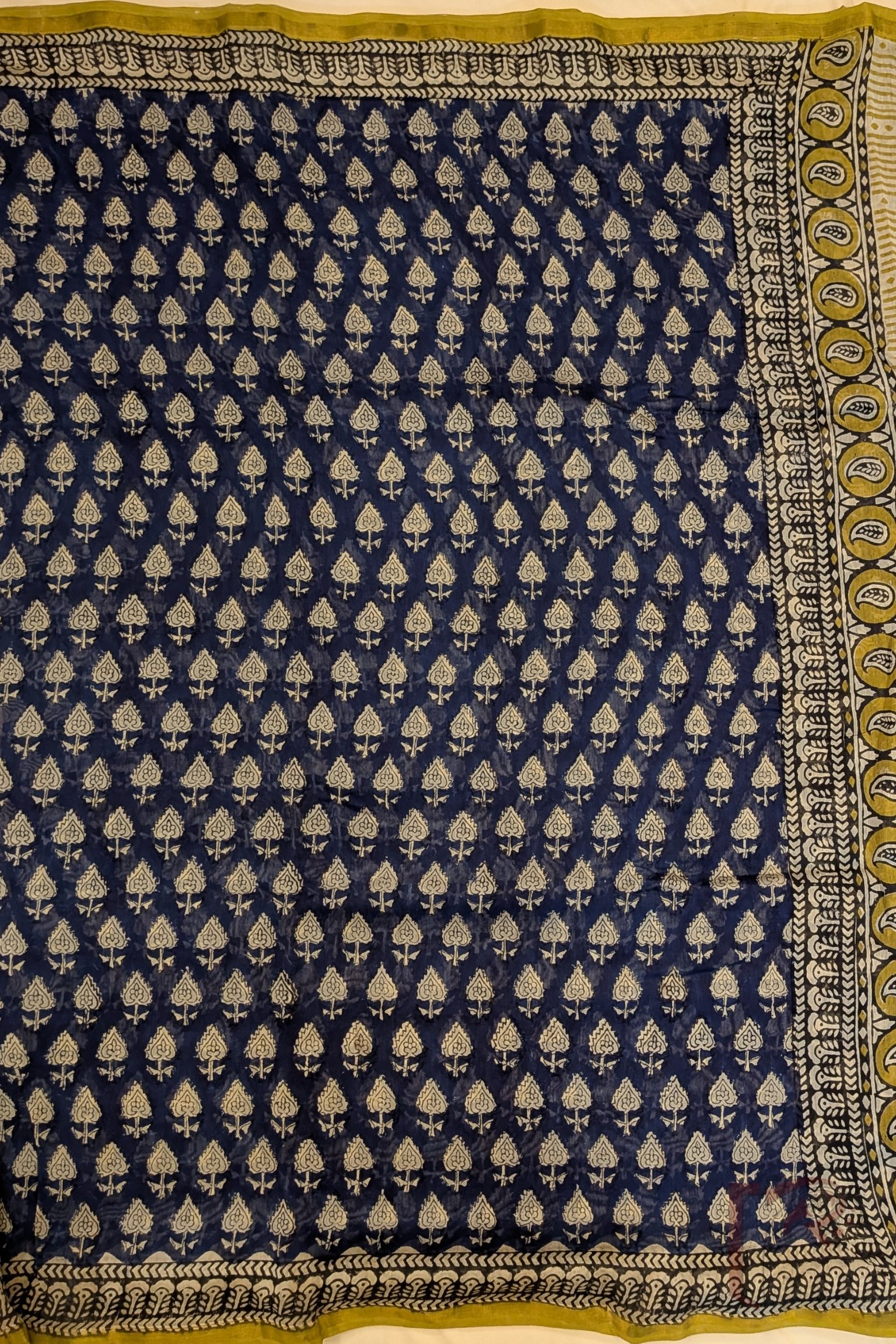This beautiful blue Chanderi silk saree features spade-like leaf motifs on stems, block printed in cream and outlined in black. The saree is highlighted with a slim mustard yellow border and an additional 2-inch black-and-cream block print border, giving it refined definition. The pallu displays a creative mix of abstract linework and mango motifs in mustard and black over cream, adding to its artistic charm. With a matching block-printed blouse featuring a dotted diamond pattern, this saree offers a blend of freshness, symmetry and handcrafted beauty.