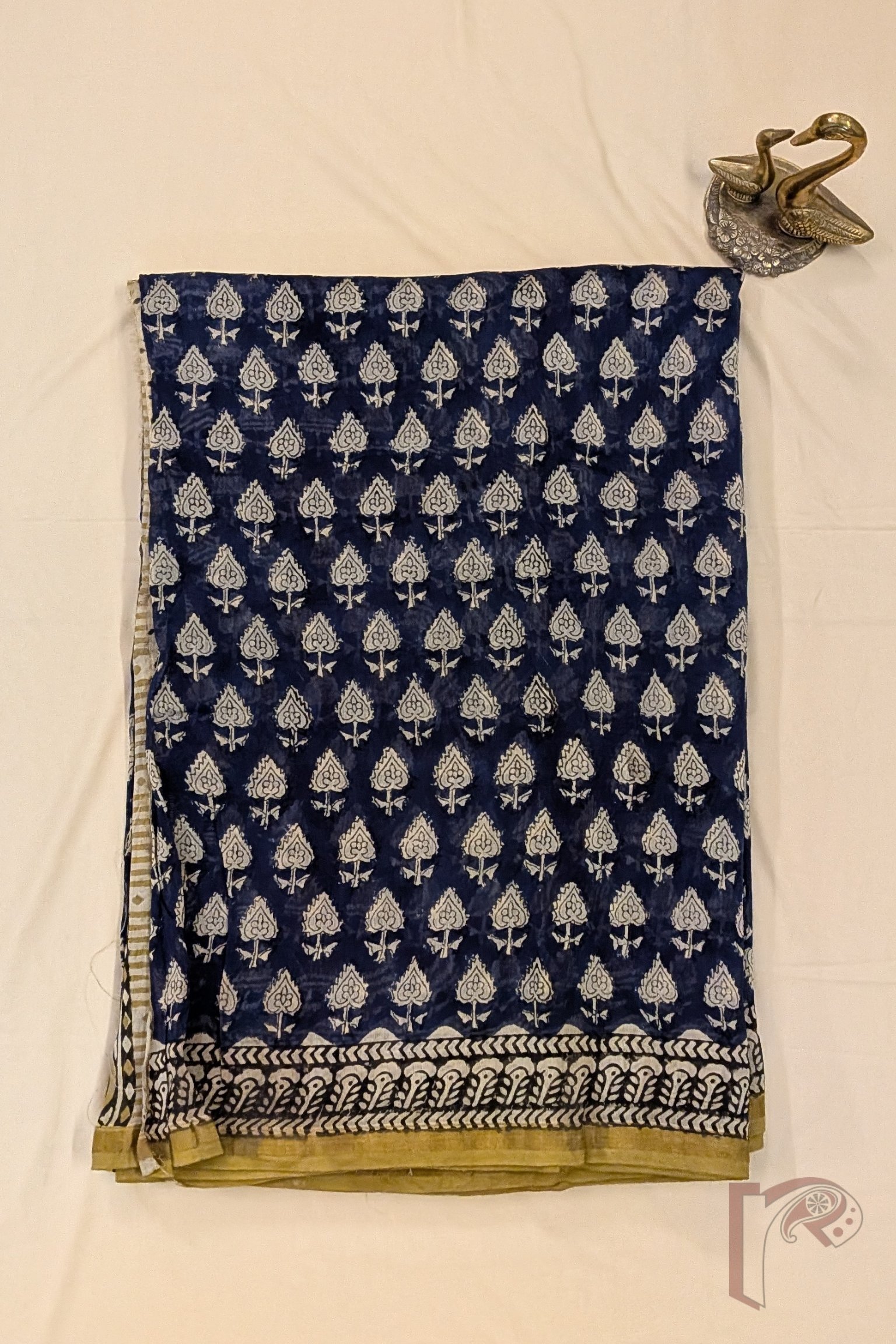 Chanderi Charisma – Blue Chanderi Silk Saree with Cream Spade Leaf Motifs and Mustard Border