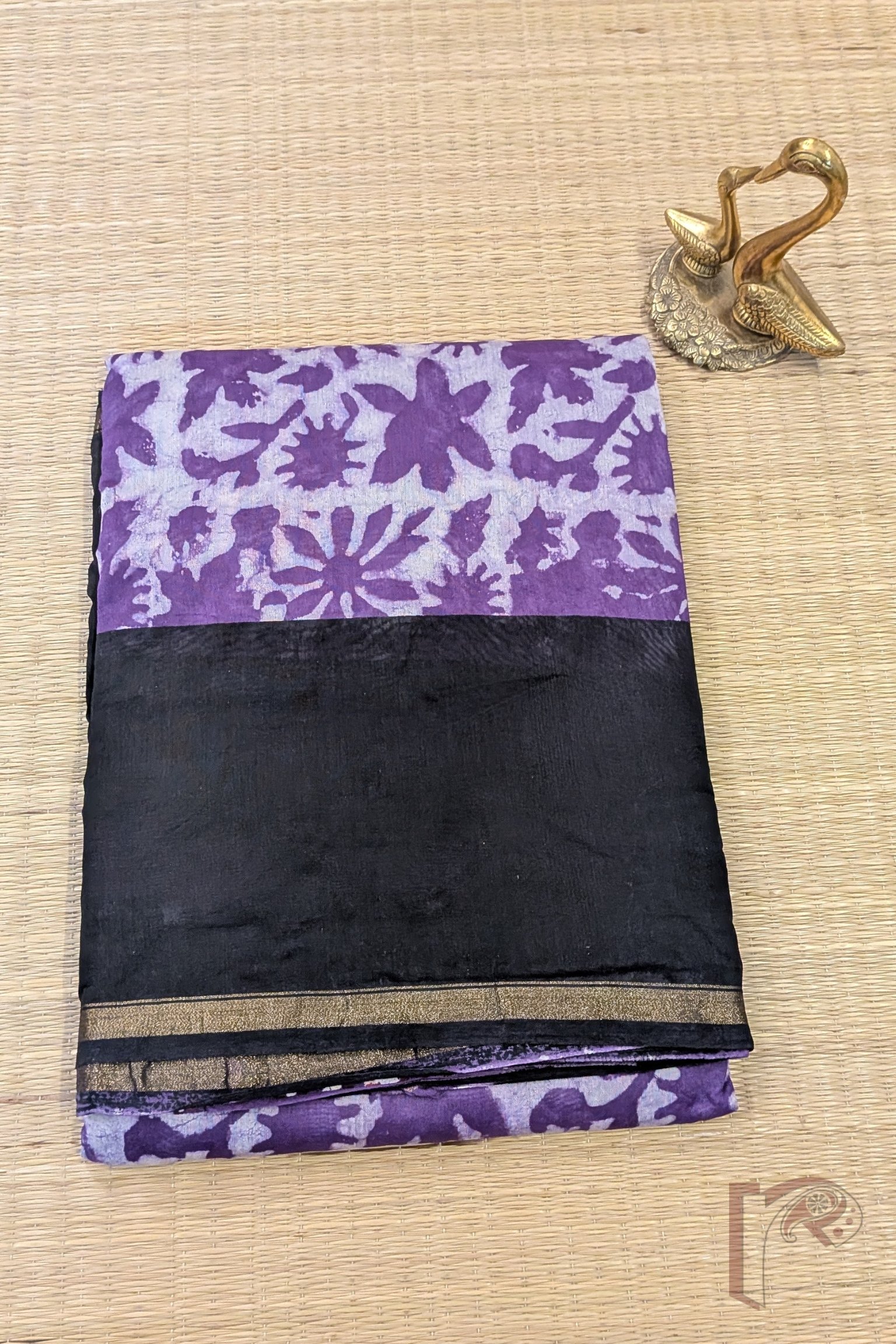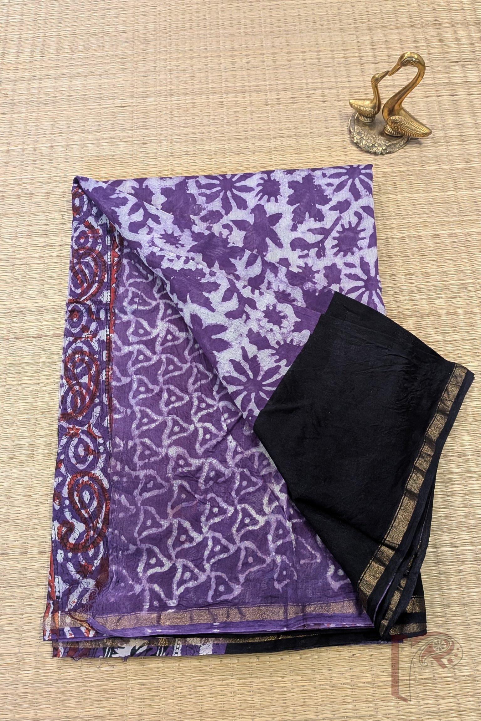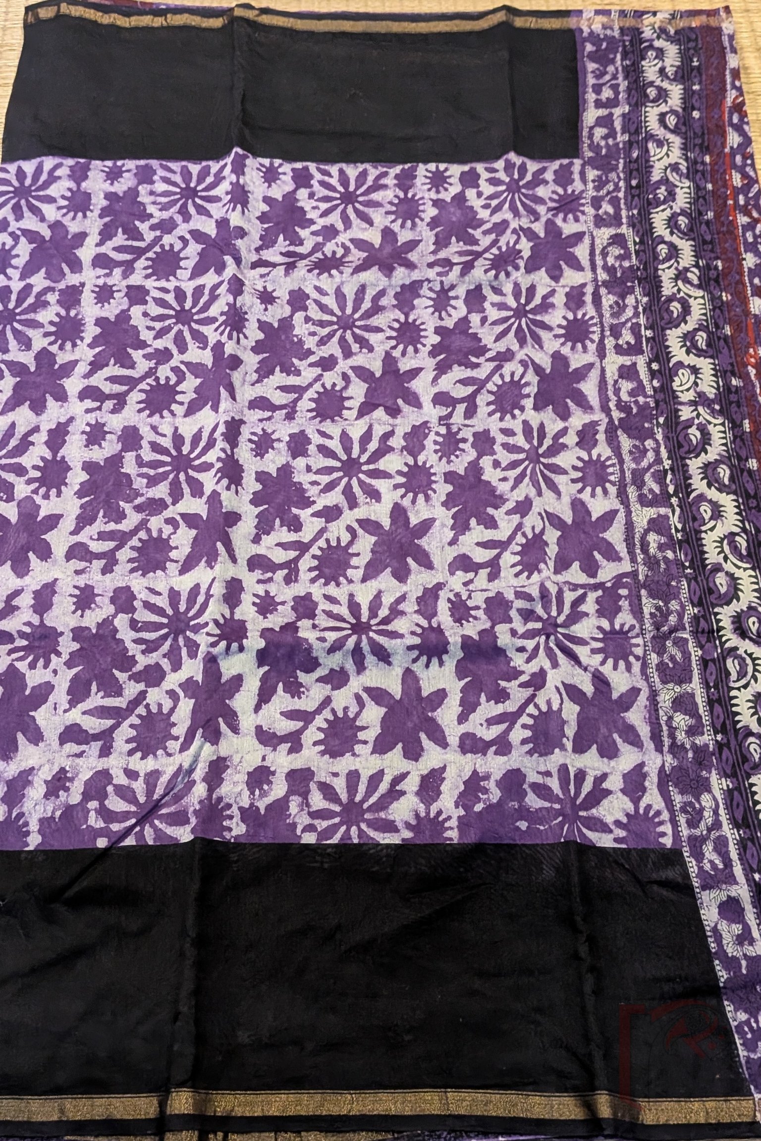 Chanderi Charisma – Dark Purplish Blue and Purple Chanderi Silk Saree with Ajrakh Floral and Zigzag Handblock Prints