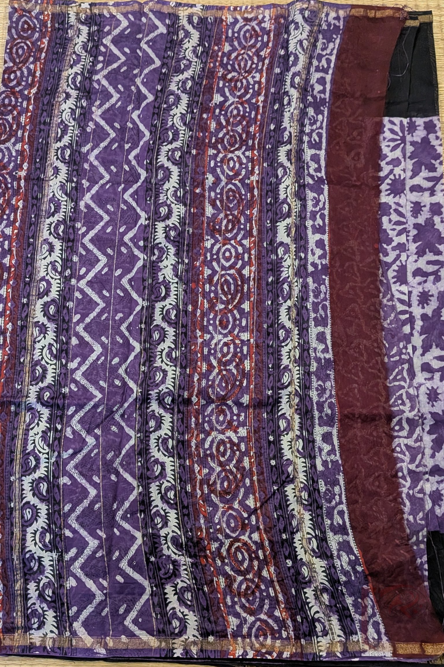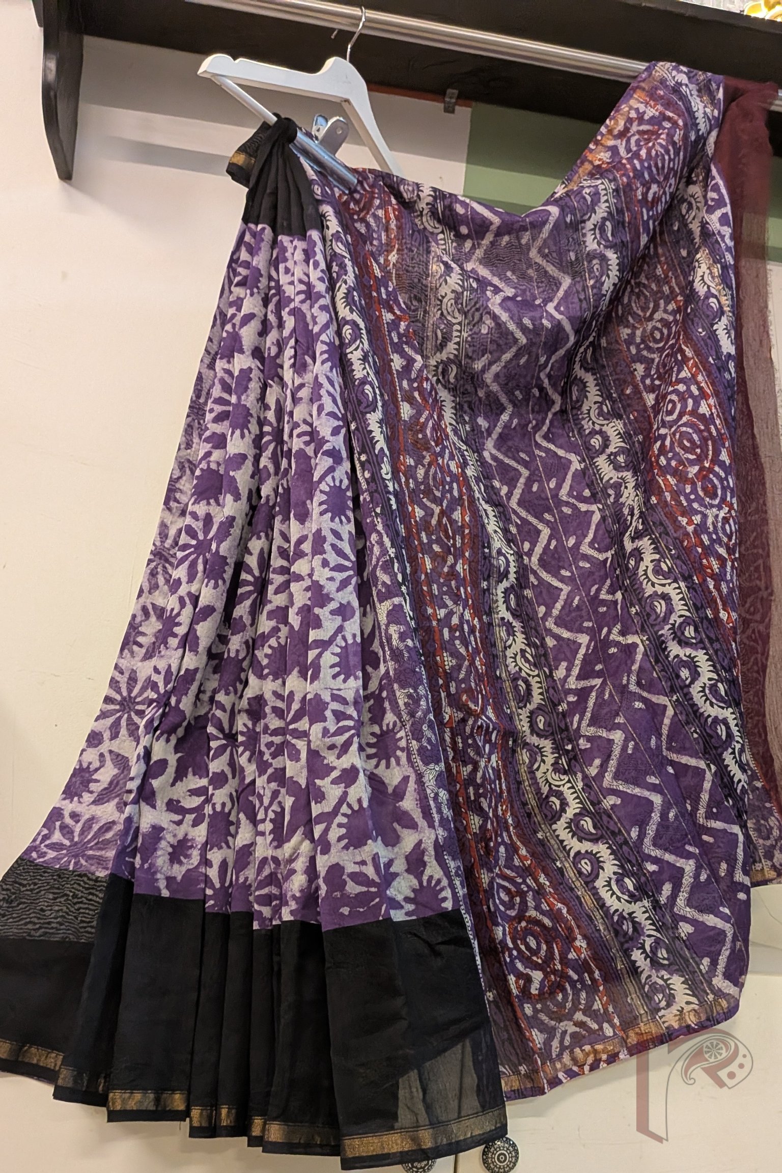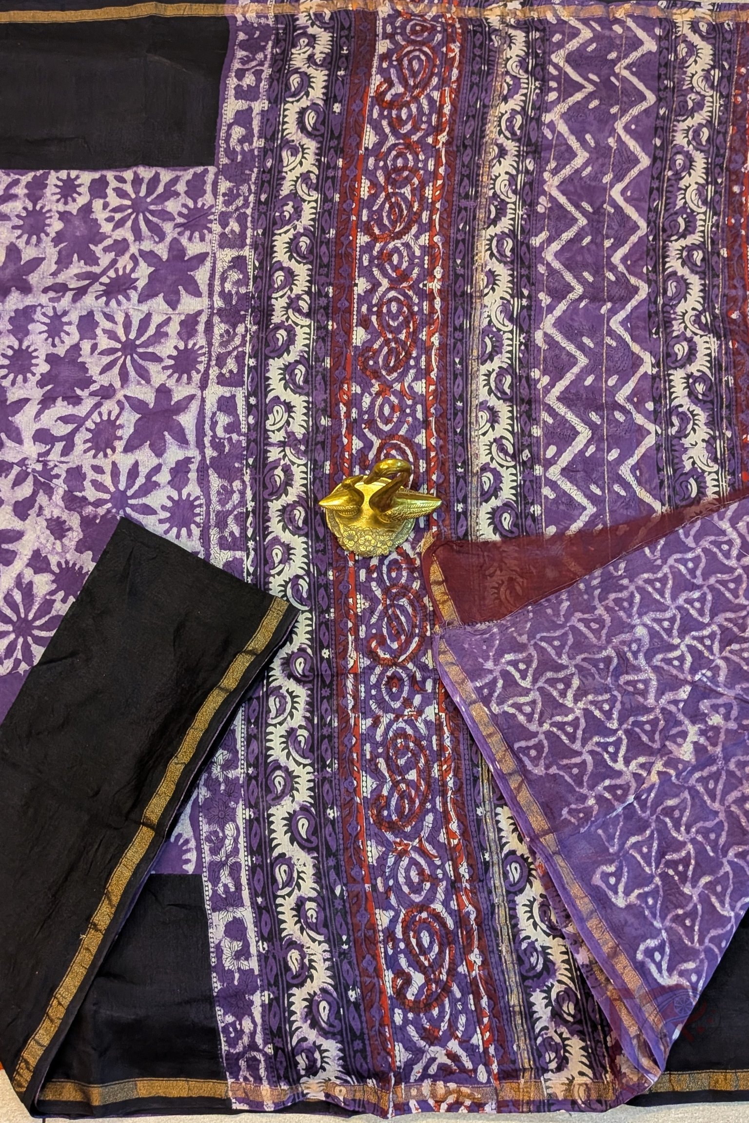 Chanderi Charisma – Dark Purplish Blue and Purple Chanderi Silk Saree with Ajrakh Floral and Zigzag Handblock Prints