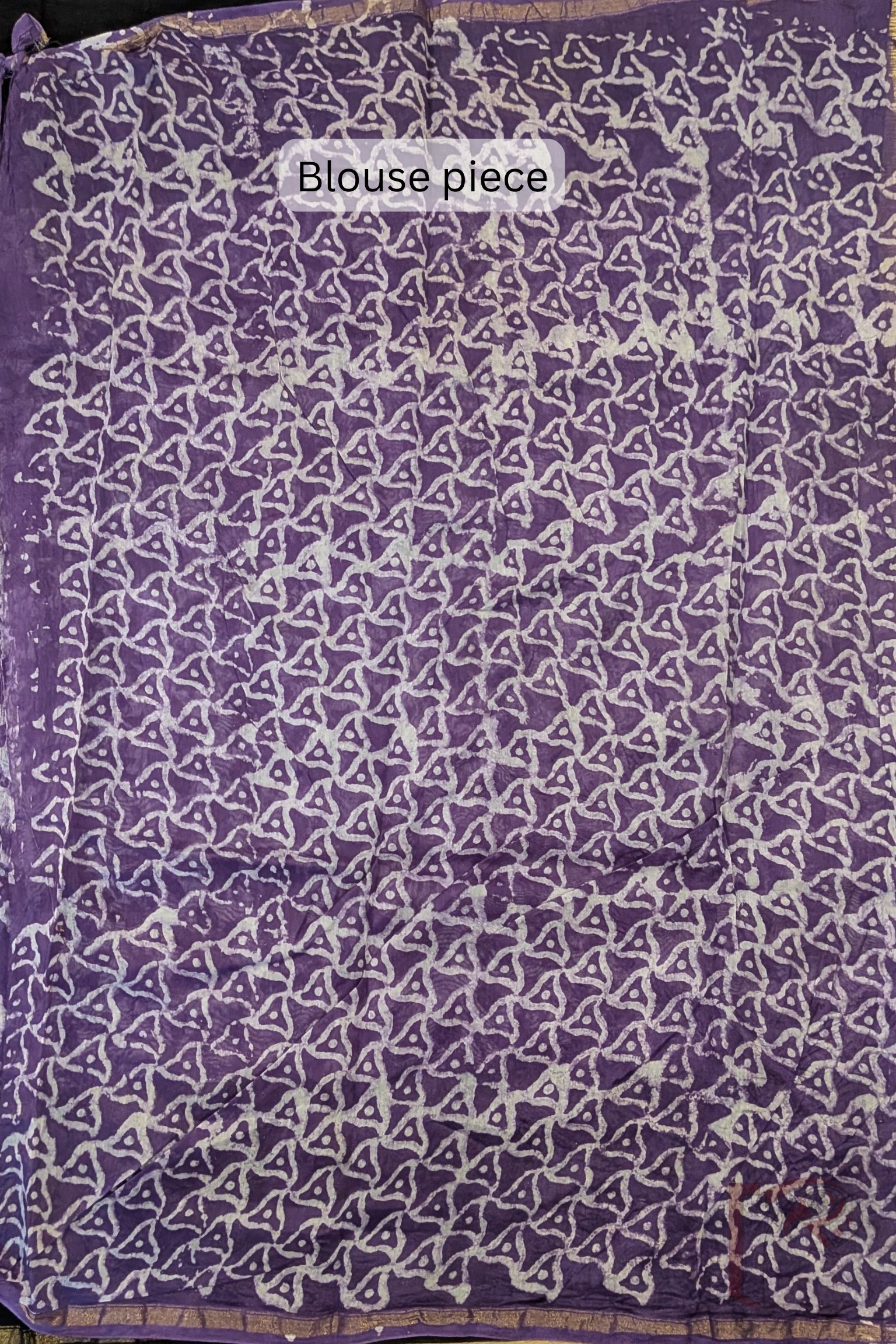 An elegant fusion of depth and vibrancy, this dark purplish-blue and purple Chanderi silk saree is a masterpiece of handblock artistry. The shaded white and purple body is adorned with Ajrakh-inspired floral motifs, giving it a graceful yet striking appeal. A broad plain dark purplish-blue border of about 7″ on both sides adds regal contrast, while the pallu dazzles in purple with bold zigzag and linear prints in black and orange accents. The look is completed with a matching purple blouse featuring a unique triangular pattern in shaded tones. Enhanced with a delicate gold zari line on both sides, this saree brings together tradition and bold elegance — ideal for festive evenings or formal gatherings.