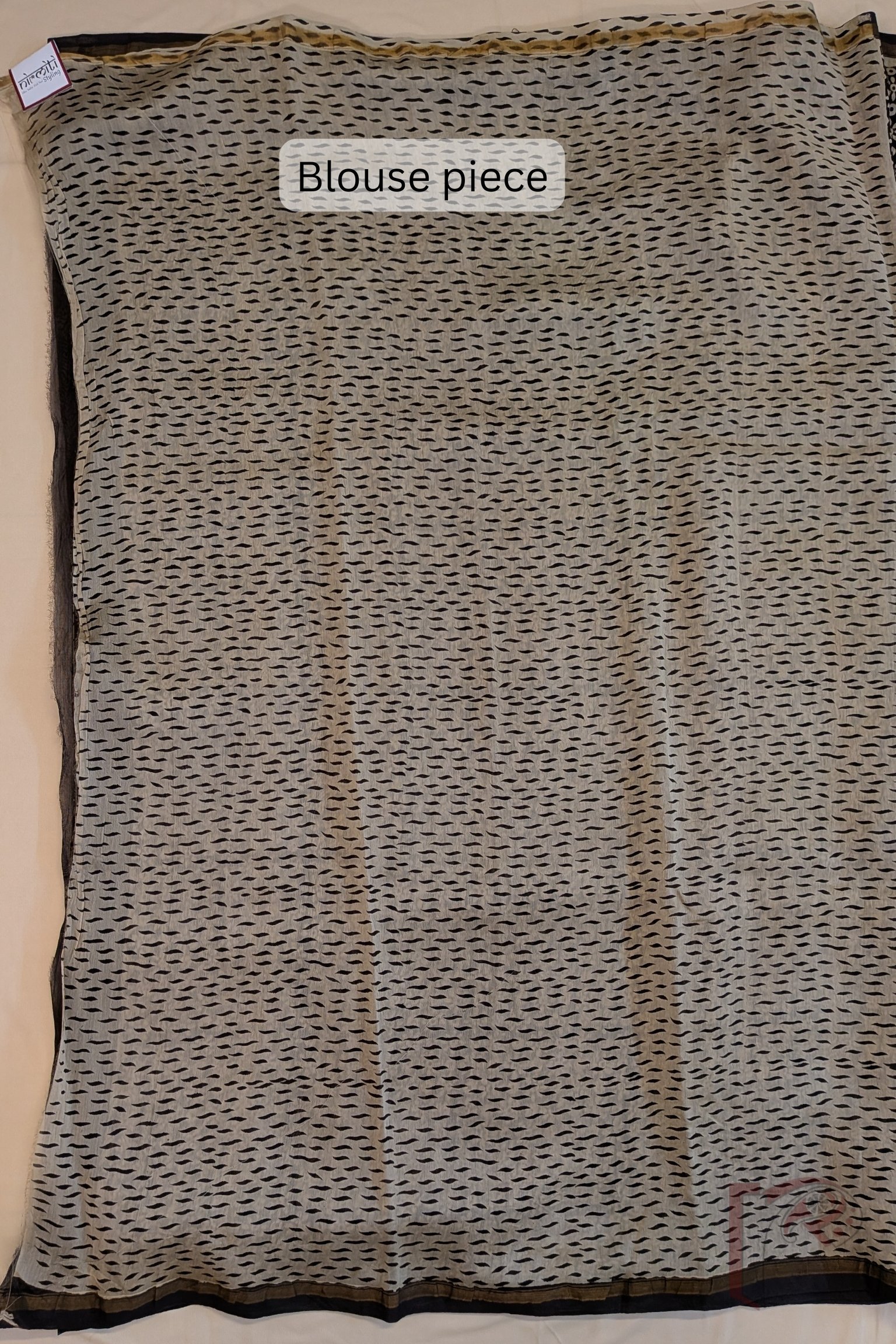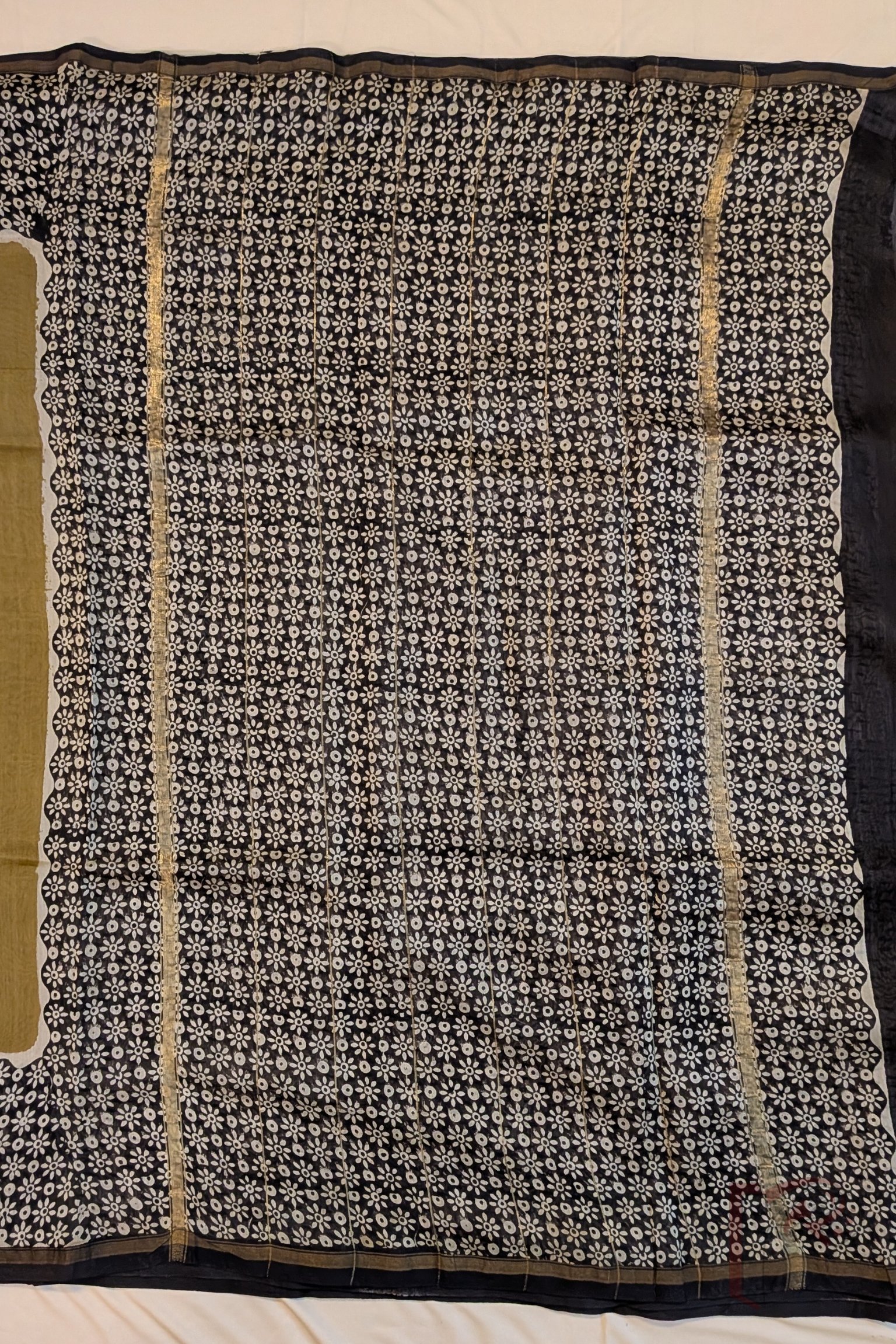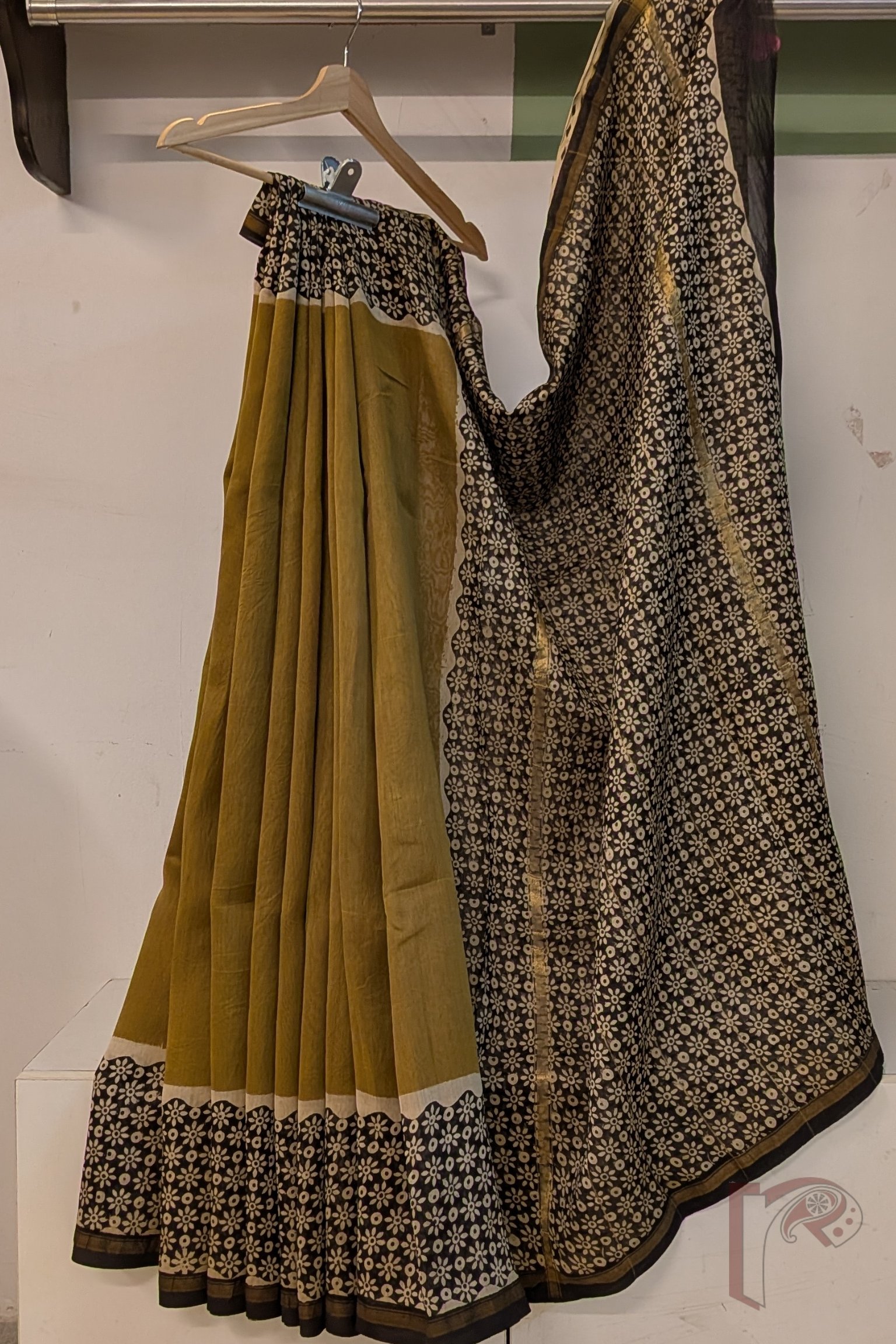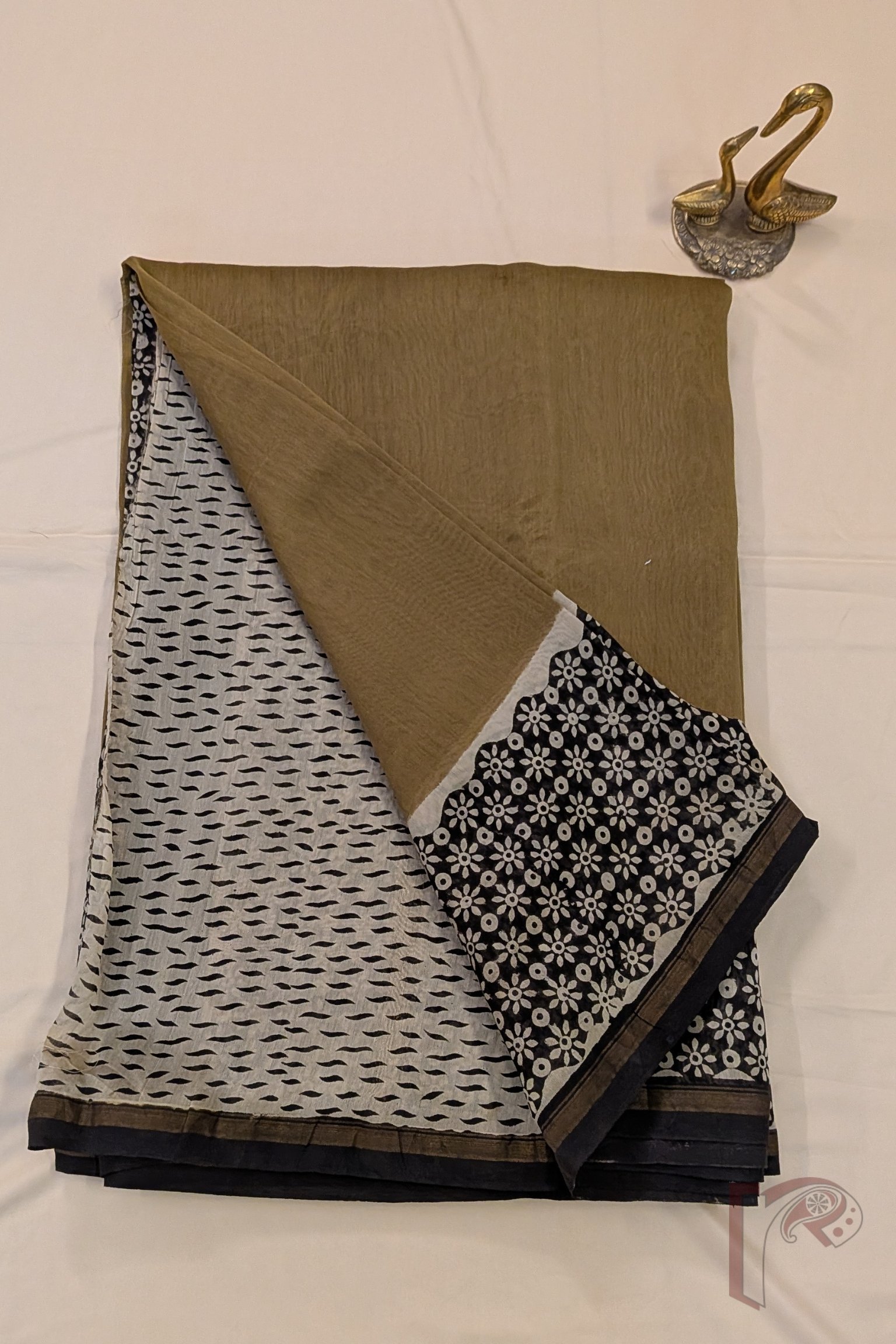 A unique and contemporary design, this mehendi green Chanderi silk saree features a solid body contrasted with broad black borders on both sides, embellished with small block-printed flower and circle motifs. The simplicity of the plain body paired with the bold borders creates a striking and modern silhouette, perfect for women who prefer clean, confident design. Paired with a cream blouse printed with black weave-like motifs, this saree blends subtlety with artistry, making it ideal for both workwear elegance and understated festive charm.