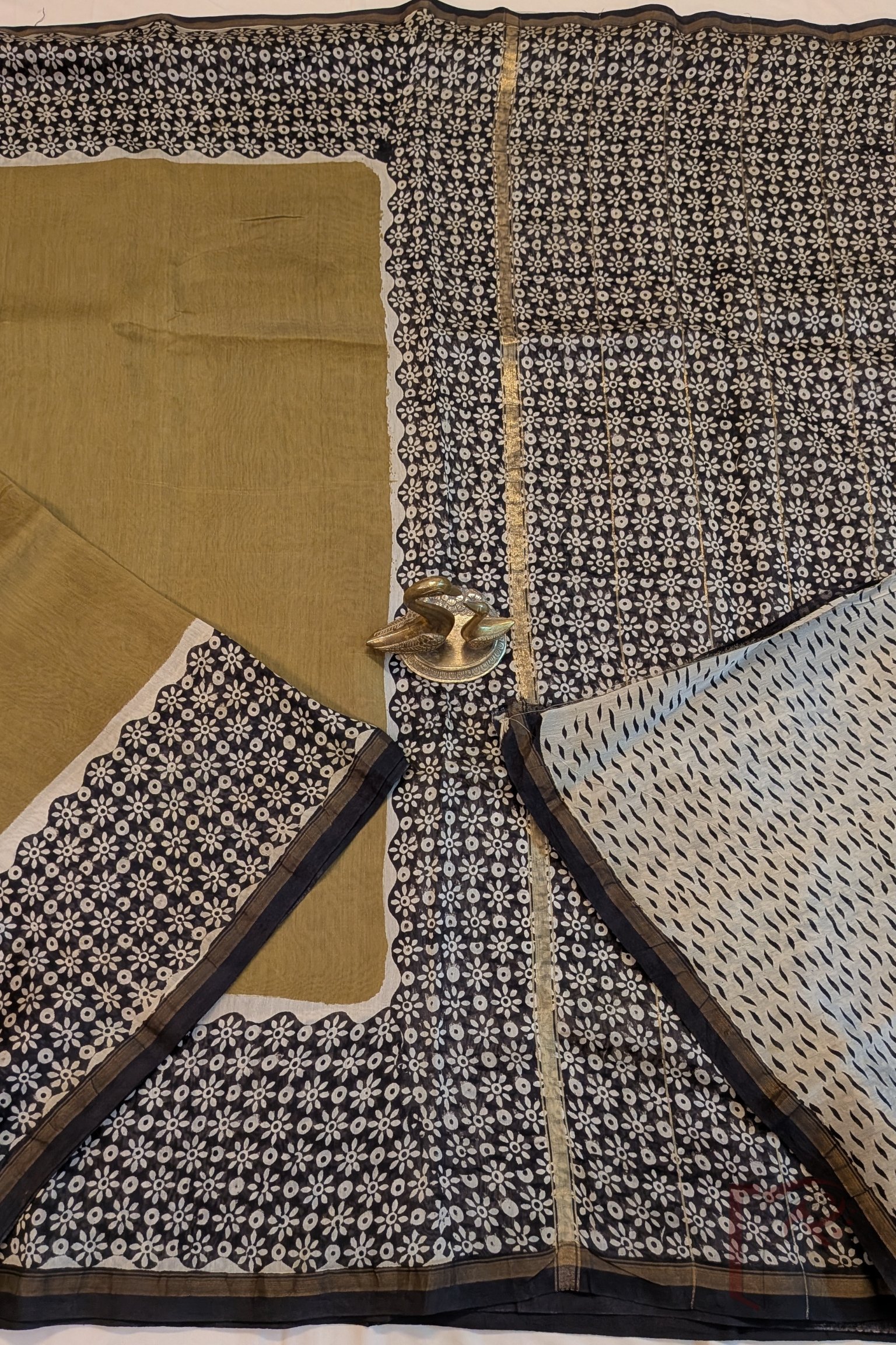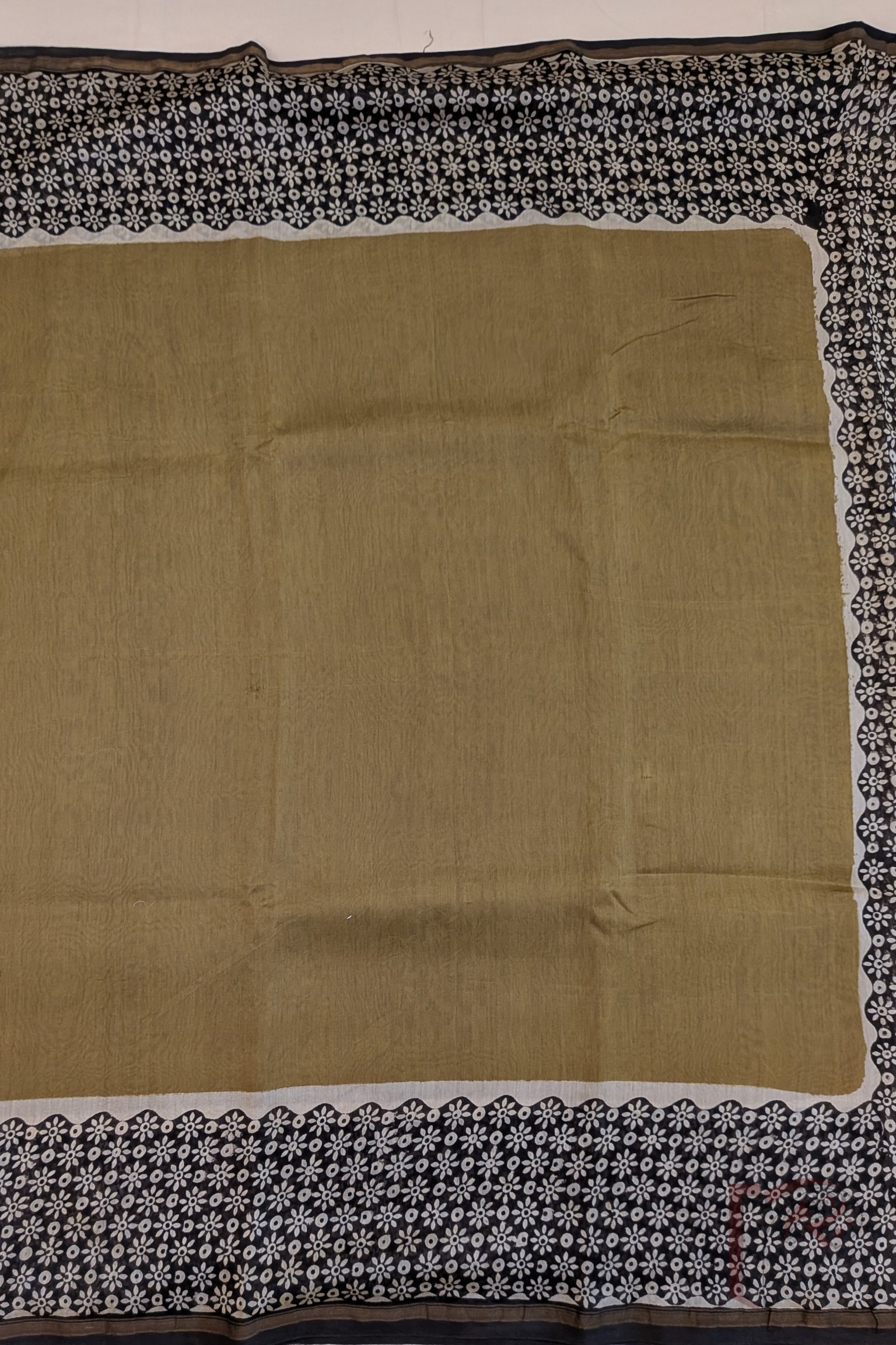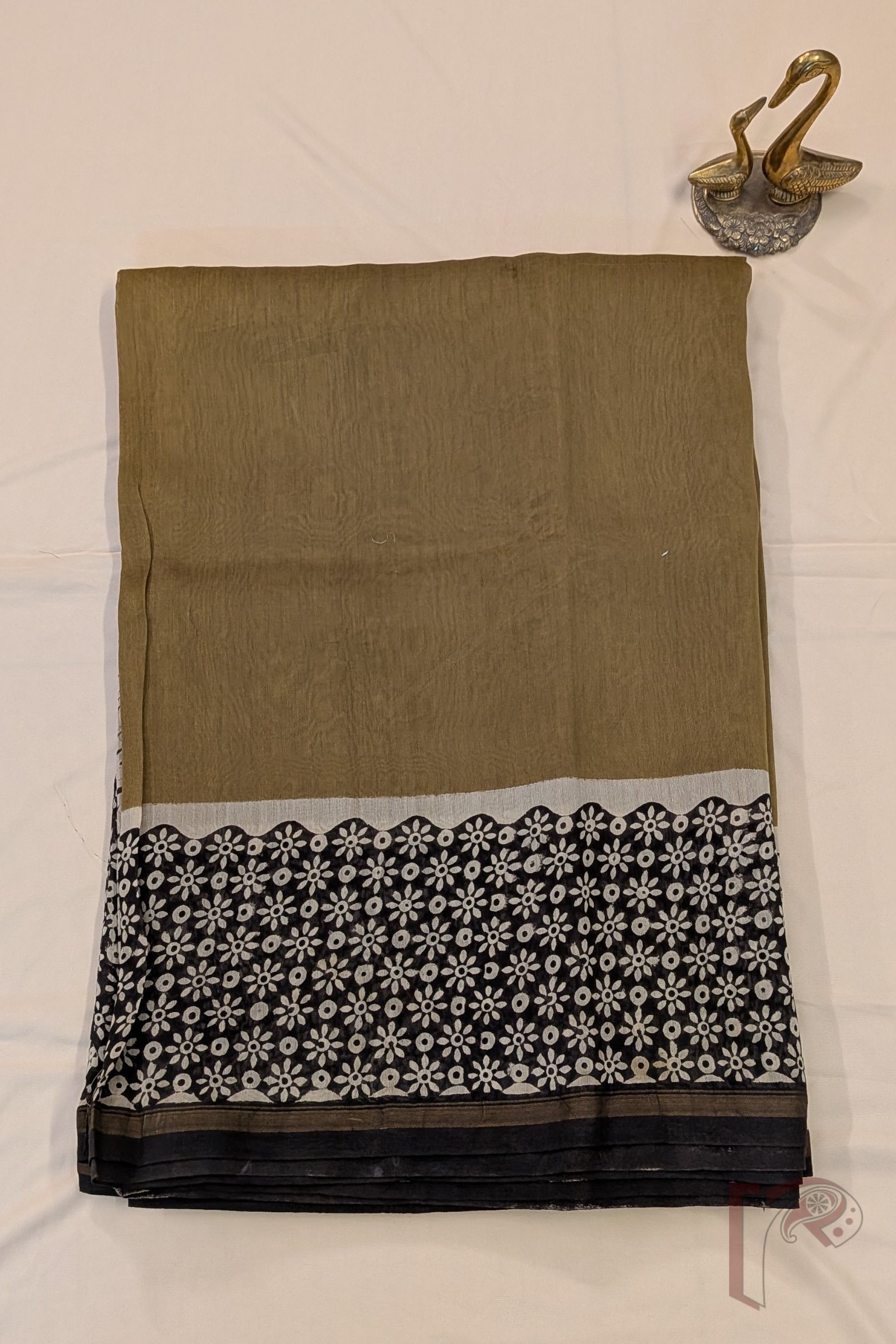 Chanderi Charisma – Mehandi Green Chanderi Silk Saree with Black Floral Motif Broad Borders