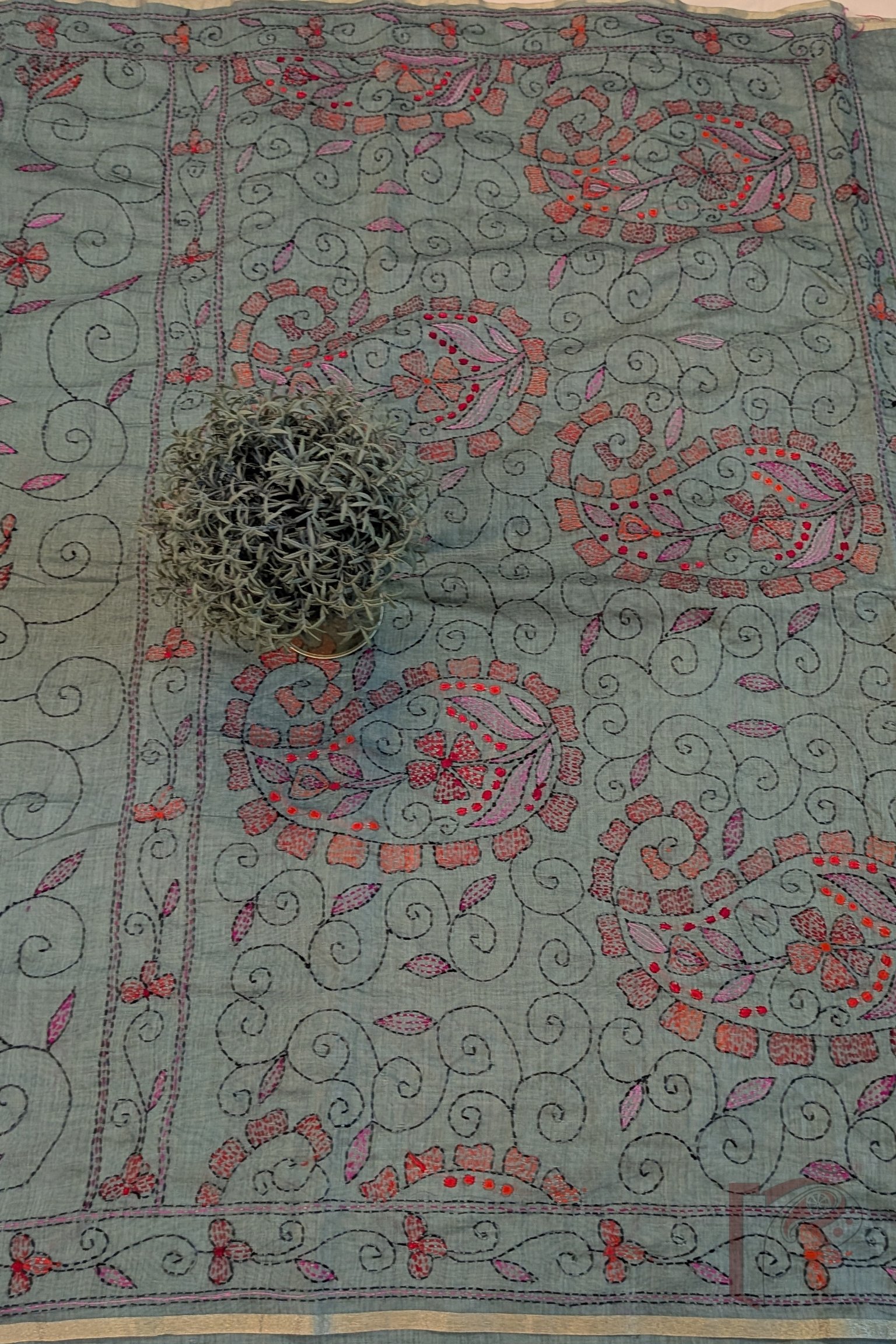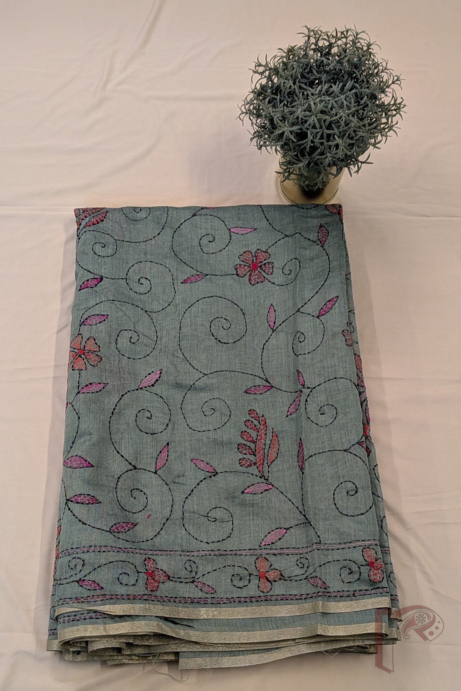 Chanderi Charisma – Sage Green Chanderi Silk Saree with Black Kantha Stem, Long Leaf and Floral Hand Embroidery Saree