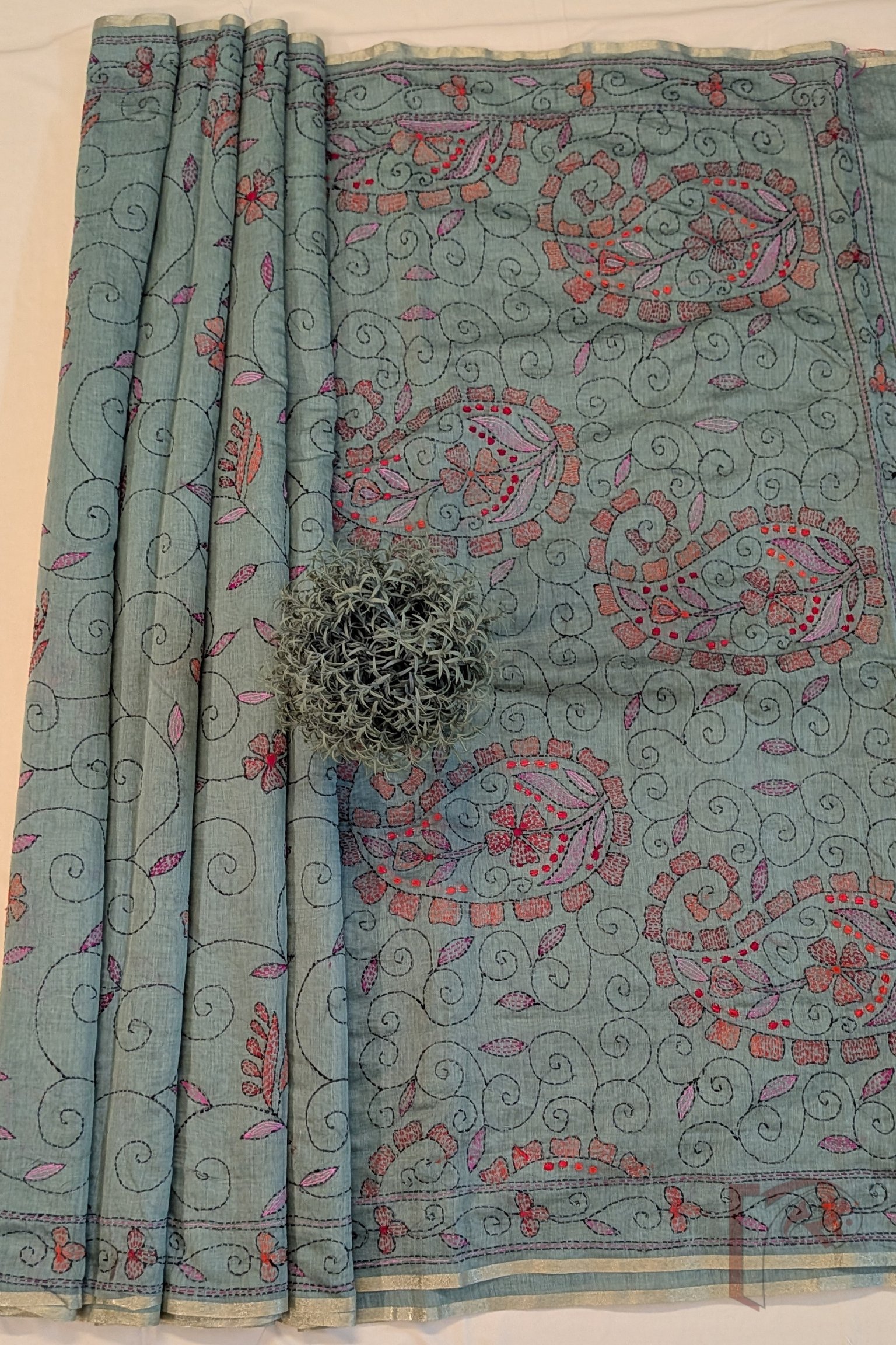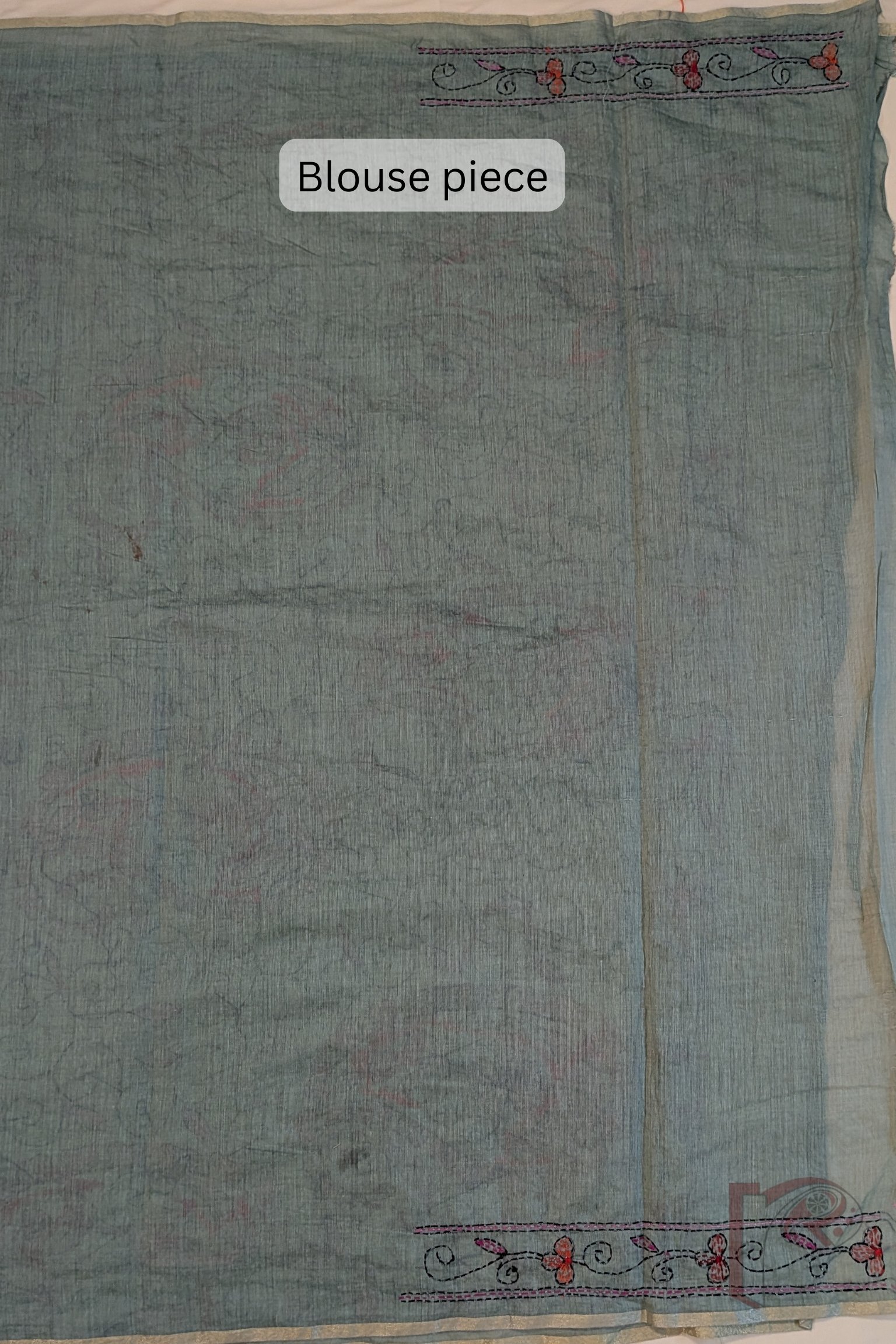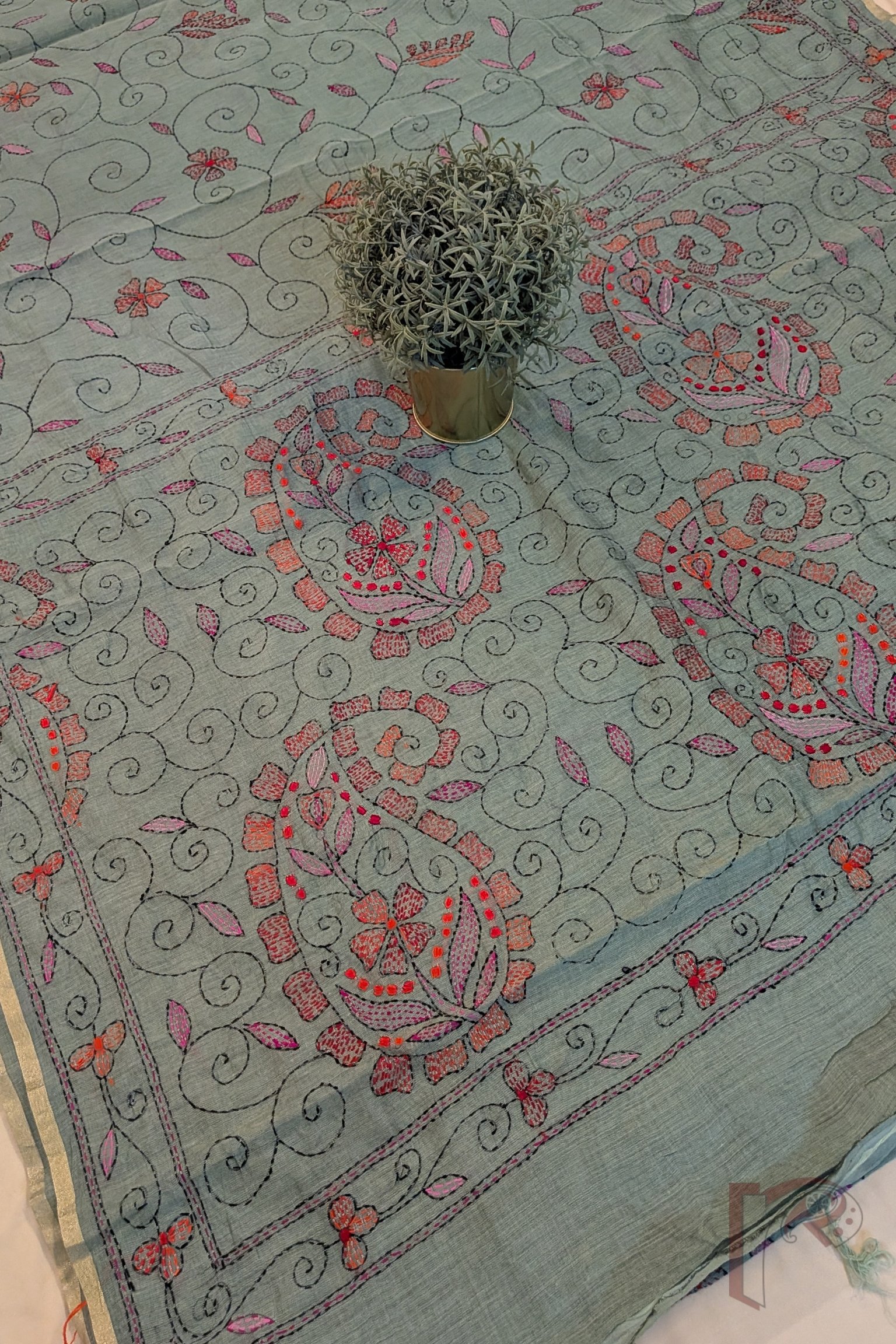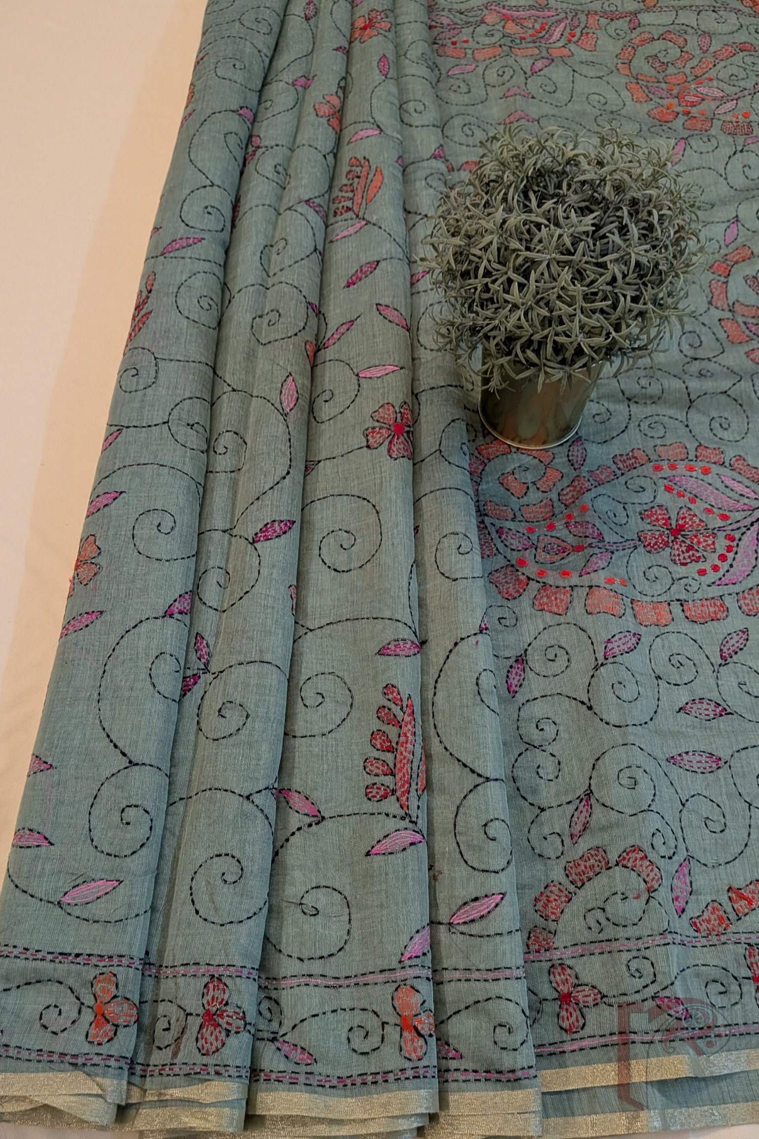 Radiating understated elegance, this sage green Chanderi silk saree showcases the refined beauty of traditional kantha embroidery. Accented with a delicate half-inch gold zari border, the body features flowing winding stems embroidered in fine black running kantha stitches, adorned with elongated leaf motifs along with scattered floral and smaller leaf elements. The composition forms a beautifully balanced open jal pattern that gives the saree an airy and graceful visual rhythm. As the drape flows into the pallu, the embroidery becomes richer and more elaborate with densely arranged floral and leaf motifs intertwined along elegant stems. The motifs are filled with stunning shades of shaded pink, bright orange, and burnt red threadwork, bringing warmth and vibrancy to the serene green base. The saree is complemented by a running blouse fabric with carefully embroidered borders for sleeves and back, making it a refined ensemble that highlights handcrafted artistry, delicate detailing, and the timeless elegance of Chanderi fabric.
