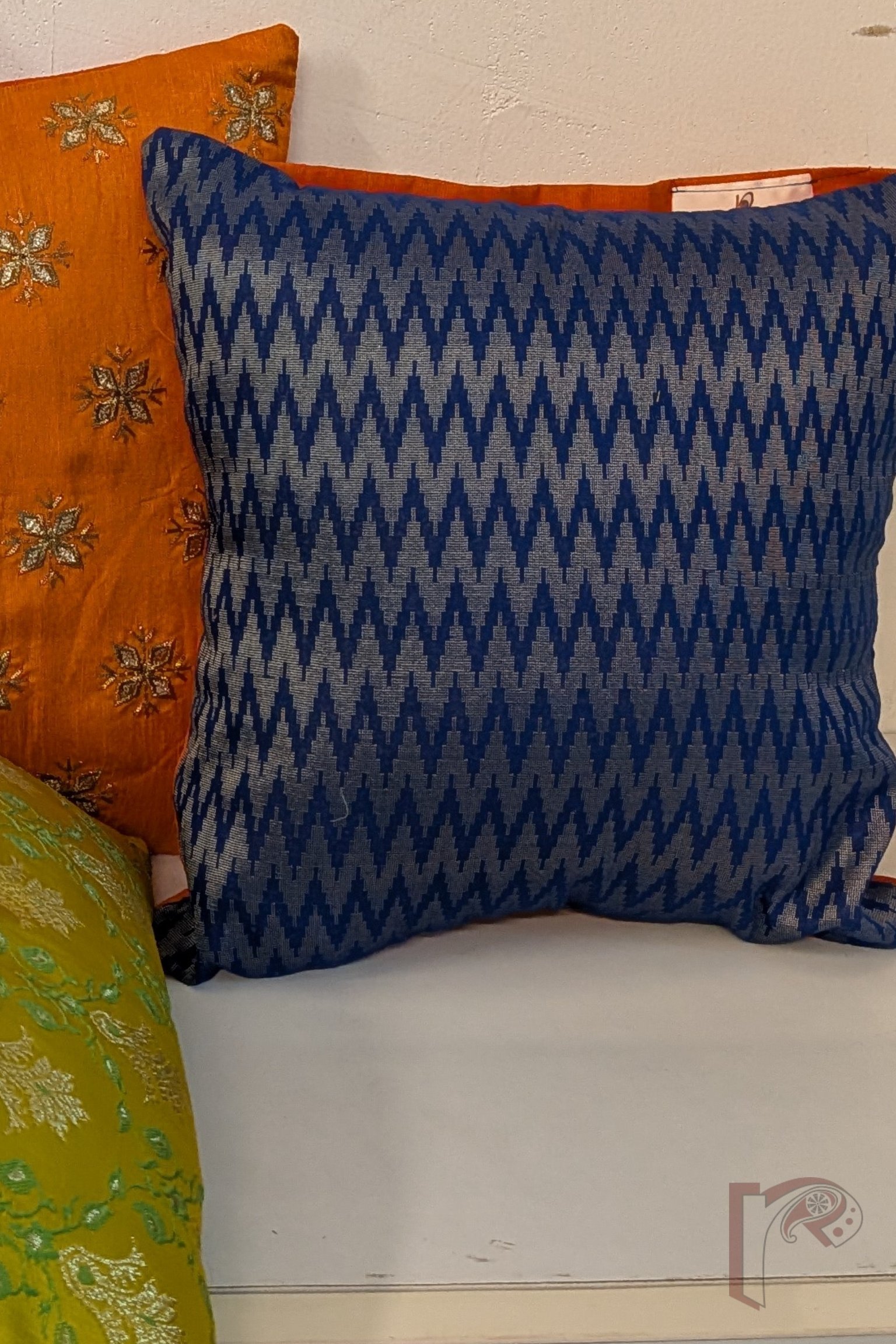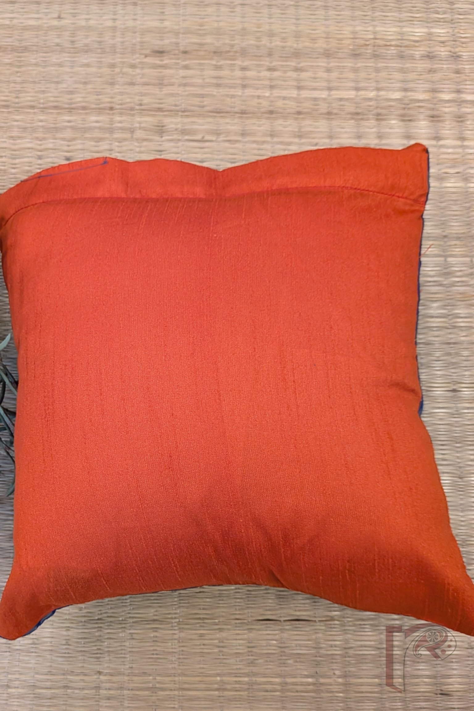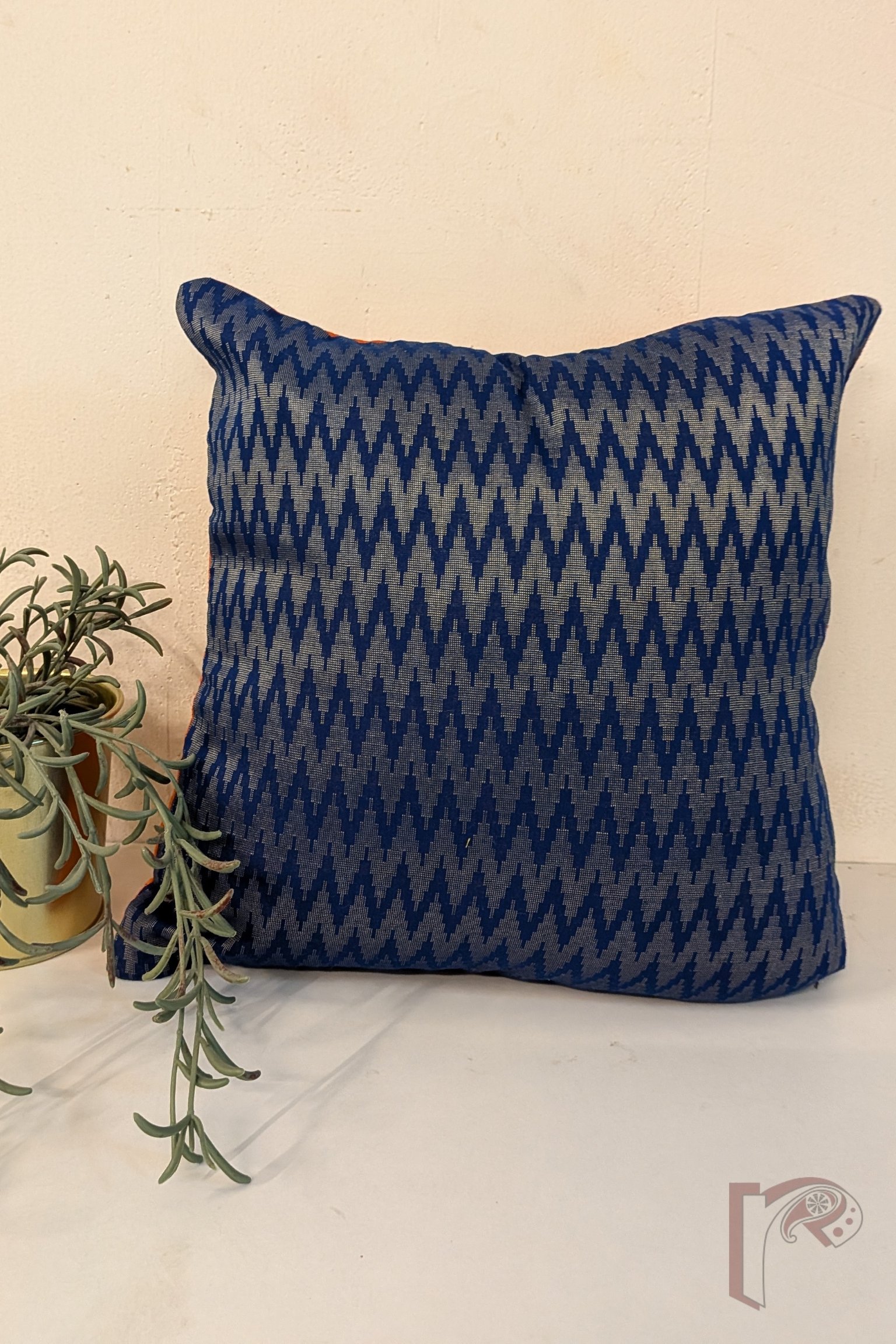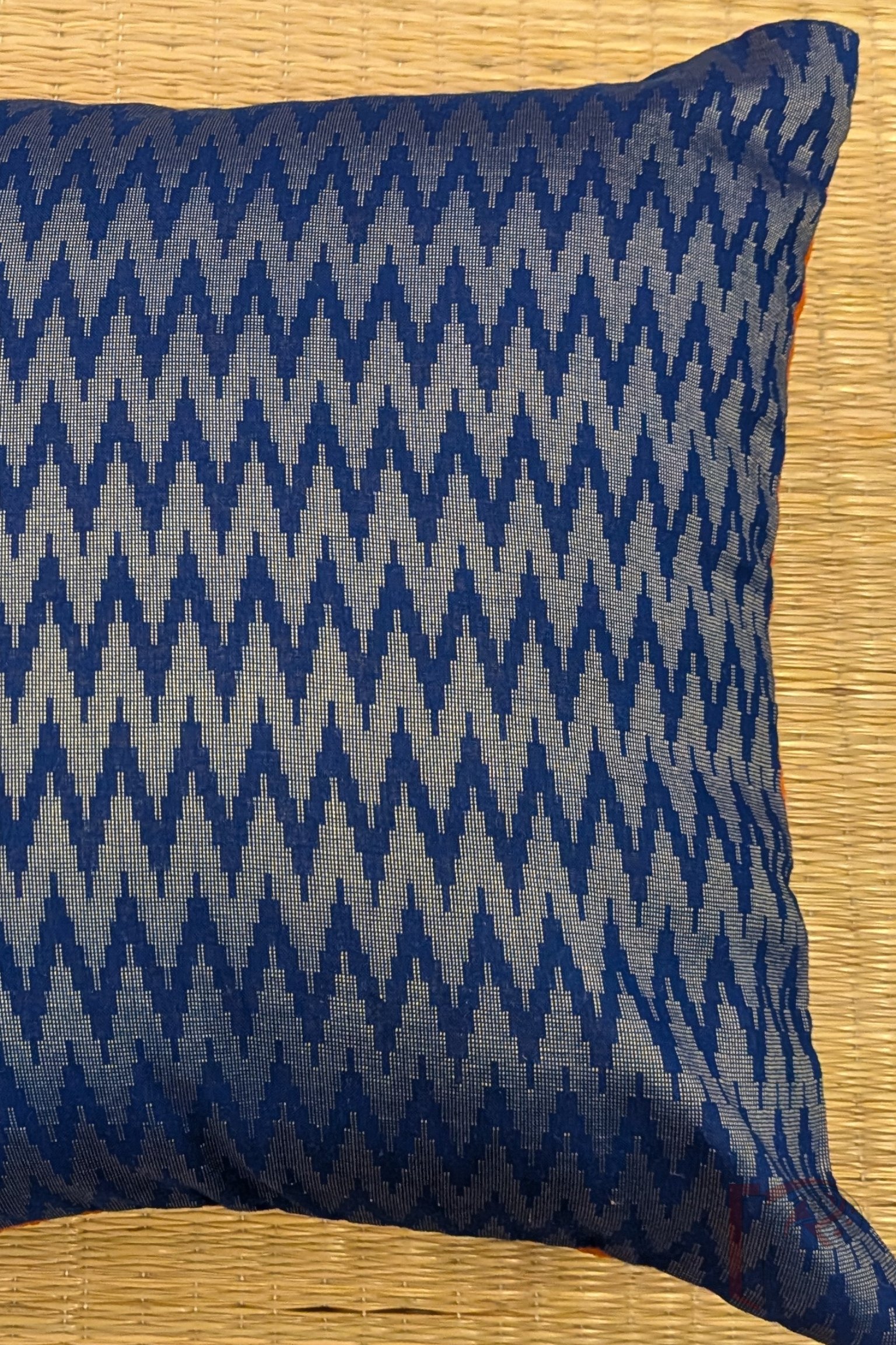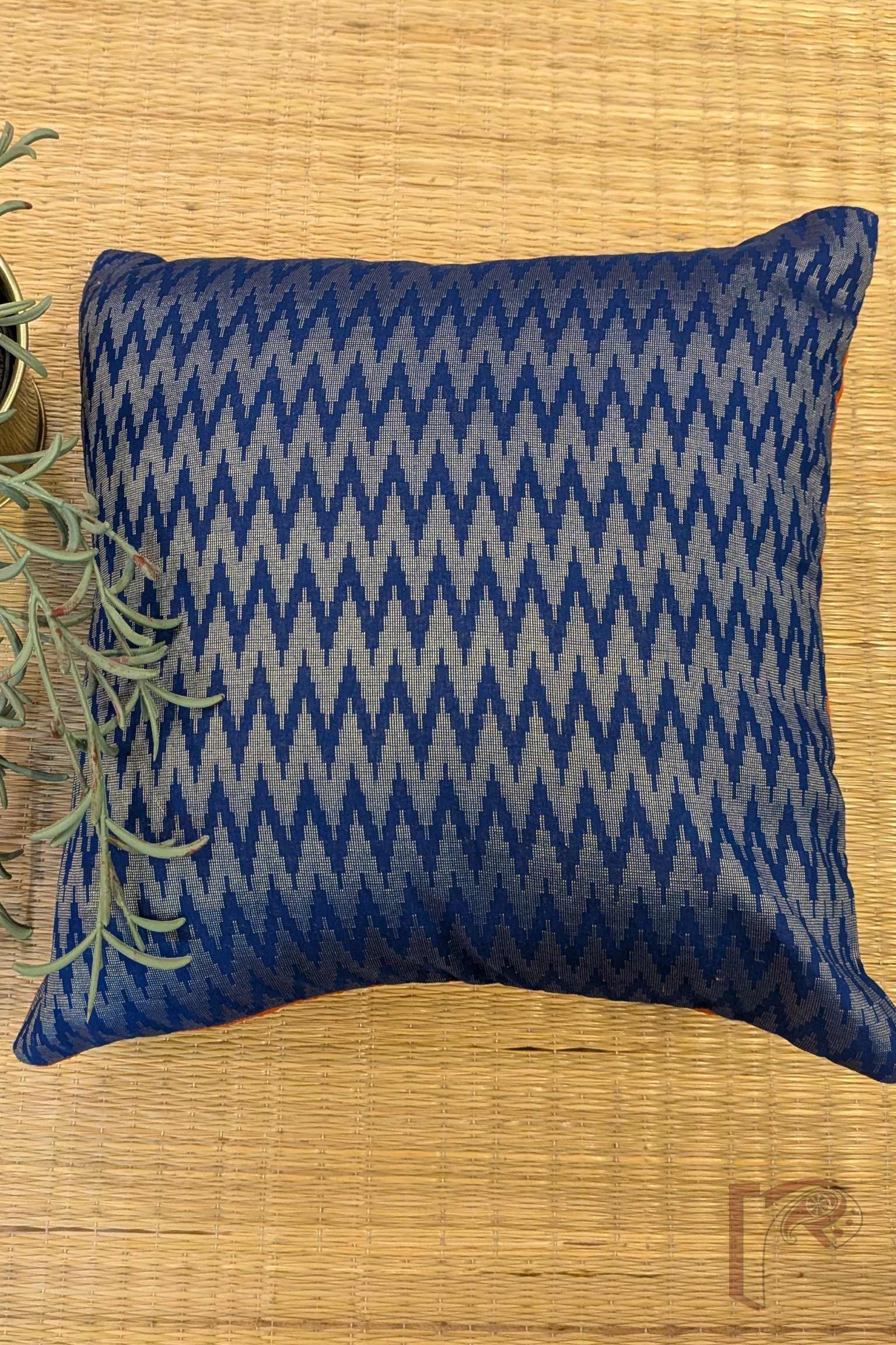 This beautiful cotton silk cushion cover features a blue zigzag weave that adds both depth and texture to its festive appeal. The vibrant orange silk back offers a stunning contrast, making the design come alive with warmth and elegance. Handcrafted with care, this cushion cover blends the rich sheen of silk with the soft comfort of cotton, making it a perfect accent piece to uplift your living room or bedroom décor with a touch of traditional charm and modern vibrance.