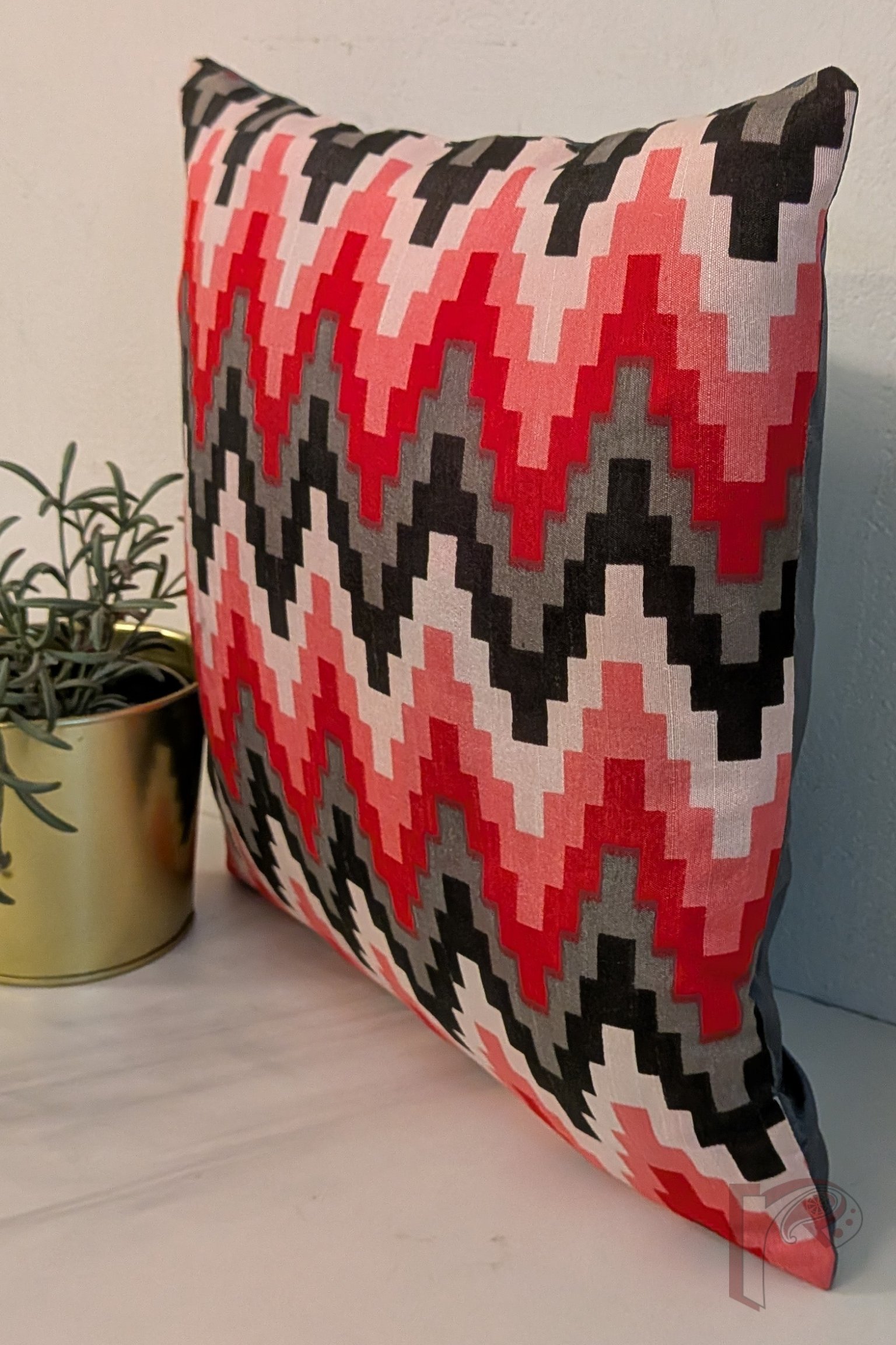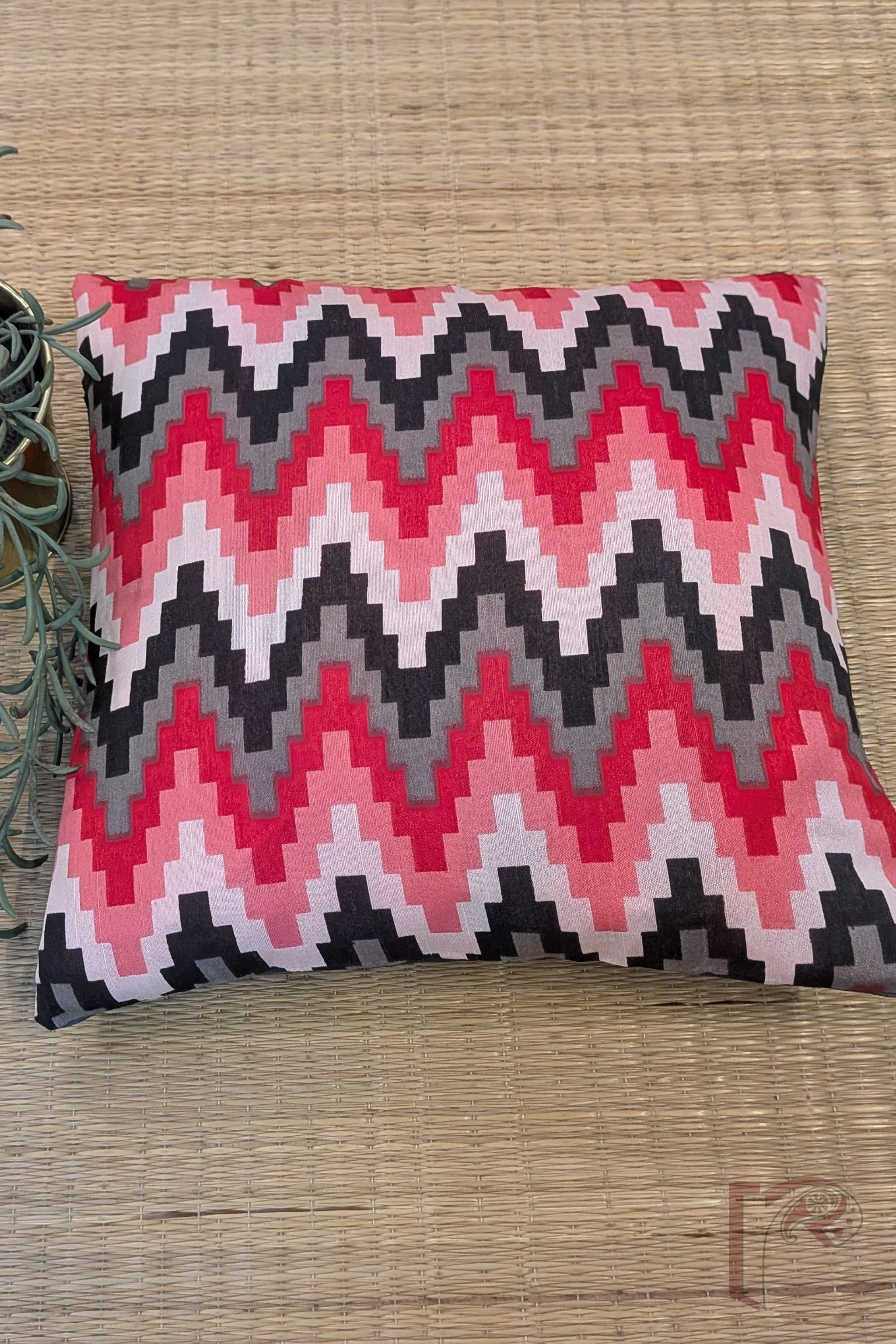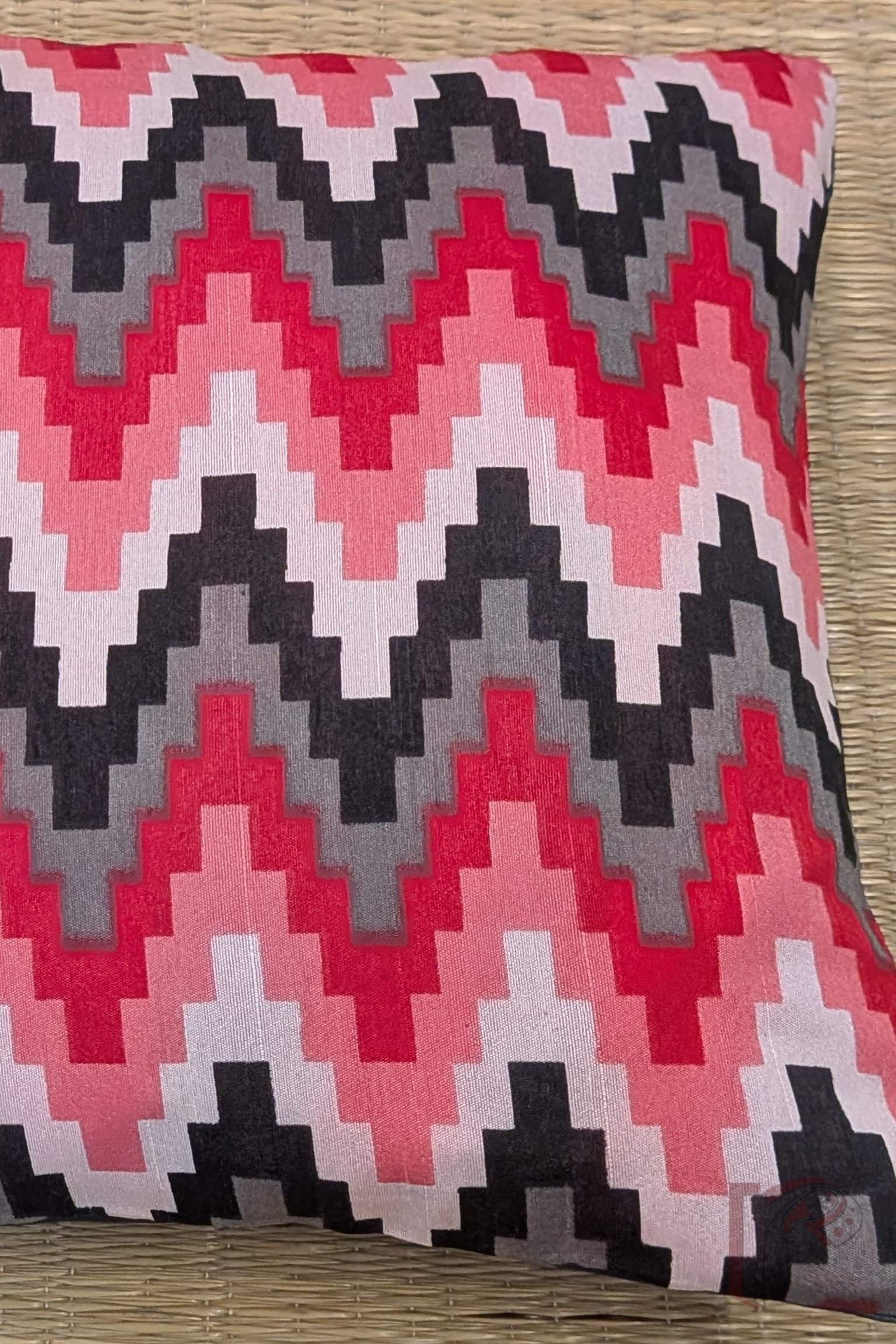 This chic cotton silk cushion cover features parallel zigzag patterns in shades of bright pink, light pink, and grey, creating a lively yet balanced design. The grey silk back complements the front, lending a subtle sophistication to the overall look. Crafted with care, this cushion cover blends modern abstract aesthetics with the soft sheen of silk, making it an eye-catching addition to any sofa or lounge setup. Its vibrant tones and contemporary weave bring warmth, elegance, and personality to your living space.