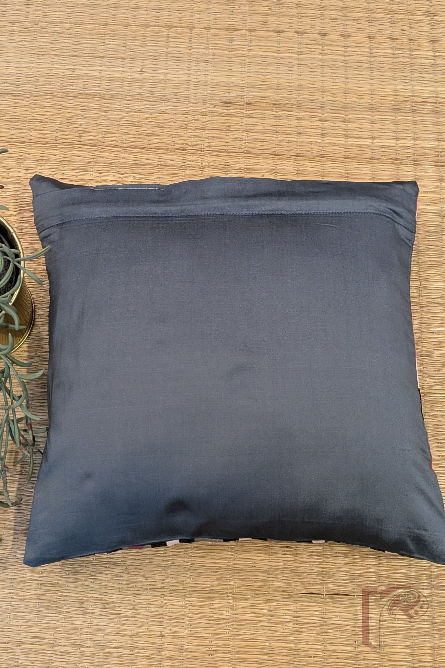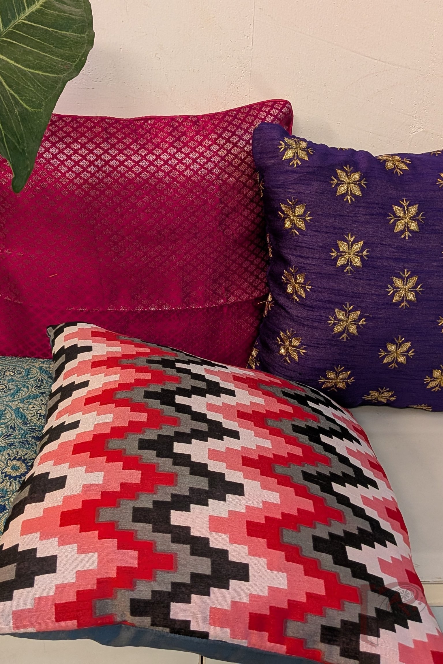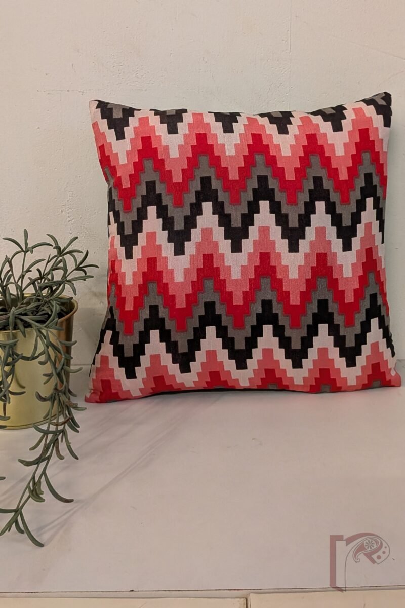 This chic cotton silk cushion cover features parallel zigzag patterns in shades of bright pink, light pink, and grey, creating a lively yet balanced design. The grey silk back complements the front, lending a subtle sophistication to the overall look. Crafted with care, this cushion cover blends modern abstract aesthetics with the soft sheen of silk, making it an eye-catching addition to any sofa or lounge setup. Its vibrant tones and contemporary weave bring warmth, elegance, and personality to your living space.