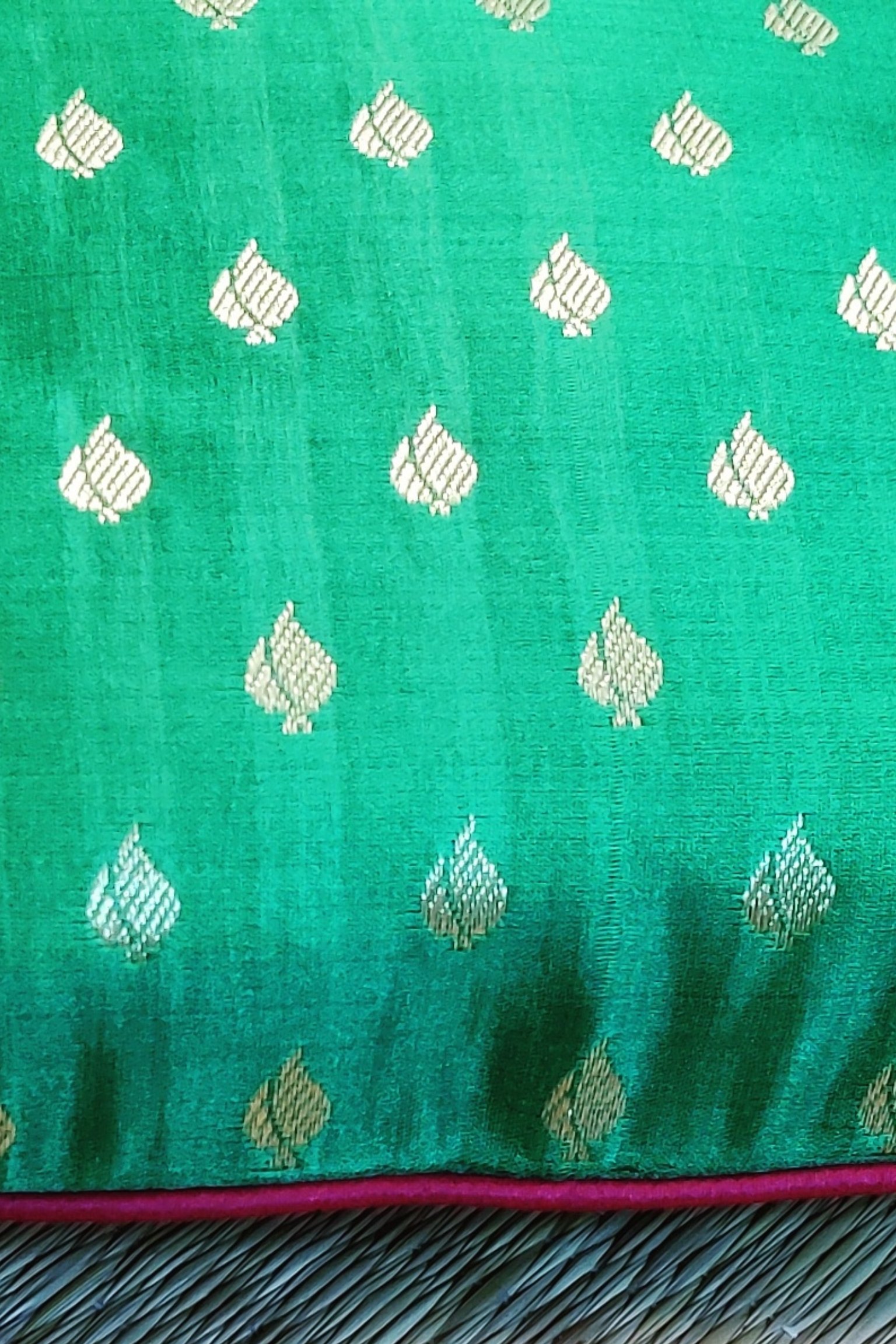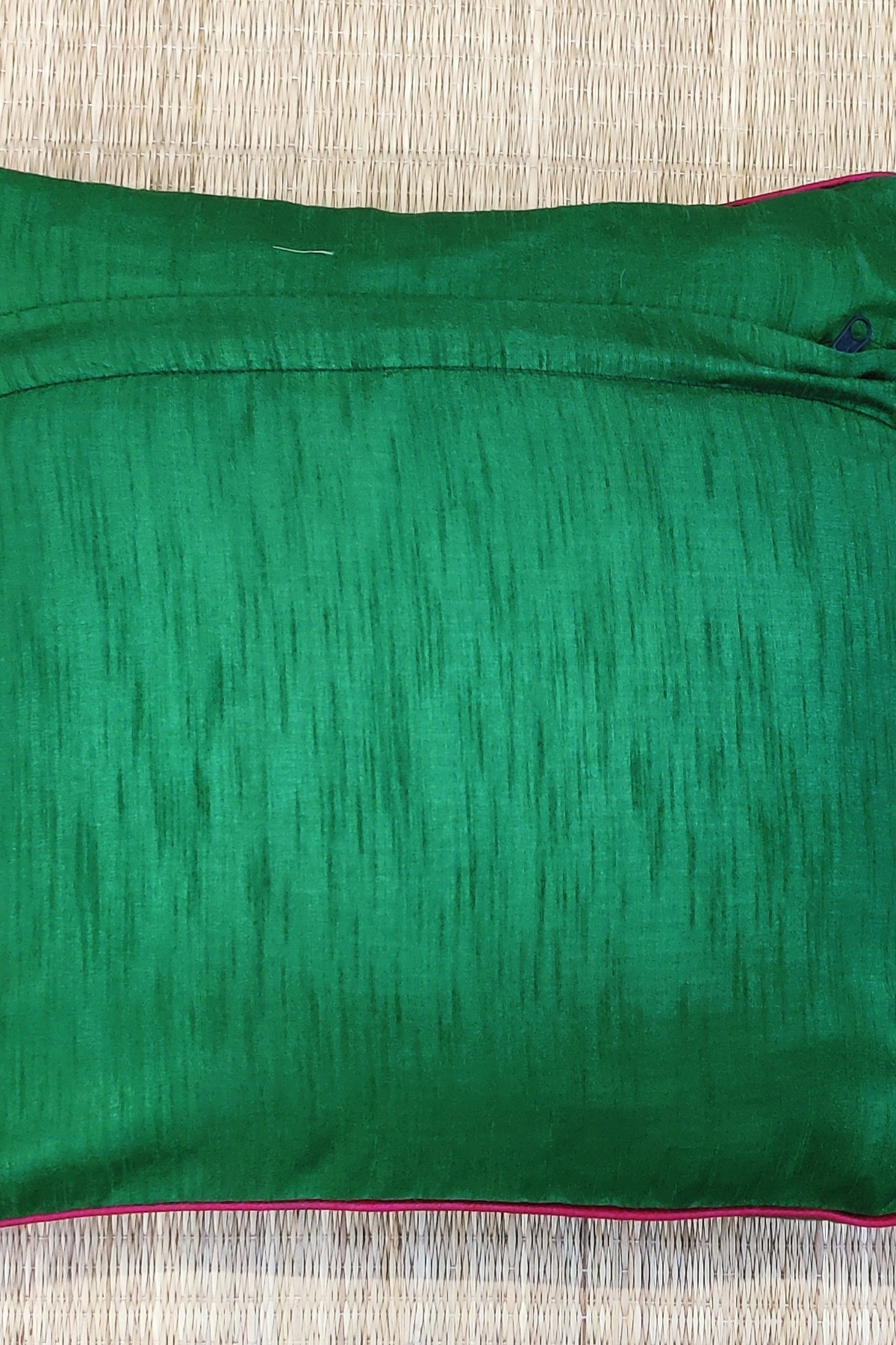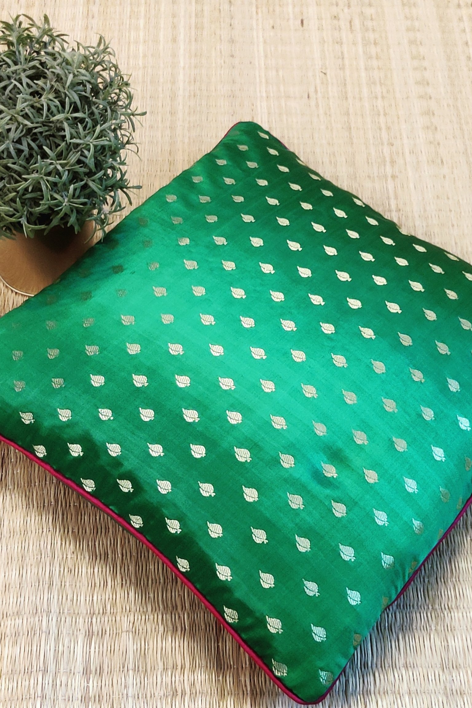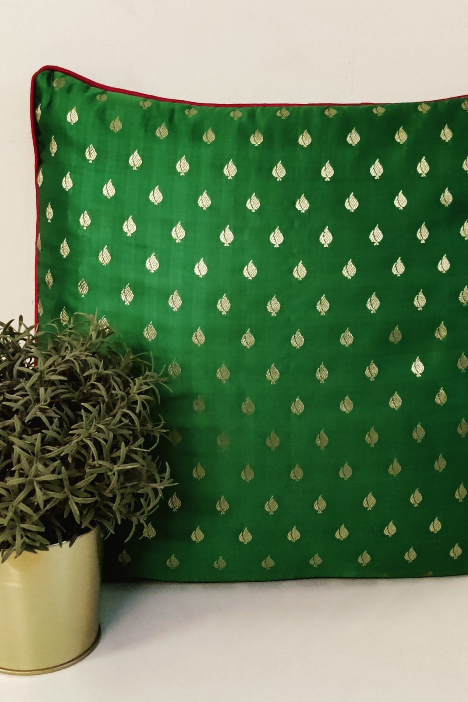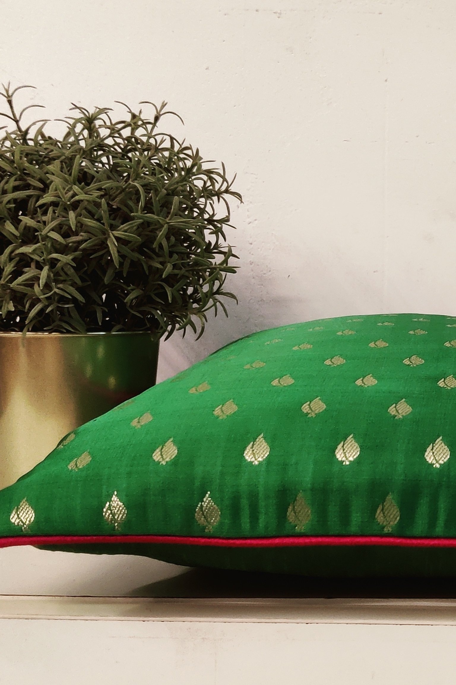 Elevate your decor with this dark green satin Banarasi cushion cover, featuring delicate gold leaf motifs on the front. Complemented by a dark green raw silk back and accented with a striking hot pink piping, it’s a statement of timeless elegance and modern flair.