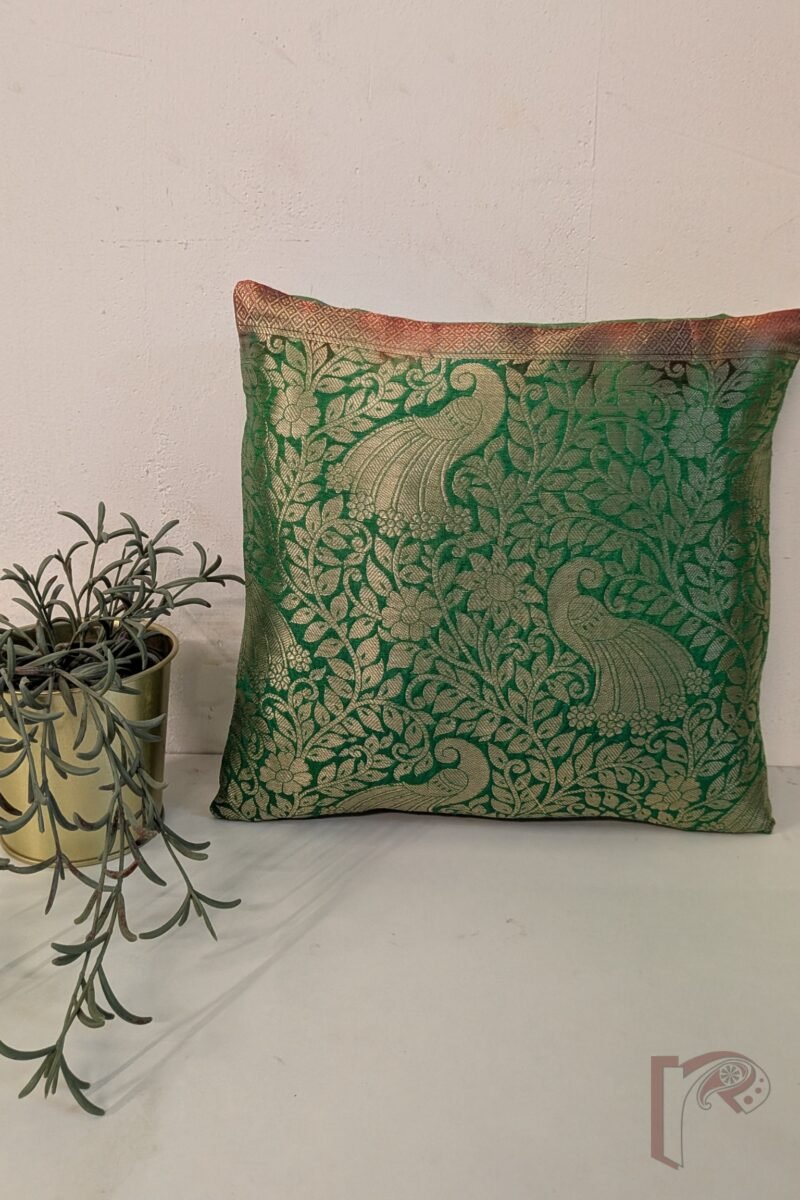 Cozy Cushion – Green Banarasi Silk with Gold Peacock & Floral Motif Cushion Cover 12″ x 12″