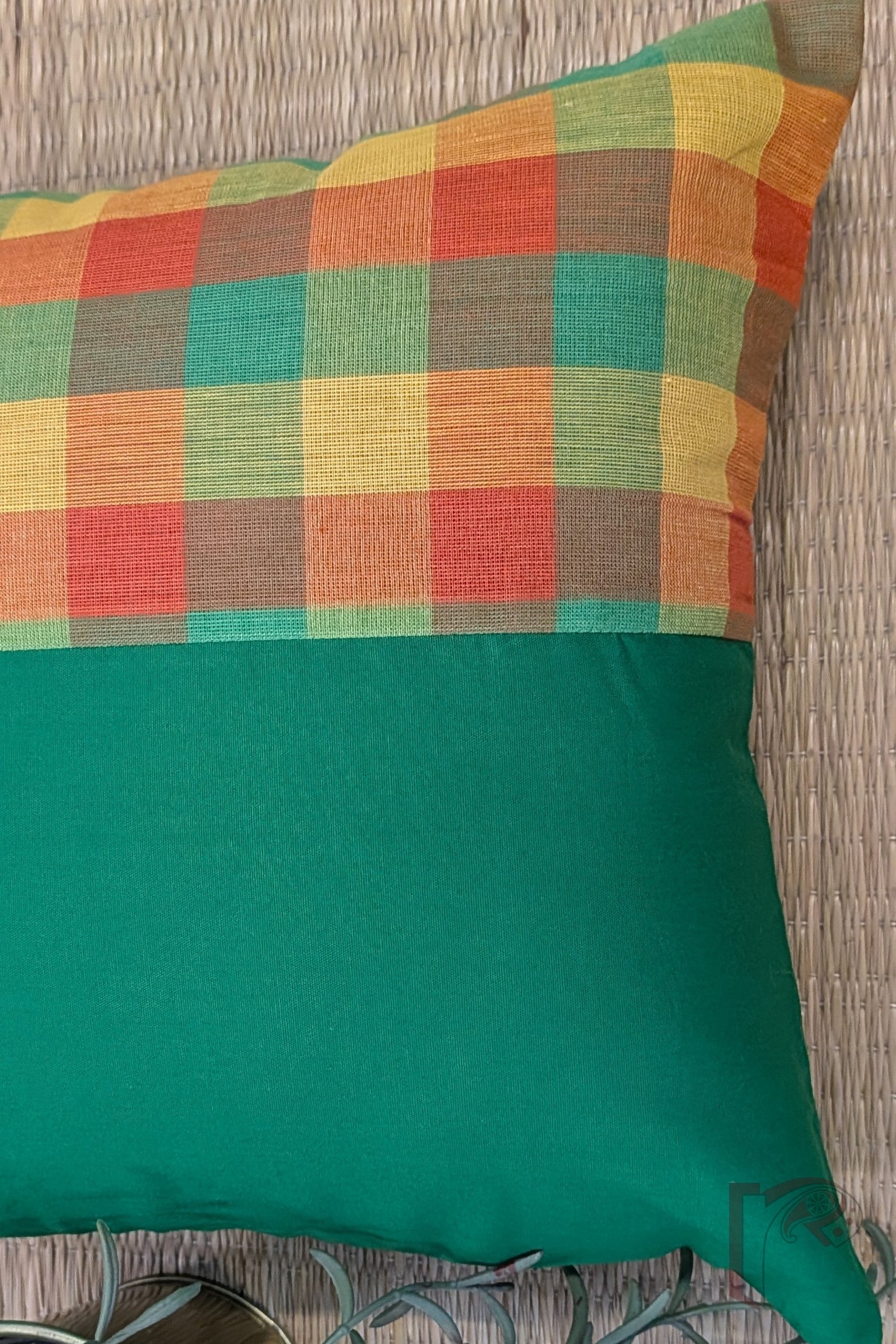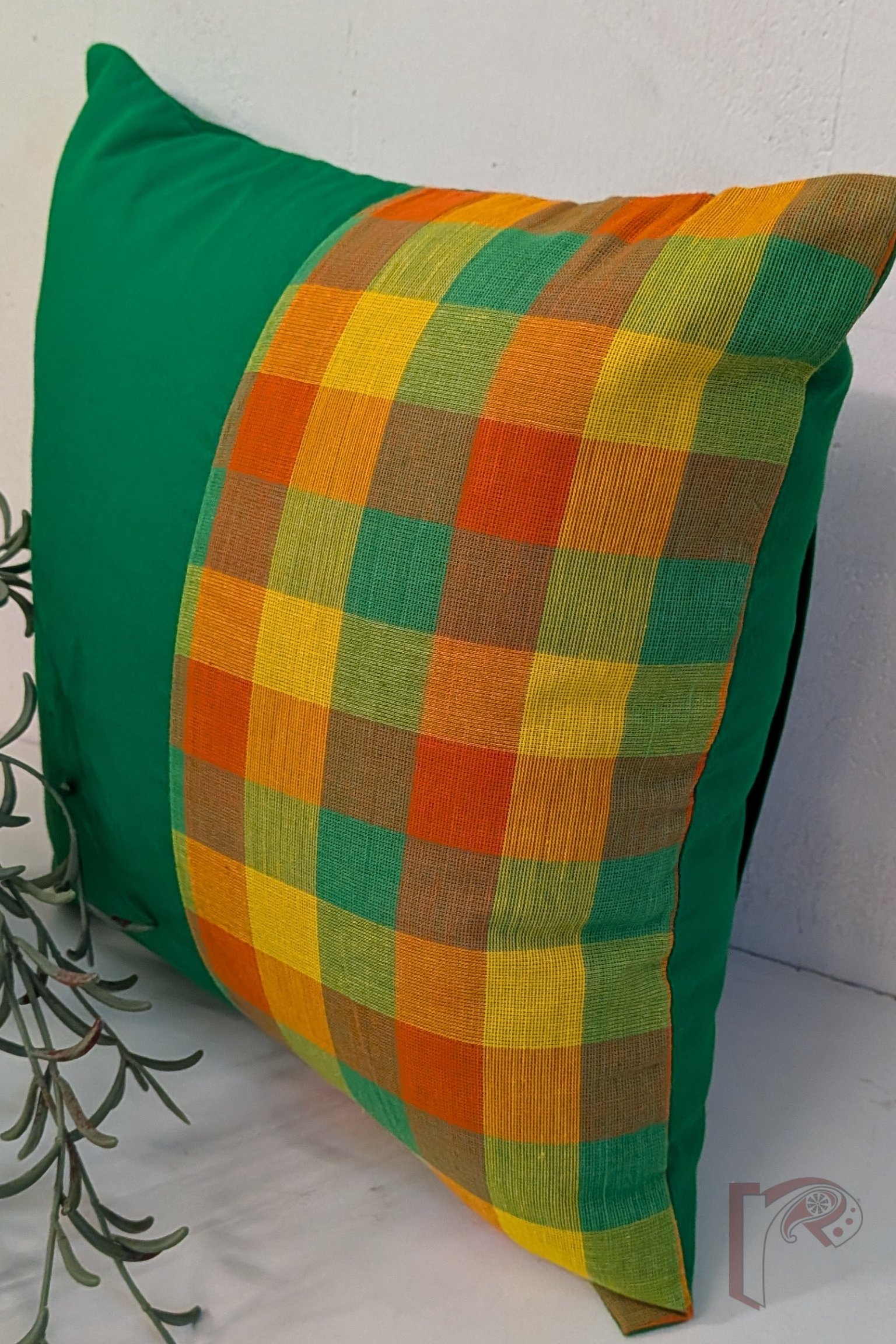This Green Cotton Cushion Cover showcases a lively box-patterned Mangalgiri panel in orange and yellow checks, creating a vibrant and structured design. The rich contrast between the solid green cotton and the bright check pattern adds visual interest and a handcrafted appeal. The plain emerald green cotton back ensures a polished and comfortable finish. Crafted from soft, breathable cotton, this cushion cover combines heritage handloom weaving, cheerful colors, and modern design, making it a perfect accent for sofas, chairs, or cozy corners in your home.